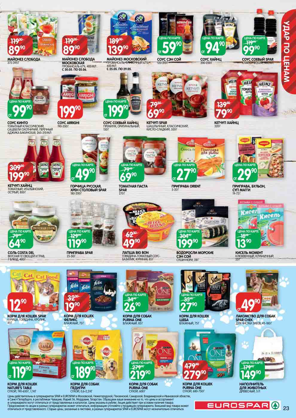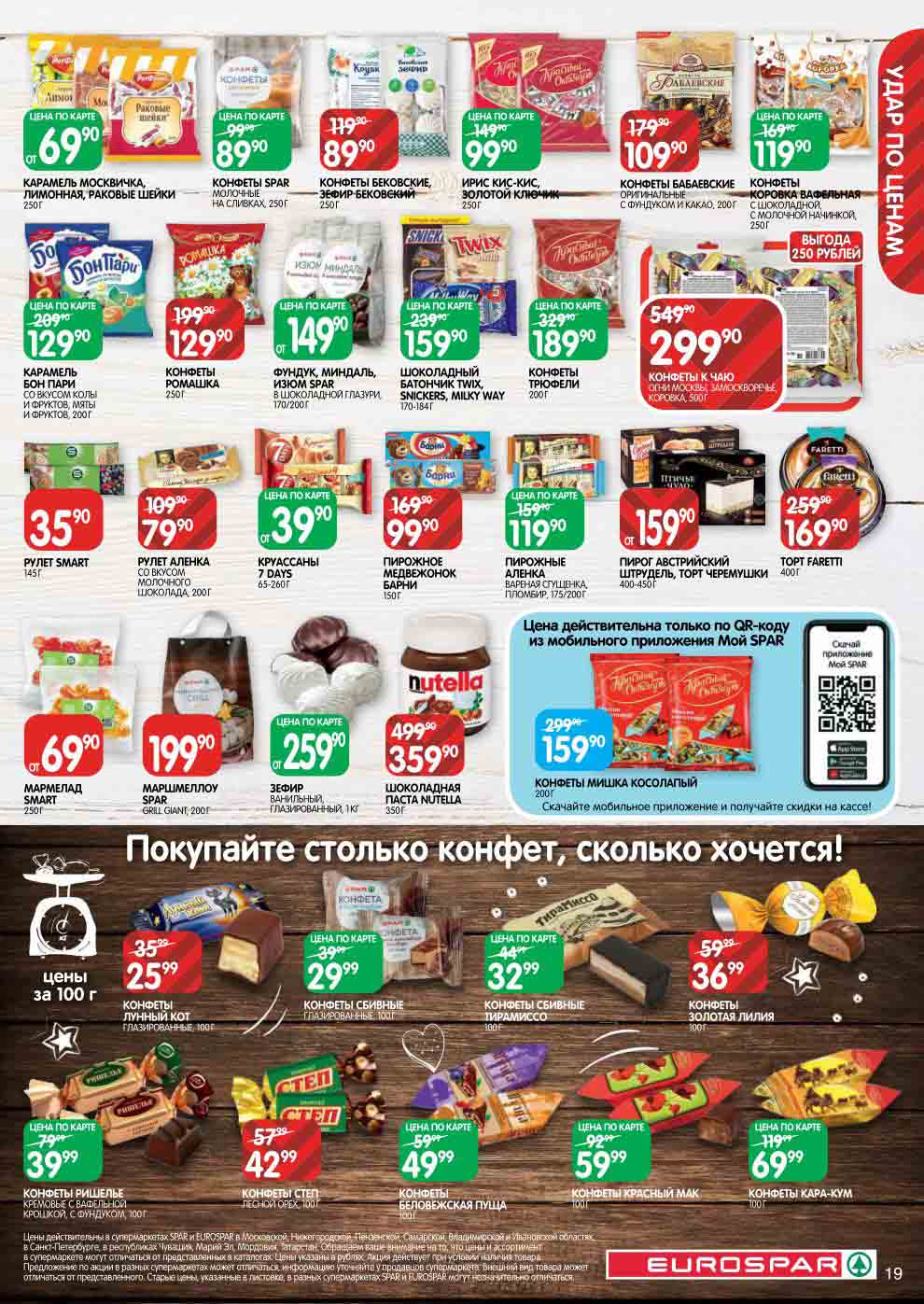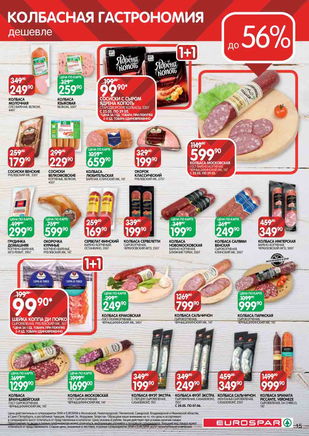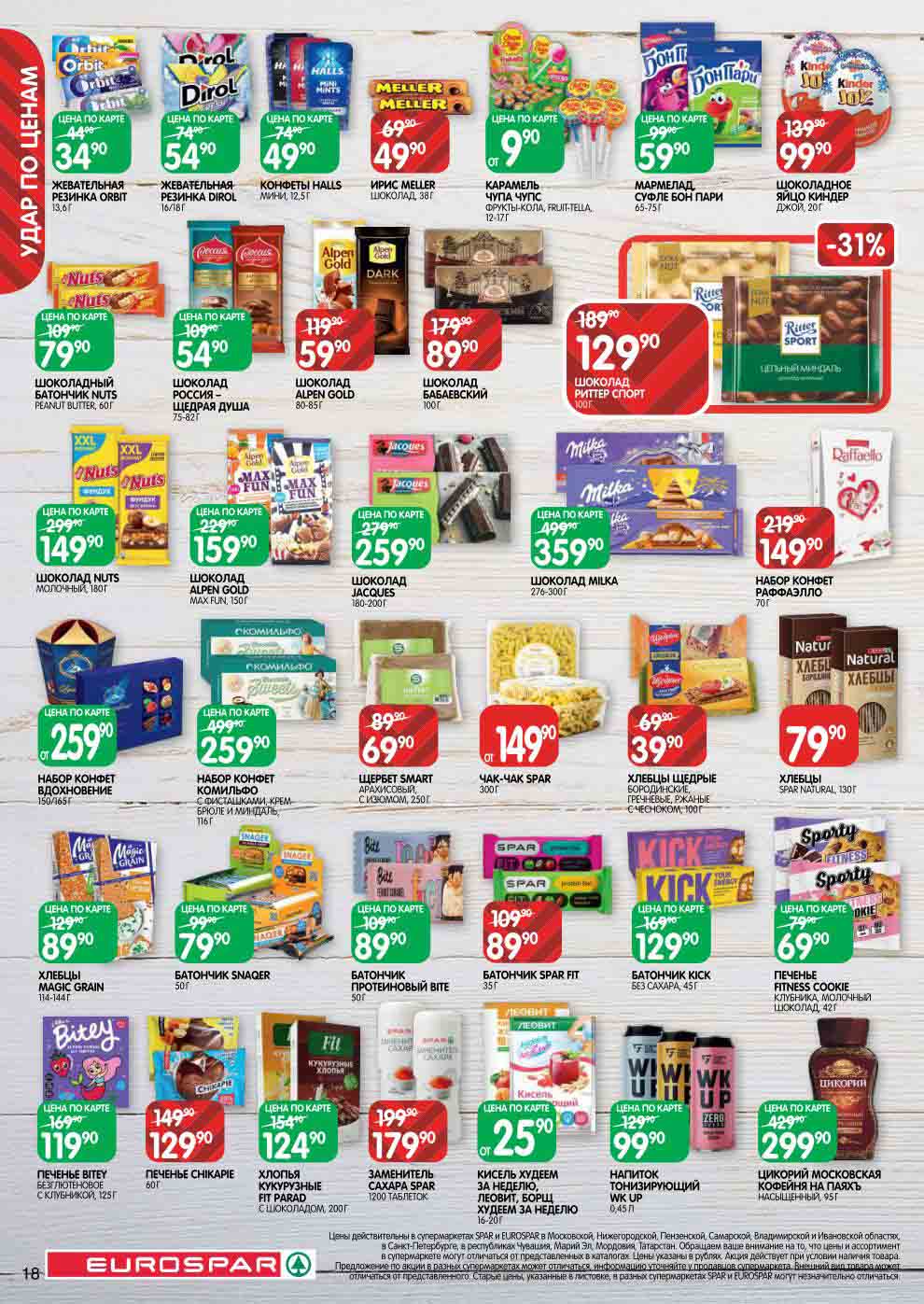 На страницах каталога ЕВРОСПАР вы найдете все свои любимые товары, которые сейчас предлагаются в супермаркете. Не пропустите последние специальные предложения и сэкономьте на покупках. Цены по акции ЕвроСпар действуют в городах: Москва, Химки, Красногорск, Одинцово, Краснознаменск, Кубинка, Климовск, Жуковский, Видное и других населенных пунктах Московского региона.