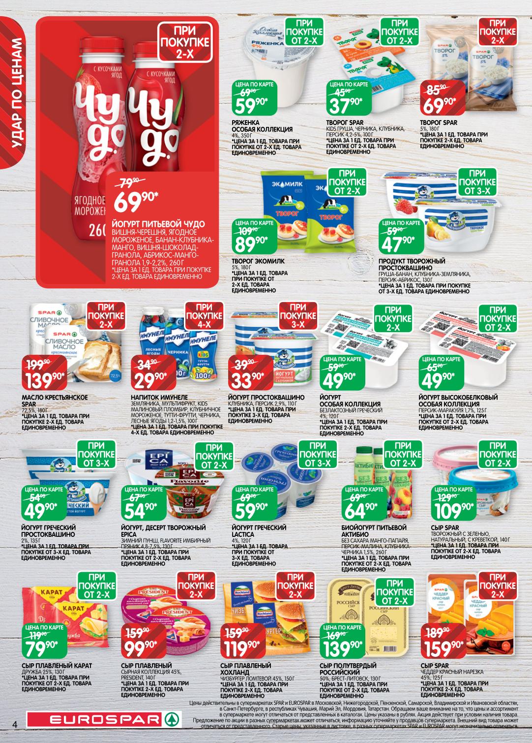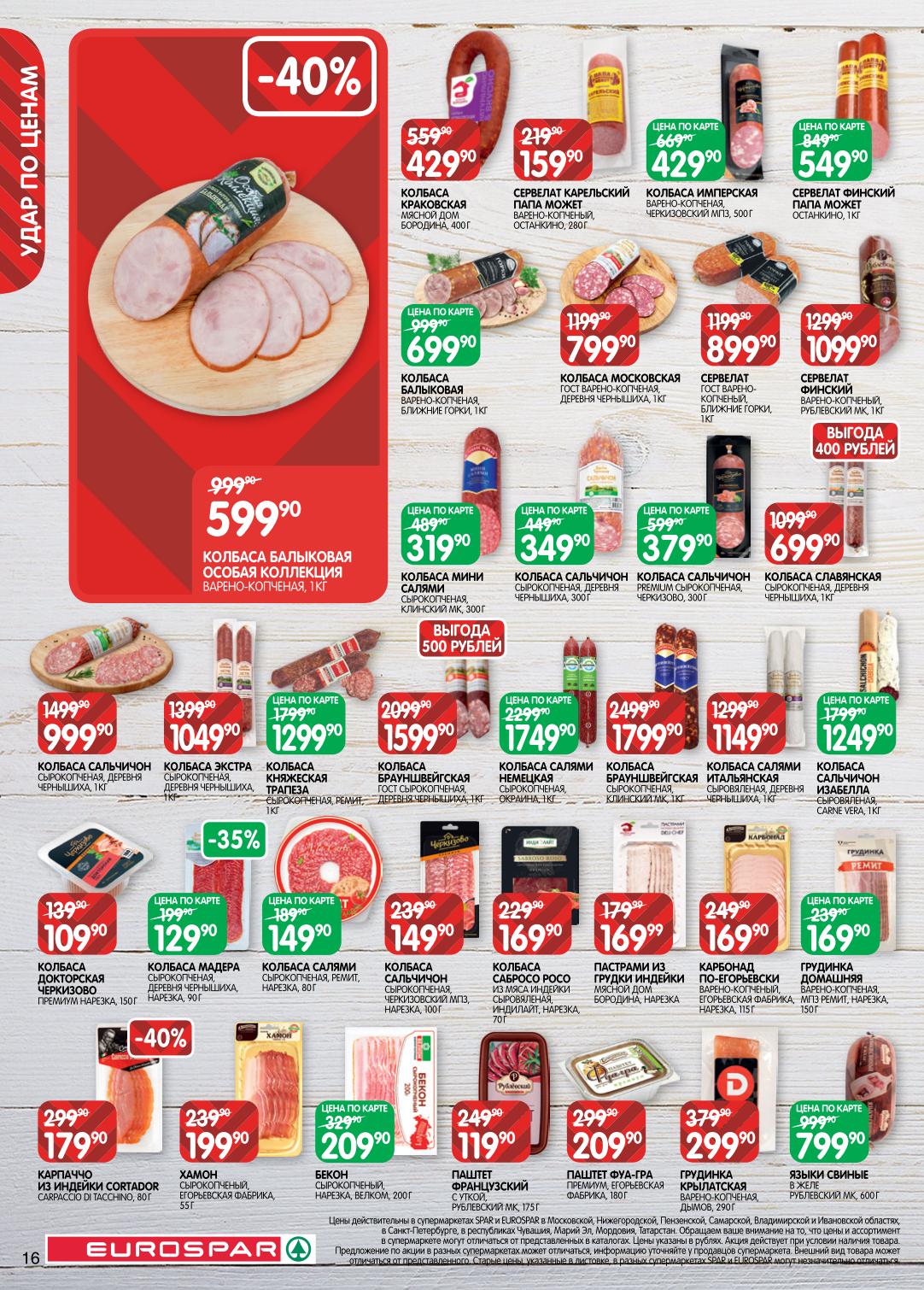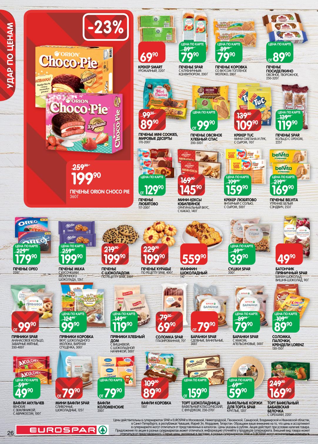 На страницах каталога ЕВРОСПАР вы найдете все свои любимые товары, которые сейчас предлагаются в супермаркете. Не пропустите последние специальные предложения и сэкономьте на покупках. Цены по акции ЕвроСпар действуют в городах: Москва, Химки, Красногорск, Одинцово, Краснознаменск, Кубинка, Климовск, Жуковский, Видное и других населенных пунктах Московского региона.