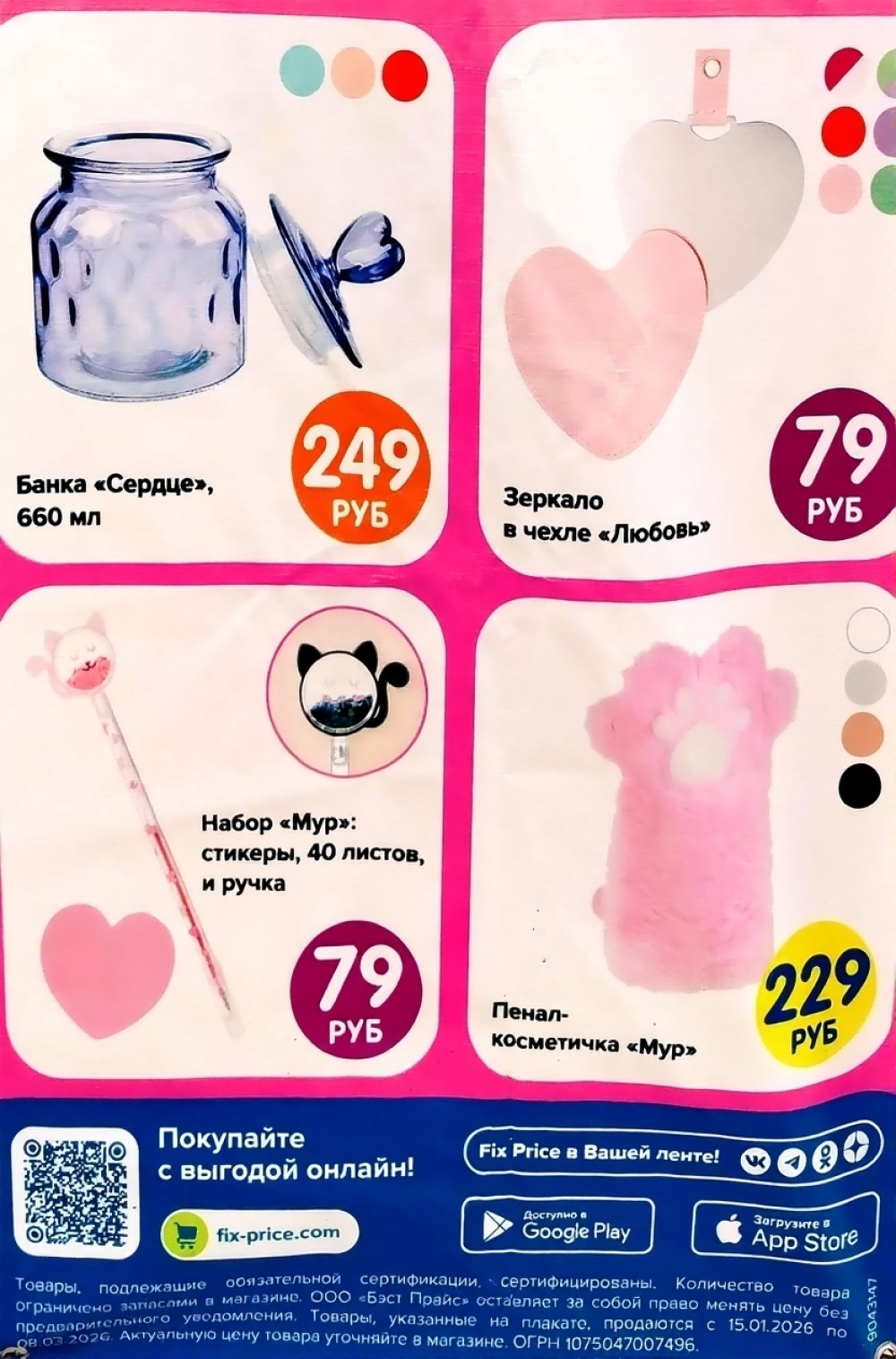 Подробную информацию об правилах, наличии товаров, адресах и скидках узнавайте в магазинахили по тел.: +7 (495) 902-50-00и на сайте: fix-price.com