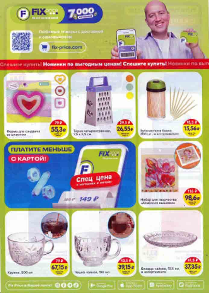 Смотрите еженедельный, новый каталог Fix Price и не переплачивайте. Fix Price — сеть супермаркетов товаров для дома реализует продукцию по сниженным фиксированным ценам. На полках магазина «Фикс Прайс» предлагаются продукты и напитки, косметика и бытовая химия, посуда, домашняя одежда, игрушки, подарки и сувениры, товары для праздников, декор и многое другое. А так же дополнительную выгоду предоставляет специальная карта лояльности.