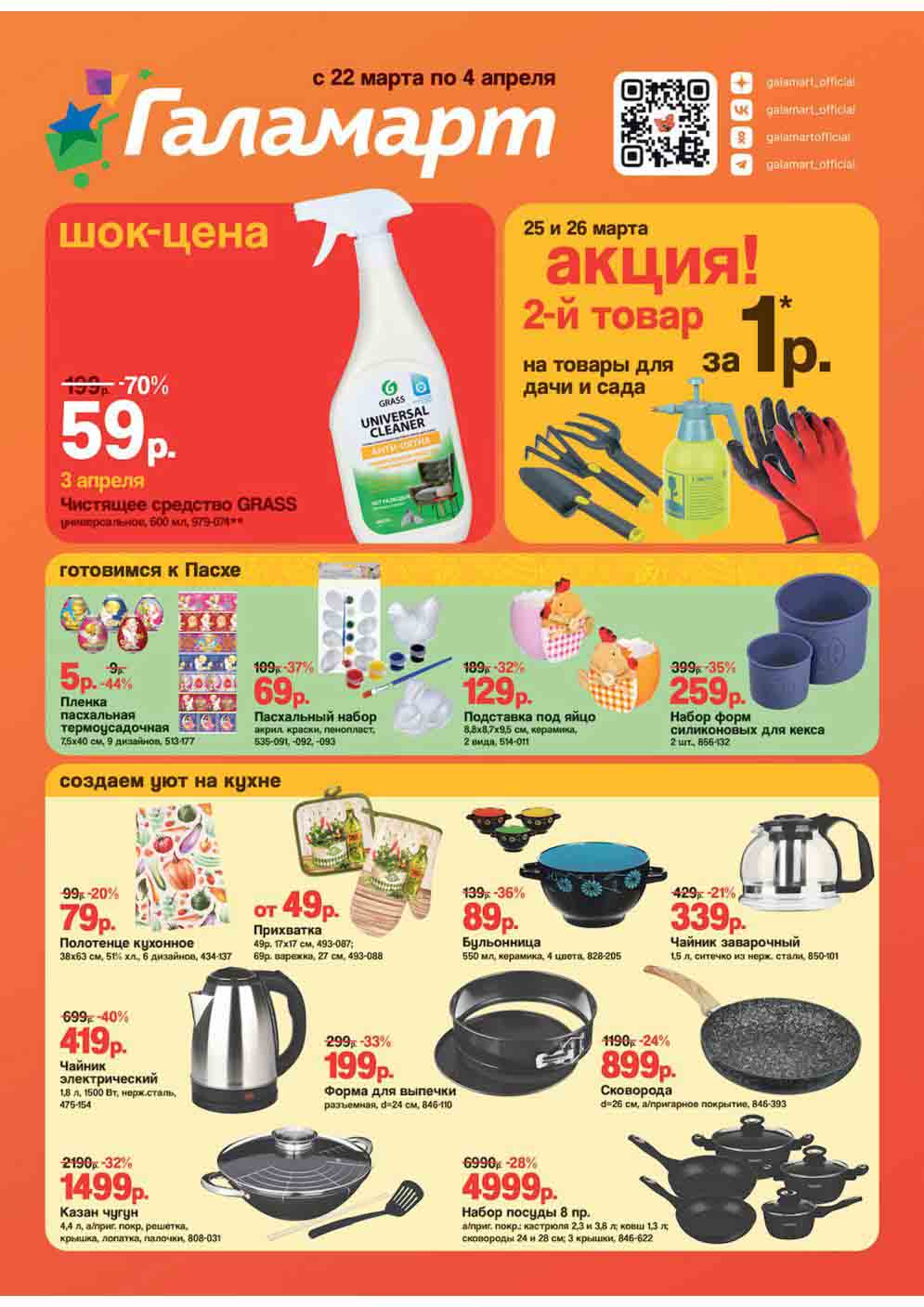 Сеть «Галамарт» это магазины формата «Хозтовары» и «Промтовары», и на его полках до 7 000 наименований товара: посуда, автотовары, бытовая химия, хозтовары, инструменты и многое другое. Акции в магазинах «Галамарт» проводятся ежедневно, а фирменная особенность магазина в сезонных распродажах. Цены по акции Галамарт действуют в городах: Москва, Балашиха, Химки, Подольск, Королев, Мытищи, Люберцы, Электросталь, Коломна, Одинцово, Железнодорожный, Серпухов, Орехово-Зуево, Красногорск, Щелково, Сергиев Посад, Пушкино, Жуковский, Ногинск, Раменское и многих других населенных пунктах Московского региона.
