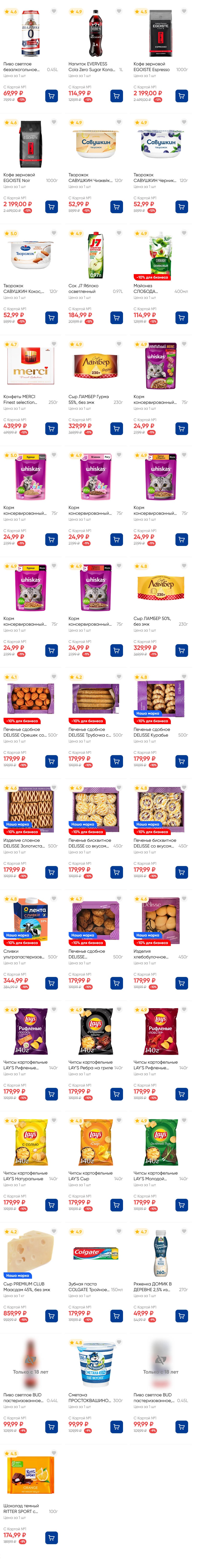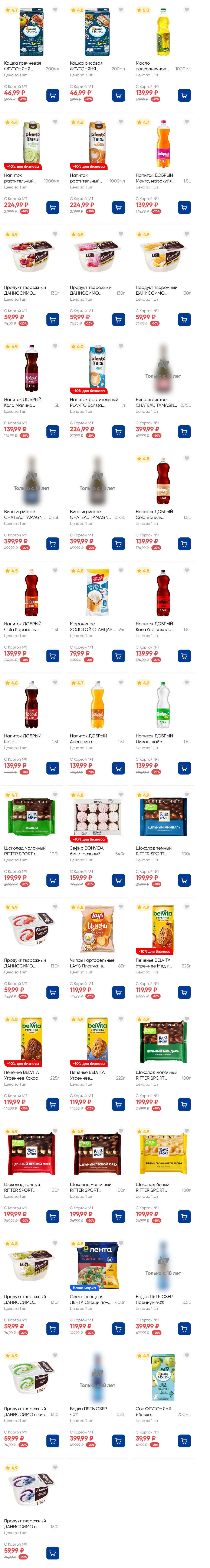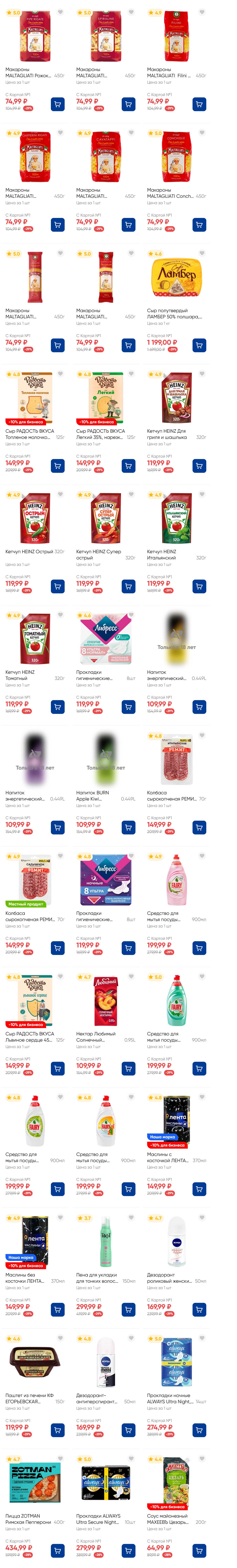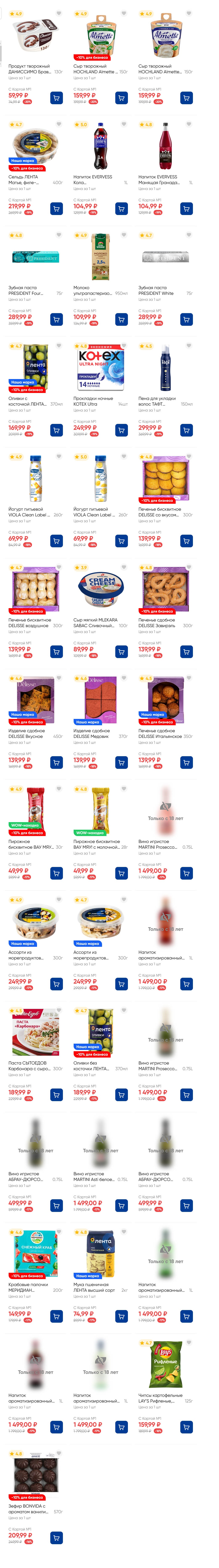 На страницах каталога ЛЕНТА вы найдете все свои любимые товары, которые сейчас предлагаются по акции. Скидки действуют в указанные сроки при покупках с Картой №1, при наличии товара Количество товара ограничено. Внешний вид товаров может отличаться от представленных. В Ленте пенсионерам скидка 10%* каждый день 9:00–13:00 (*Скидка не распространяется подарочные карты, лотерейные билеты, товары марки «365 Дней».) Выгода предоставляется на кассе при предъявлении необходимых документов и карты лояльности. Цены по акции Лента действуют в городах: Москва, Балашиха, Химки, Подольск, Королев, Мытищи, Люберцы, Электросталь, Коломна, Одинцово, Железнодорожный, Серпухов, Орехово-Зуево, Красногорск, Щелково, Сергиев Посад, Пушкино, Жуковский, Ногинск, Раменское и многих других населенных пунктах Московского региона.