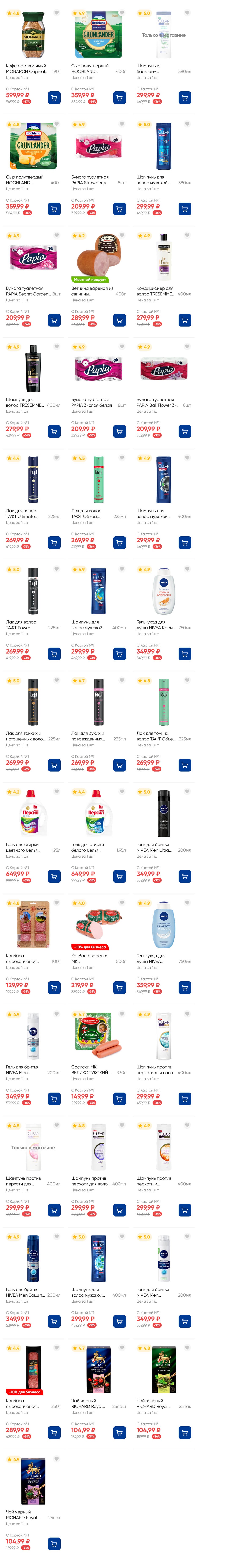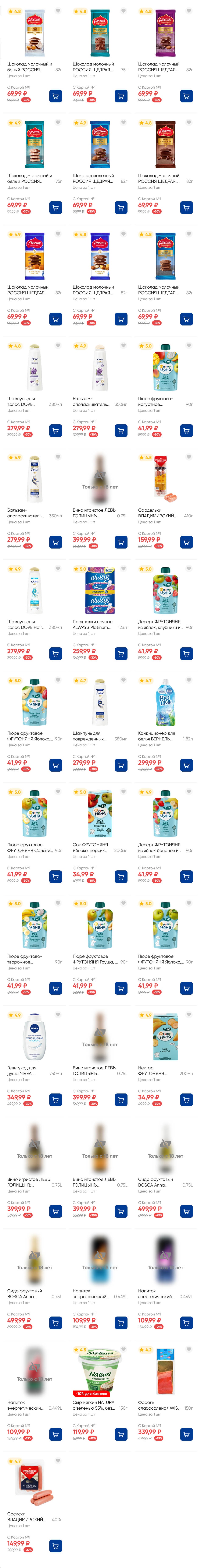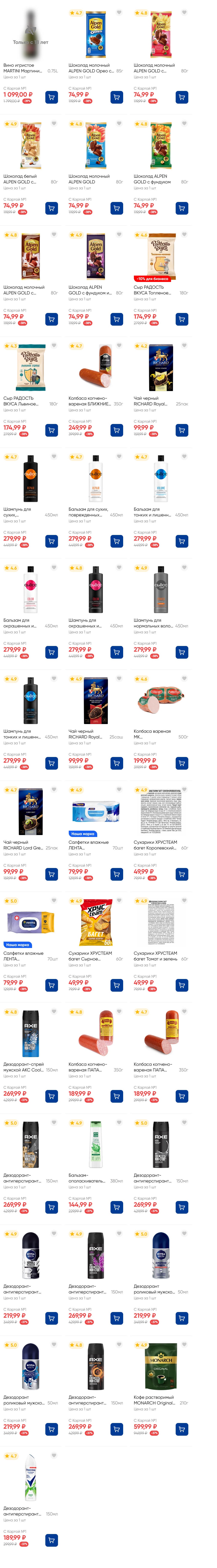 На страницах каталога ЛЕНТА вы найдете все свои любимые товары, которые сейчас предлагаются по акции. Скидки действуют в указанные сроки при покупках с Картой №1, при наличии товара Количество товара ограничено. Внешний вид товаров может отличаться от представленных. В Ленте пенсионерам скидка 10%* каждый день 9:00–13:00 (*Скидка не распространяется подарочные карты, лотерейные билеты, товары марки «365 Дней».) Выгода предоставляется на кассе при предъявлении необходимых документов и карты лояльности. Цены по акции Лента действуют в городах: Москва, Балашиха, Химки, Подольск, Королев, Мытищи, Люберцы, Электросталь, Коломна, Одинцово, Железнодорожный, Серпухов, Орехово-Зуево, Красногорск, Щелково, Сергиев Посад, Пушкино, Жуковский, Ногинск, Раменское и многих других населенных пунктах Московского региона.