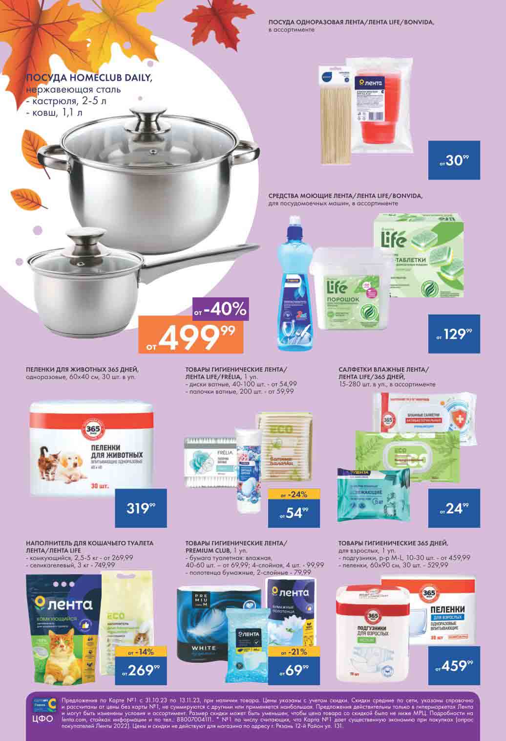 На страницах каталога ЛЕНТА вы найдете все свои любимые товары, которые сейчас предлагаются по акции. Скидки действуют в указанные сроки при покупках с Картой №1, при наличии товара Количество товара ограничено. Внешний вид товаров может отличаться от представленных. В Ленте пенсионерам скидка 10%* каждый день 9:00–13:00 (*Скидка не распространяется подарочные карты, лотерейные билеты, товары марки «365 Дней».) Выгода предоставляется на кассе при предъявлении необходимых документов и карты лояльности. Цены по акции Лента действуют в городах: Москва, Балашиха, Химки, Подольск, Королев, Мытищи, Люберцы, Электросталь, Коломна, Одинцово, Железнодорожный, Серпухов, Орехово-Зуево, Красногорск, Щелково, Сергиев Посад, Пушкино, Жуковский, Ногинск, Раменское и многих других населенных пунктах Московского региона.