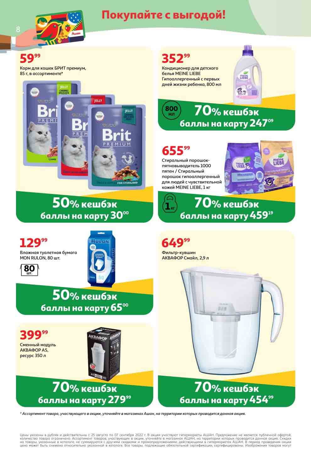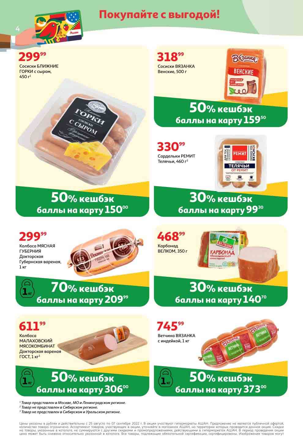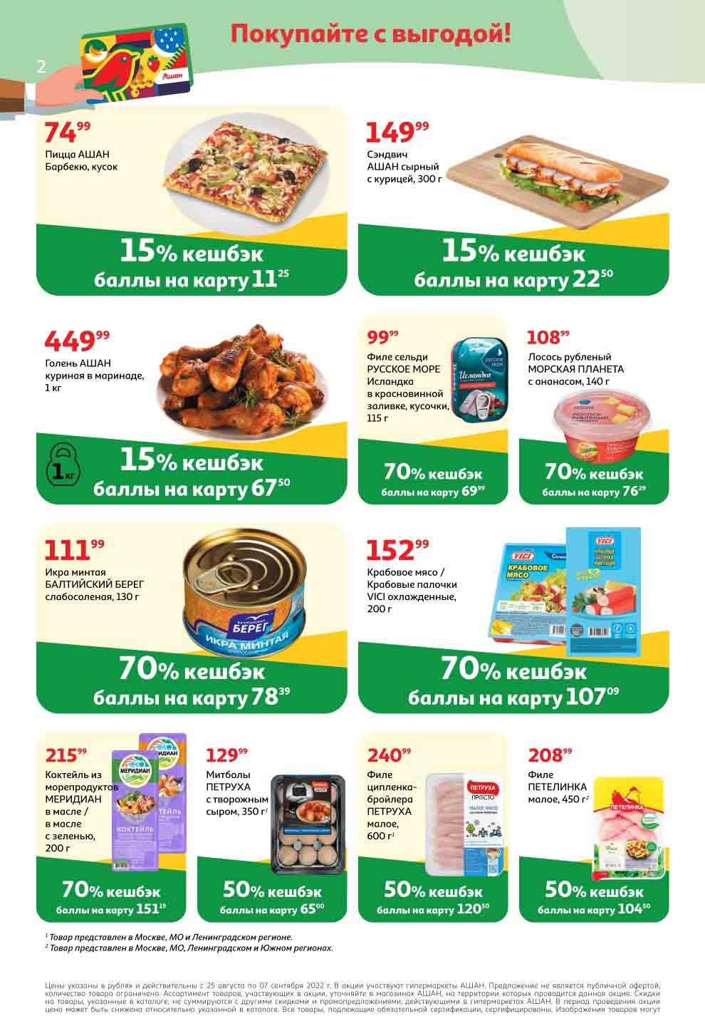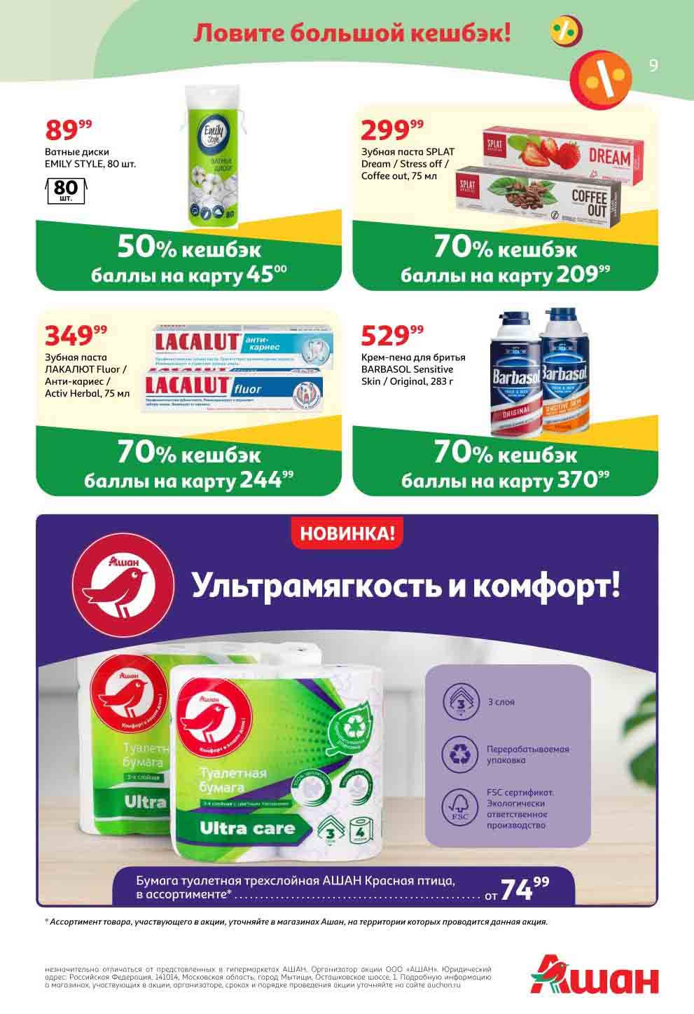 На страницах каталога Ашан вы найдете все свои любимые продукты, которые сейчас предлагаются в супермаркете. Не пропустите последние специальные предложения и сэкономьте на покупках. Предложение действительно при наличии товара на прилавках. Скидки на товары, указанные в каталоге, не суммируются с другими скидками. Изображения товаров могут незначительно отличаться от представленных на полках. Цены по акции Ашан действуют в городах: Москва. Балашиха. Химки. Подольск. Королев. Мытищи. Люберцы. Электросталь. Коломна. Одинцово. Железнодорожный, Серпухов, Орехово-Зуево. Красногорск, Щелково, Сергиев Посад, Пушкино. Жуковский, Ногинск, Раменское и многих других населенных пунктах Московского региона.