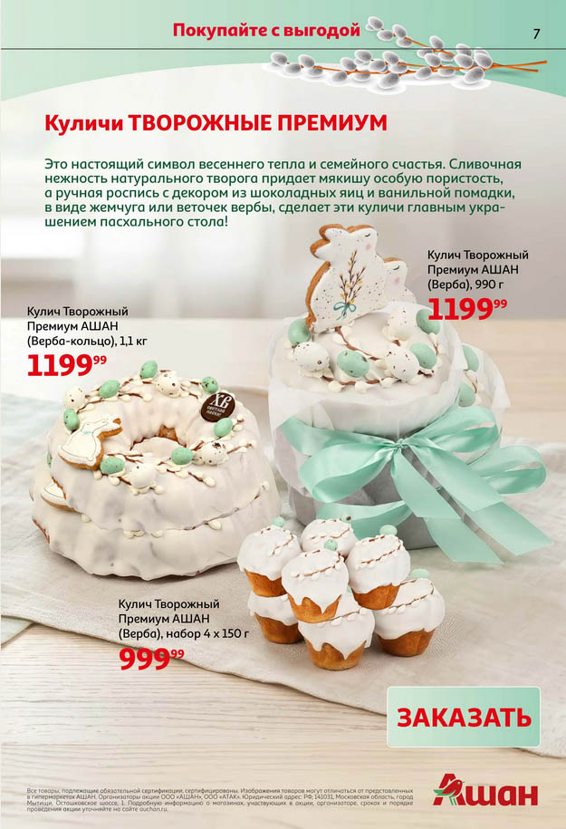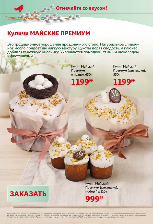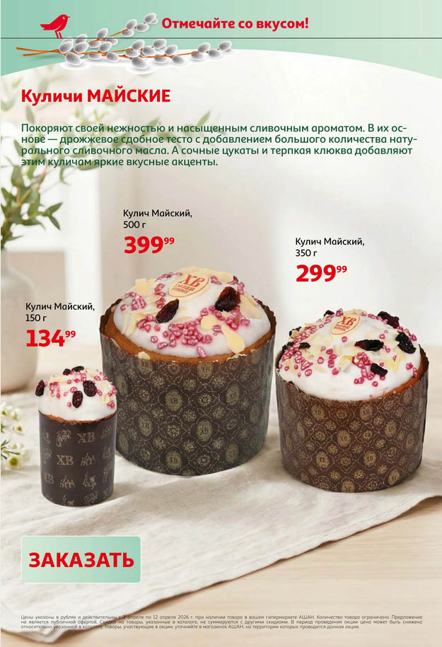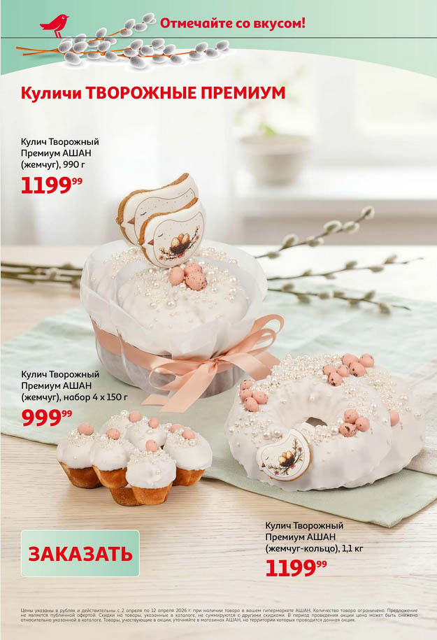 Оформите заказ кулича в Ашане в период действия акции до 12 апреля 2026 года включительно по специальным ценам.