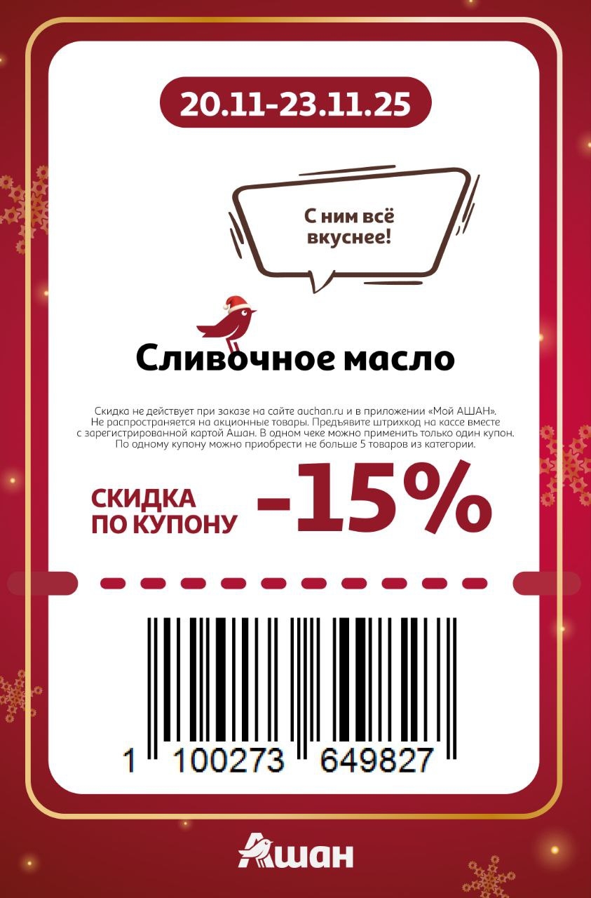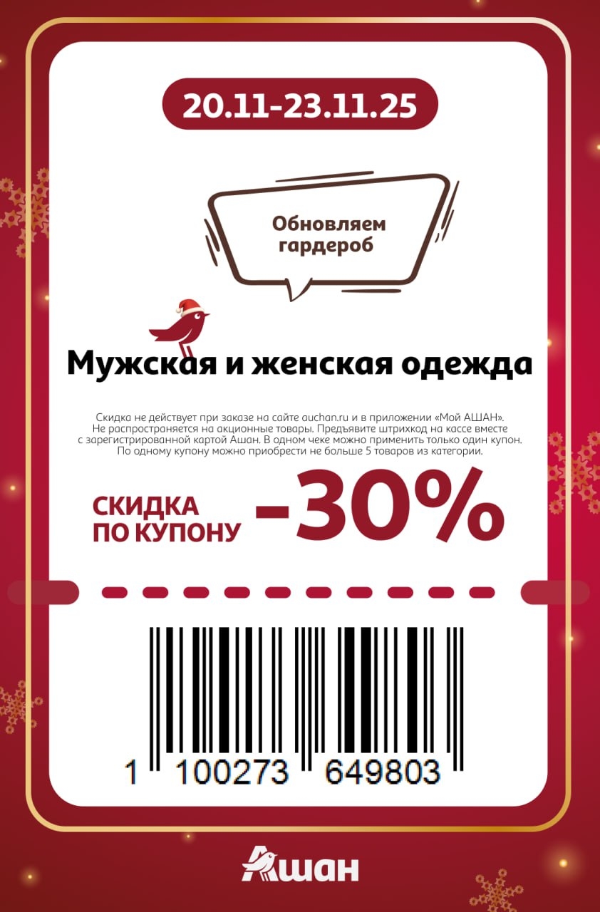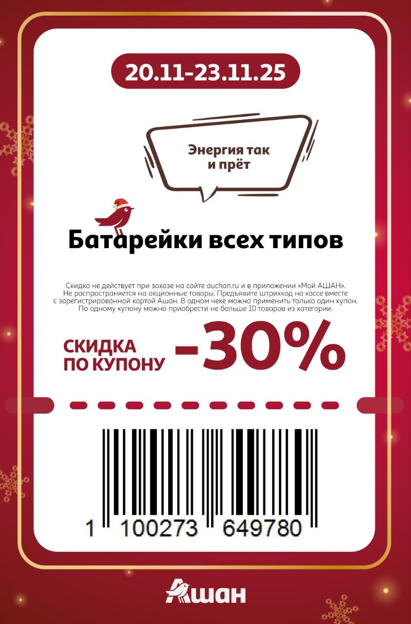 Представлены различные товары, которые предлагаются по выгодным ценам в магазинах Ашан по акции с 20 ноября — 23 ноября 2025 года. Наибольшая выгода — на электрогирлянды (30%), батарейки всех типов (30%), мужская и женская одежда (30%). Рекомендуем заранее спланировать покупки, чтобы максимально использовать чудо купоны.