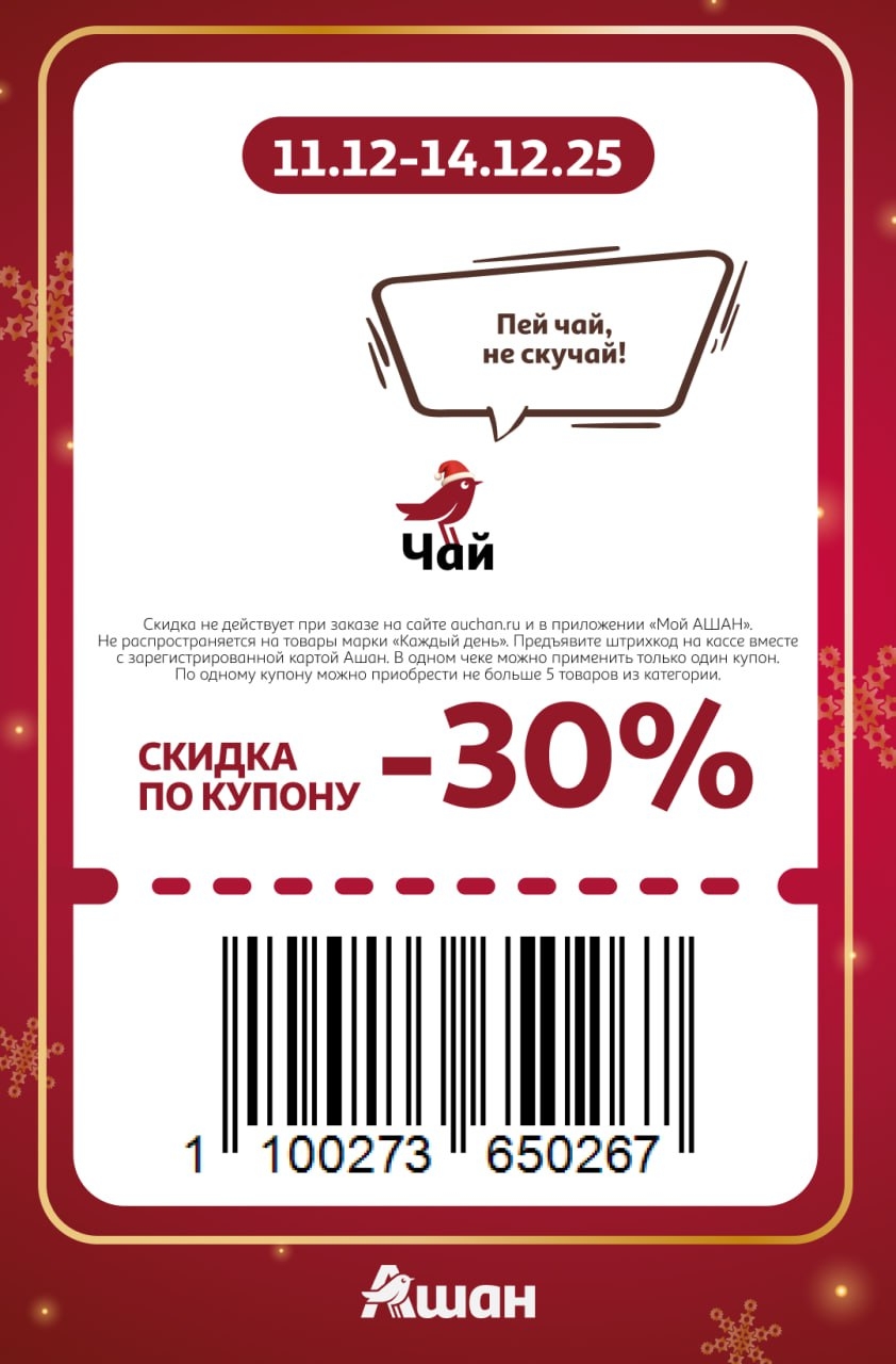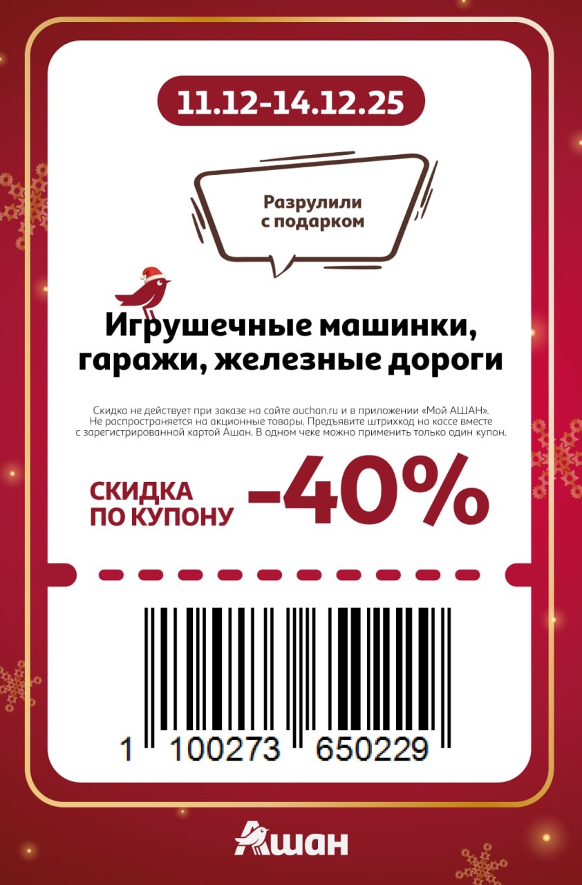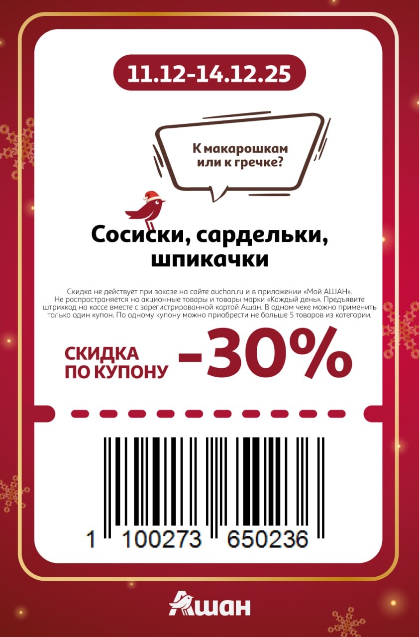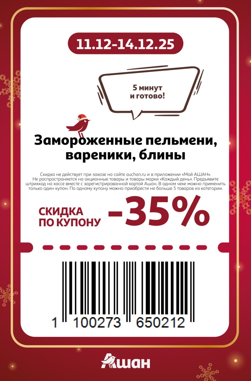 Представлены различные товары, которые предлагаются по выгодным ценам в магазинах Ашан по акции с 11 декабря — 14 декабря 2025 года. Наибольшая выгода — на игрушки (40%), календари (40%), пельмени, варенники (35%). Рекомендуем заранее спланировать покупки, чтобы максимально использовать чудо купоны.