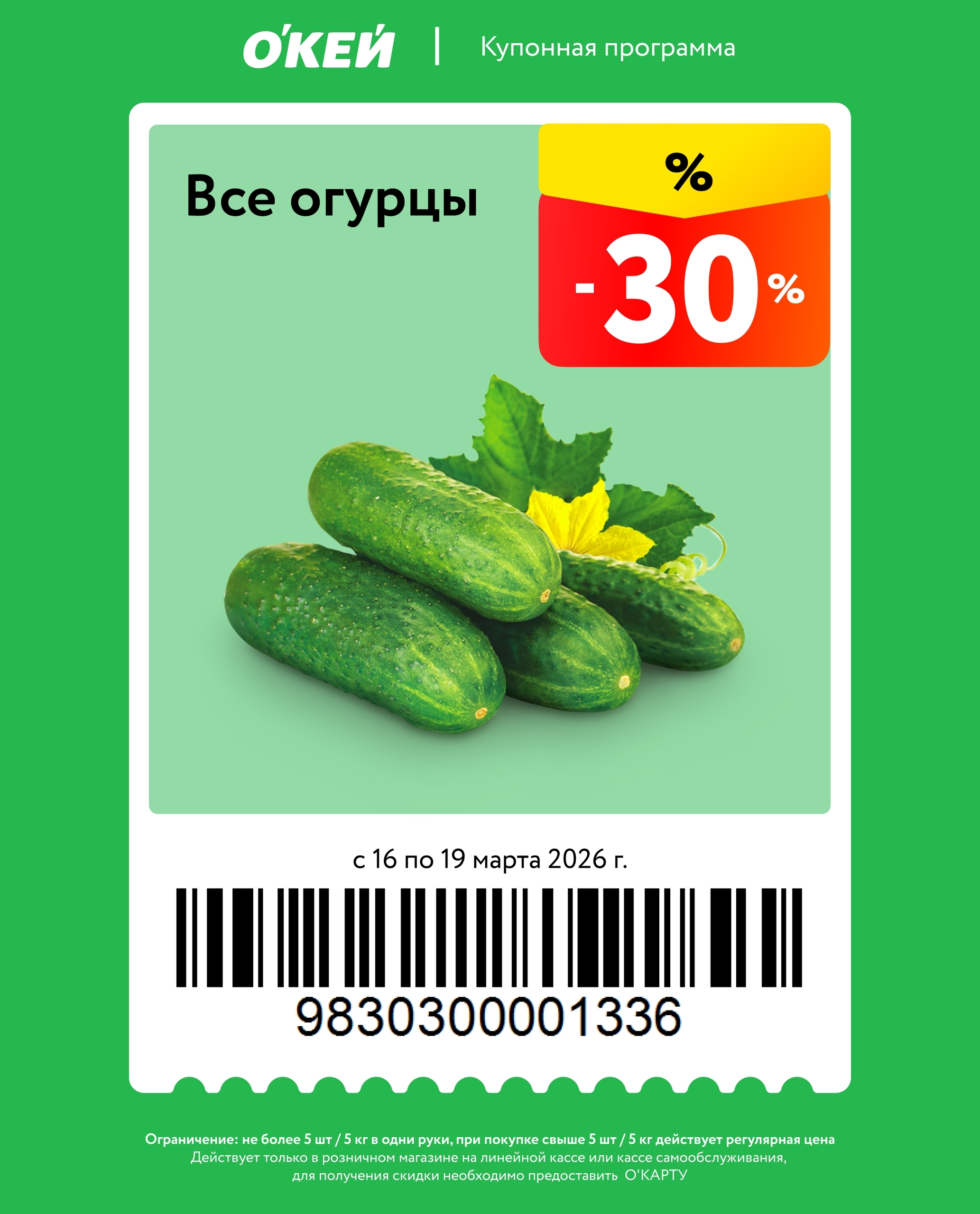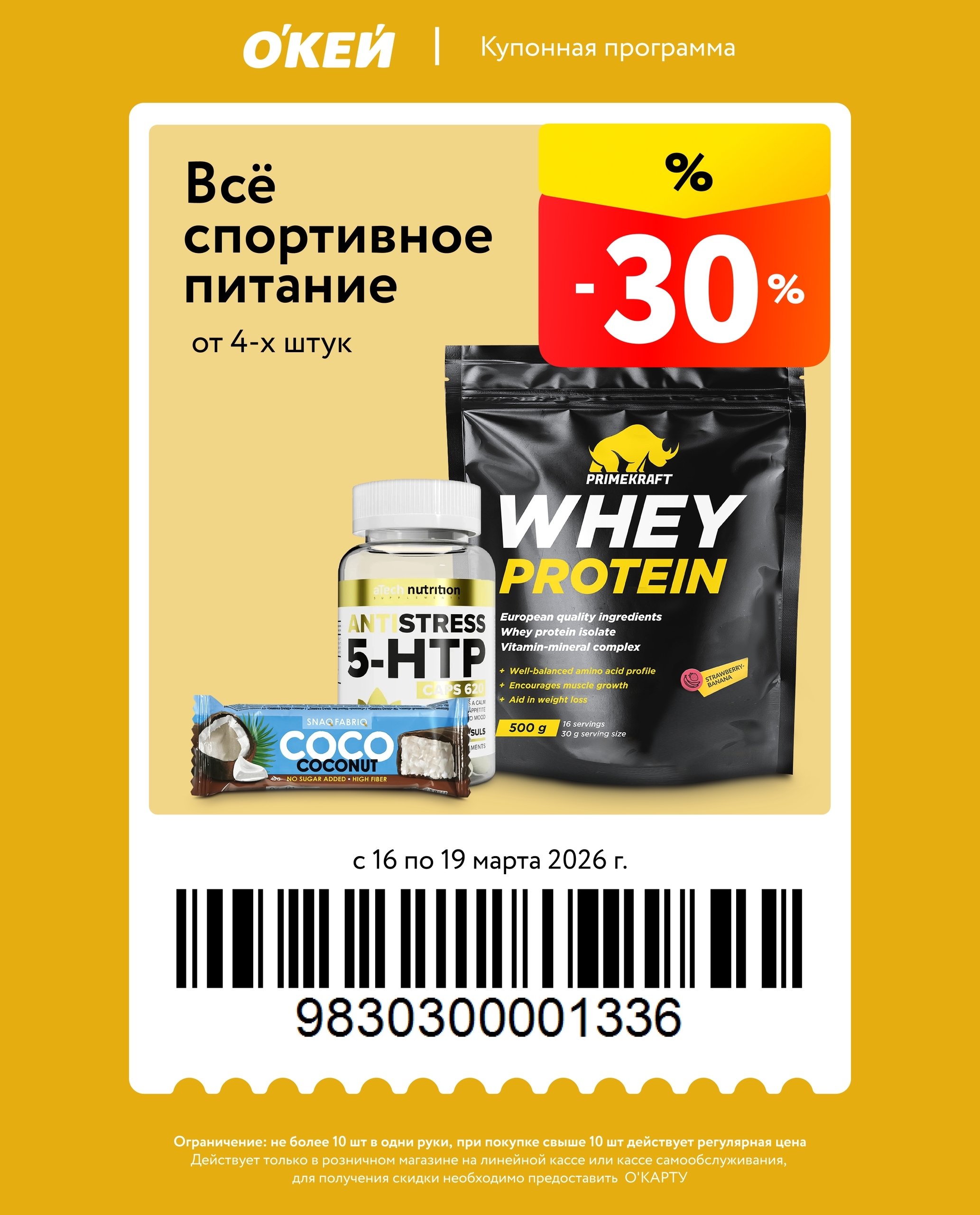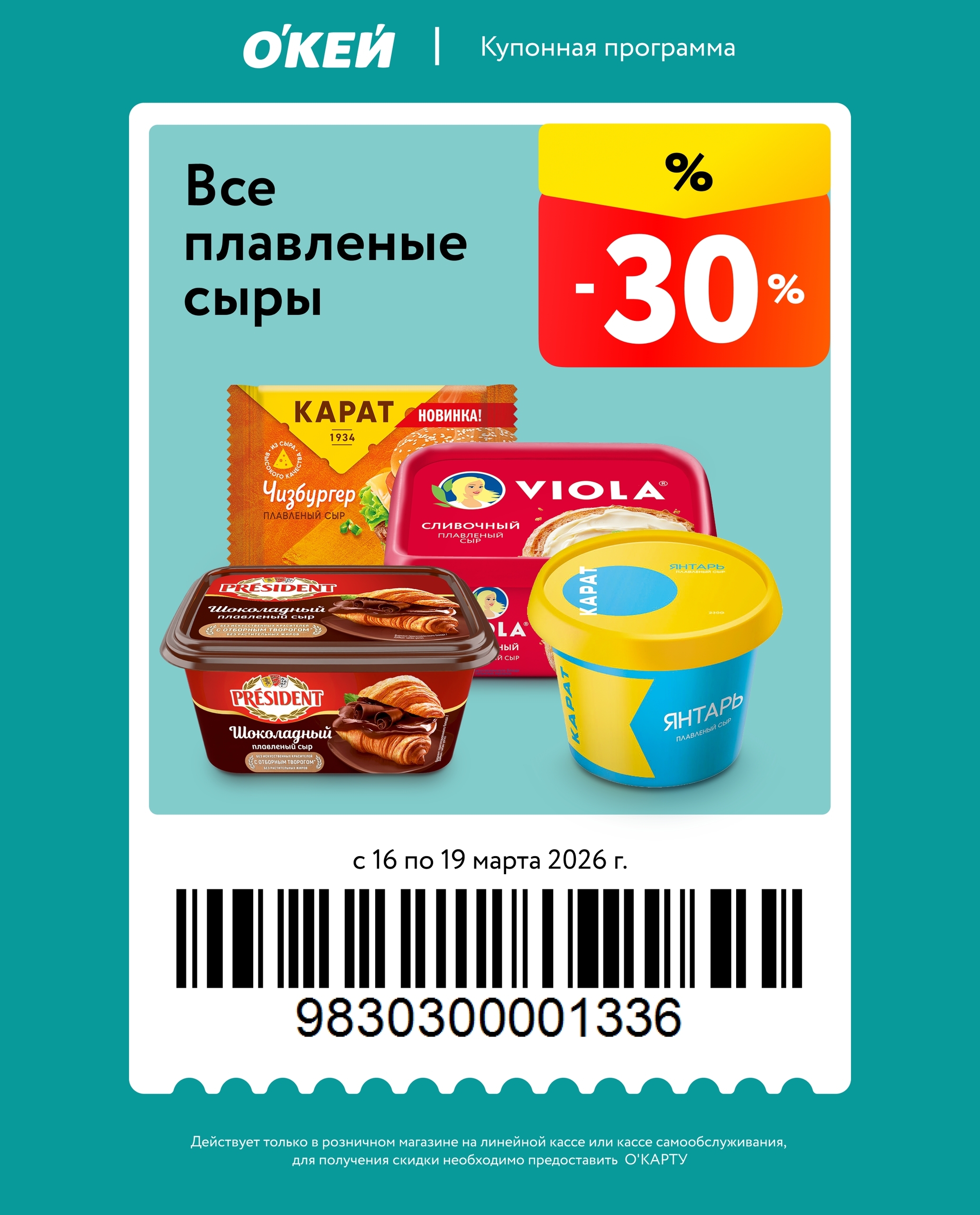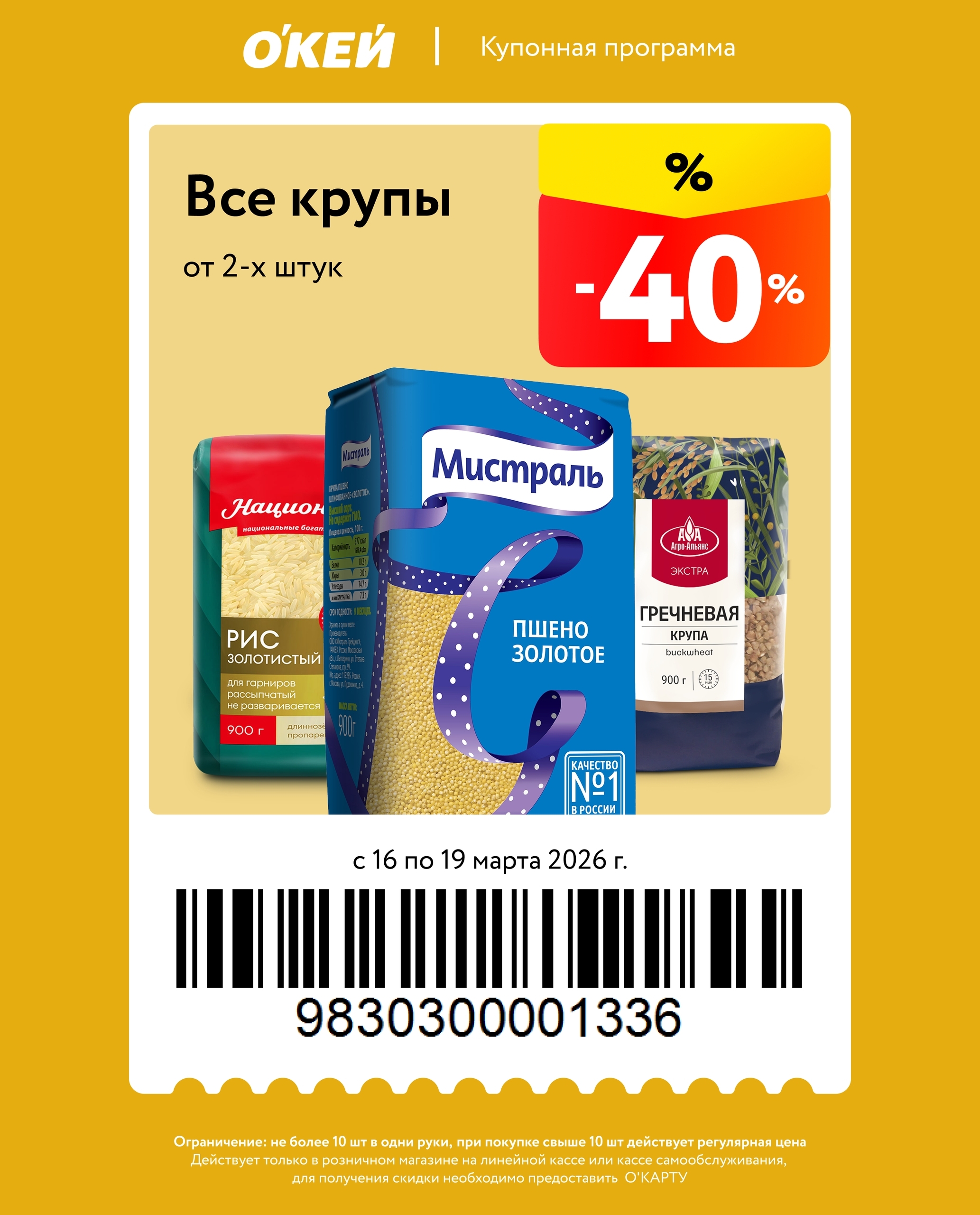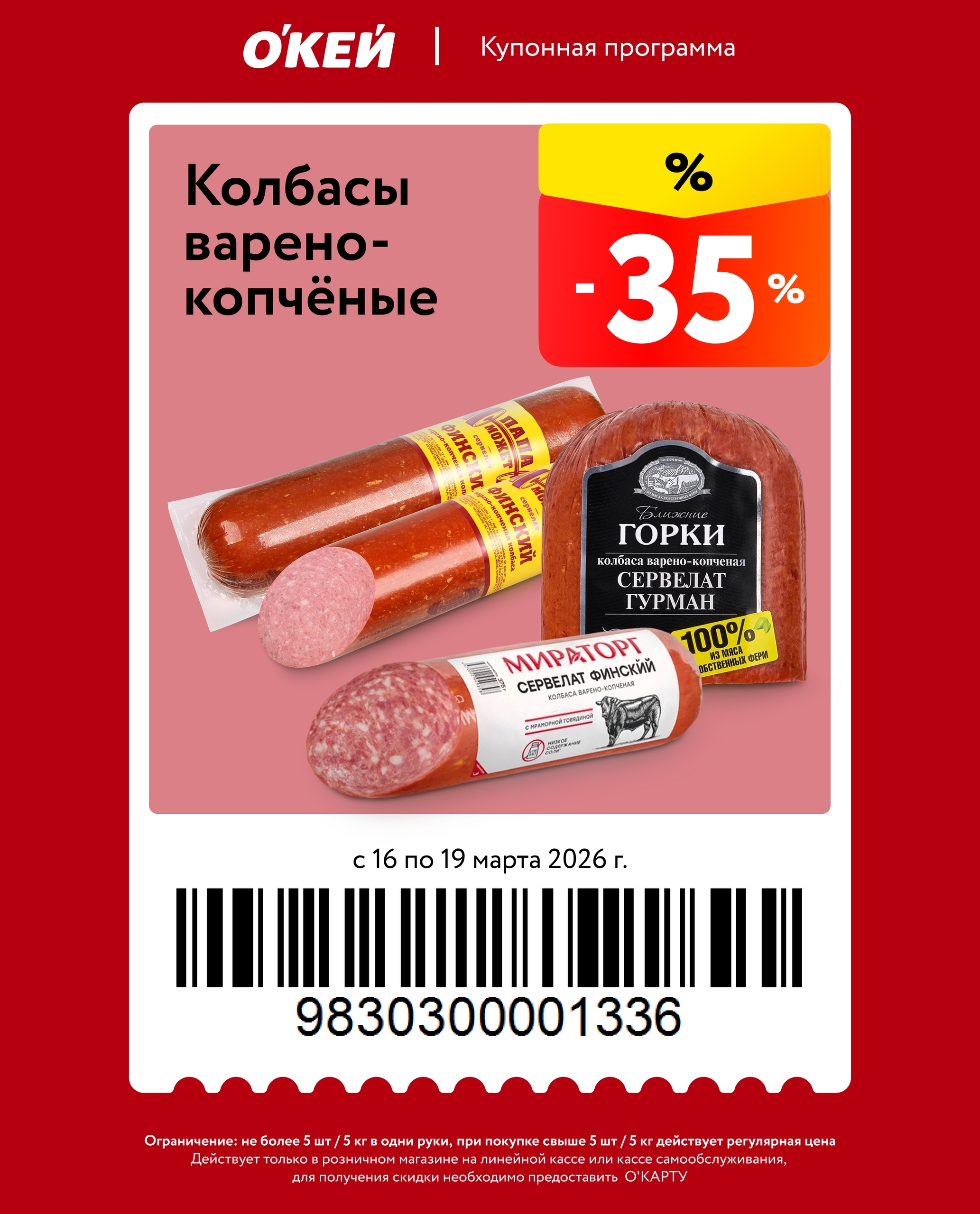 Представлены различные товары, которые предлагаются по выгодным ценам в магазинах Окей по акции с 16 марта — 19 марта 2026 года. Наибольшая выгода — крупы (40%), колбасы варено-копченые (35%), плавленые сыры (30%). Купонная программа действует при предъявлении карты магазина.