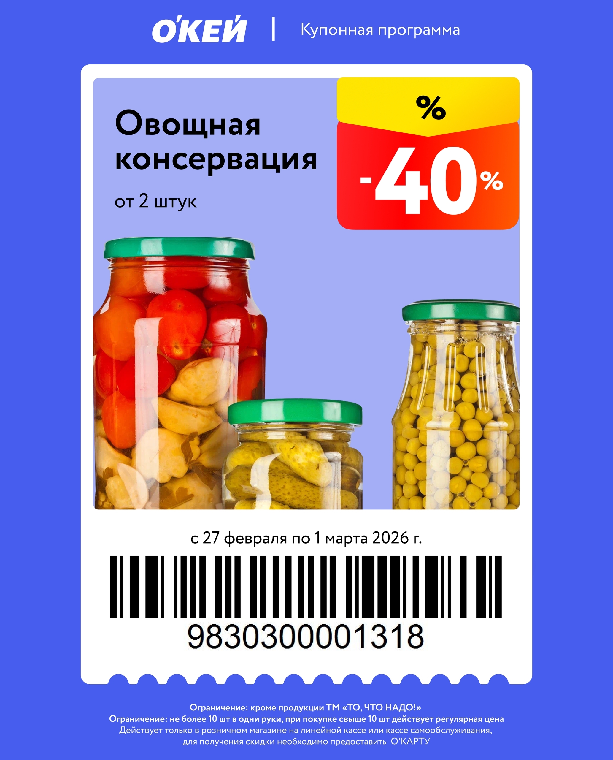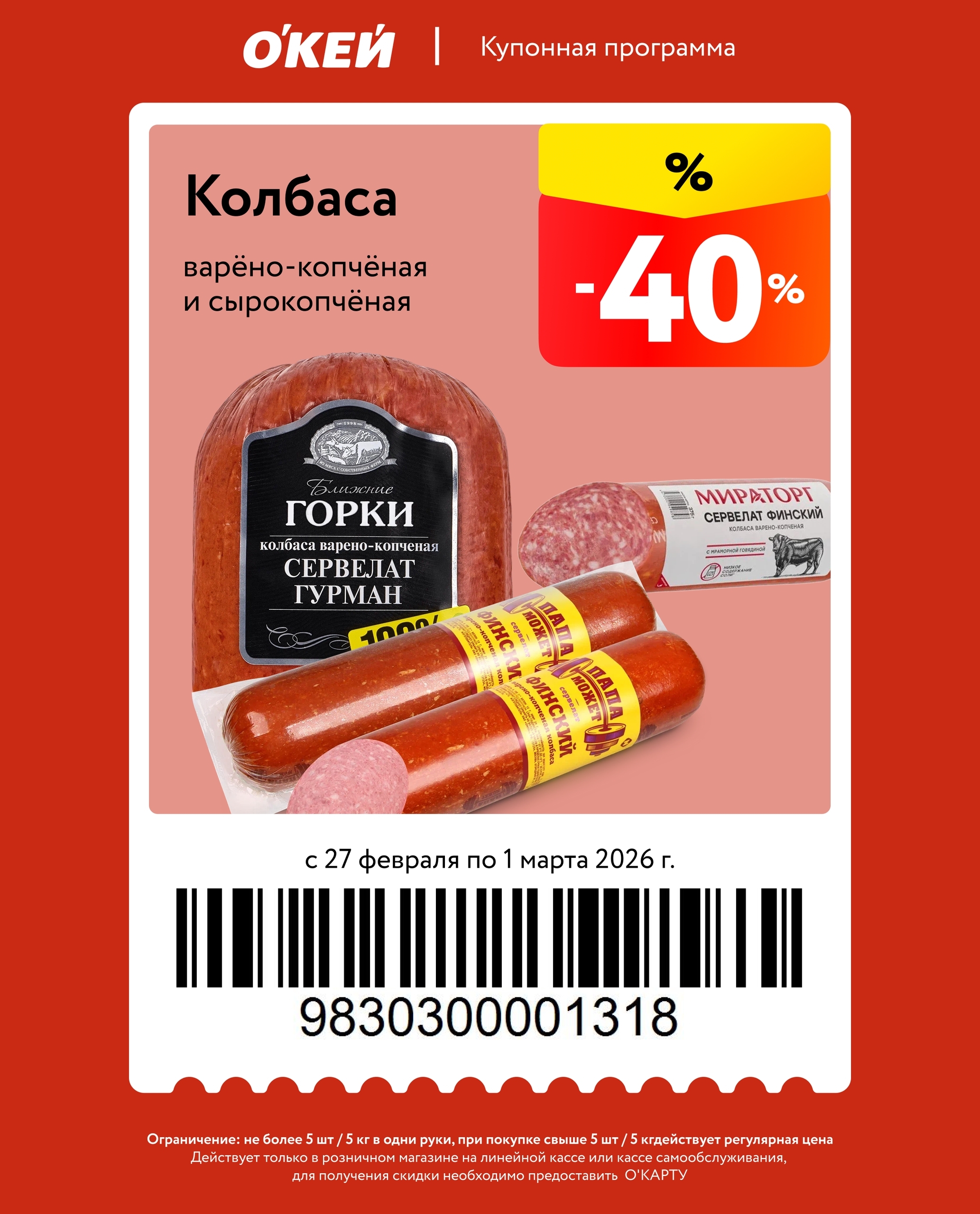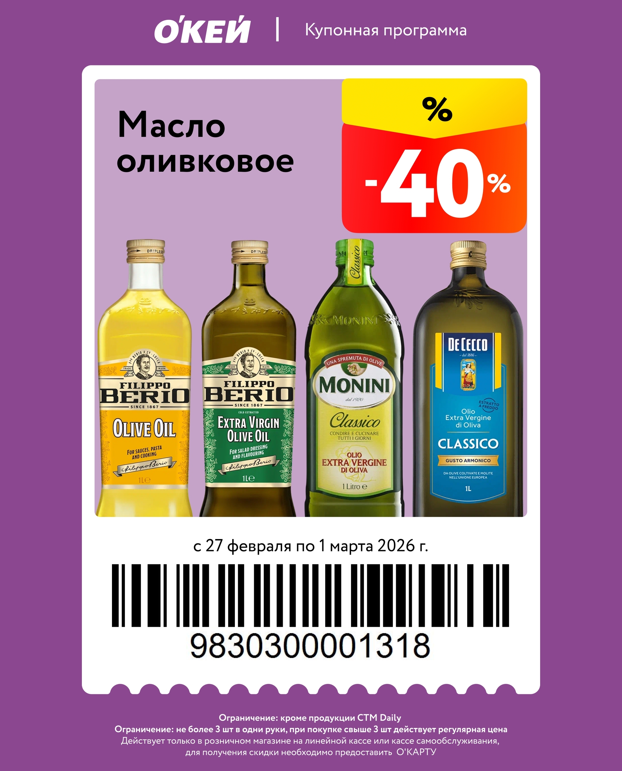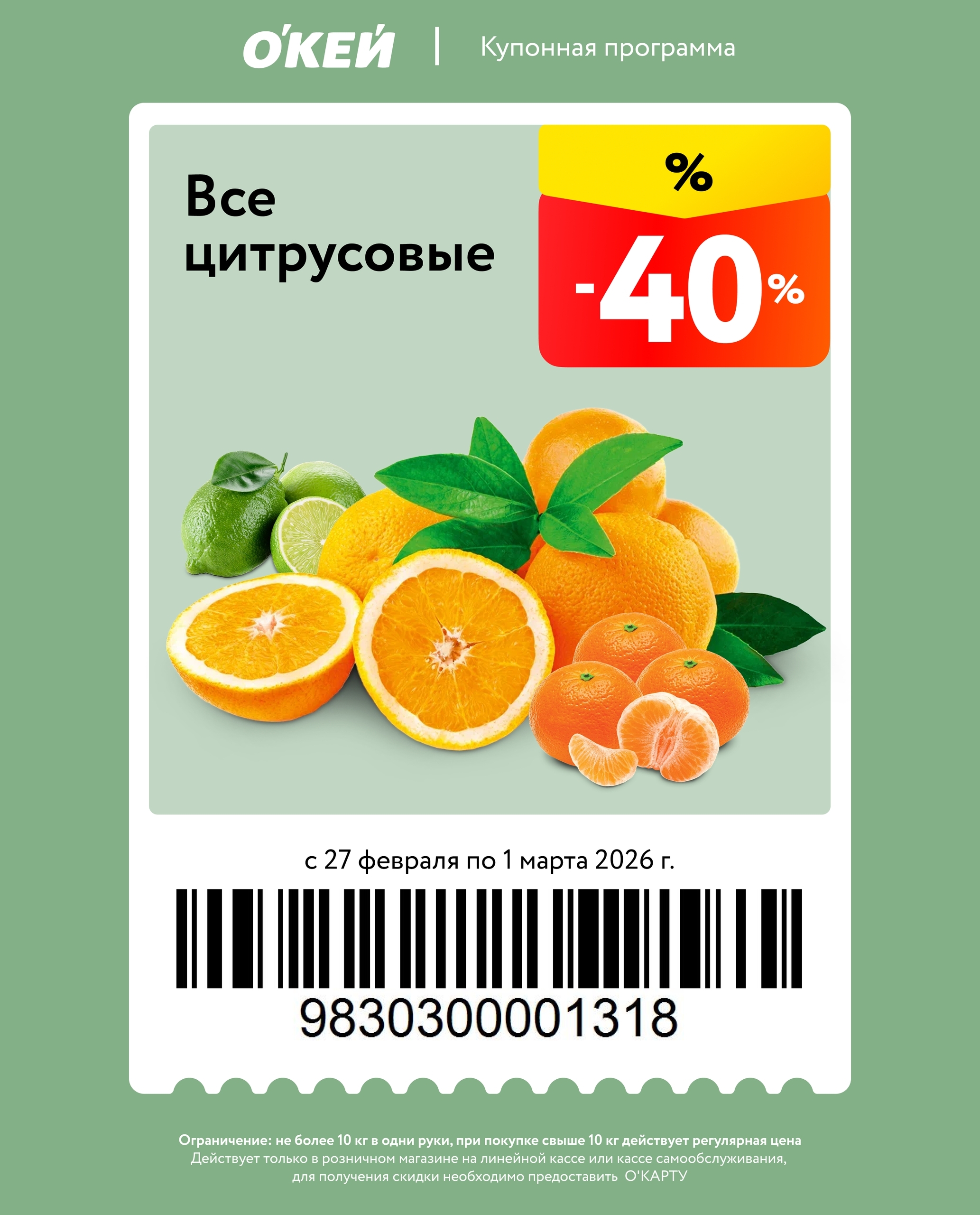 Представлены различные товары, которые предлагаются по выгодным ценам в магазинах Окей по акции с 27 февраля — 1 марта 2026 года. Наибольшая выгода — оливковое масло (40%), цитрусовые (40%), колбасы (40%). Купонная программа действует при предъявлении карты магазина.