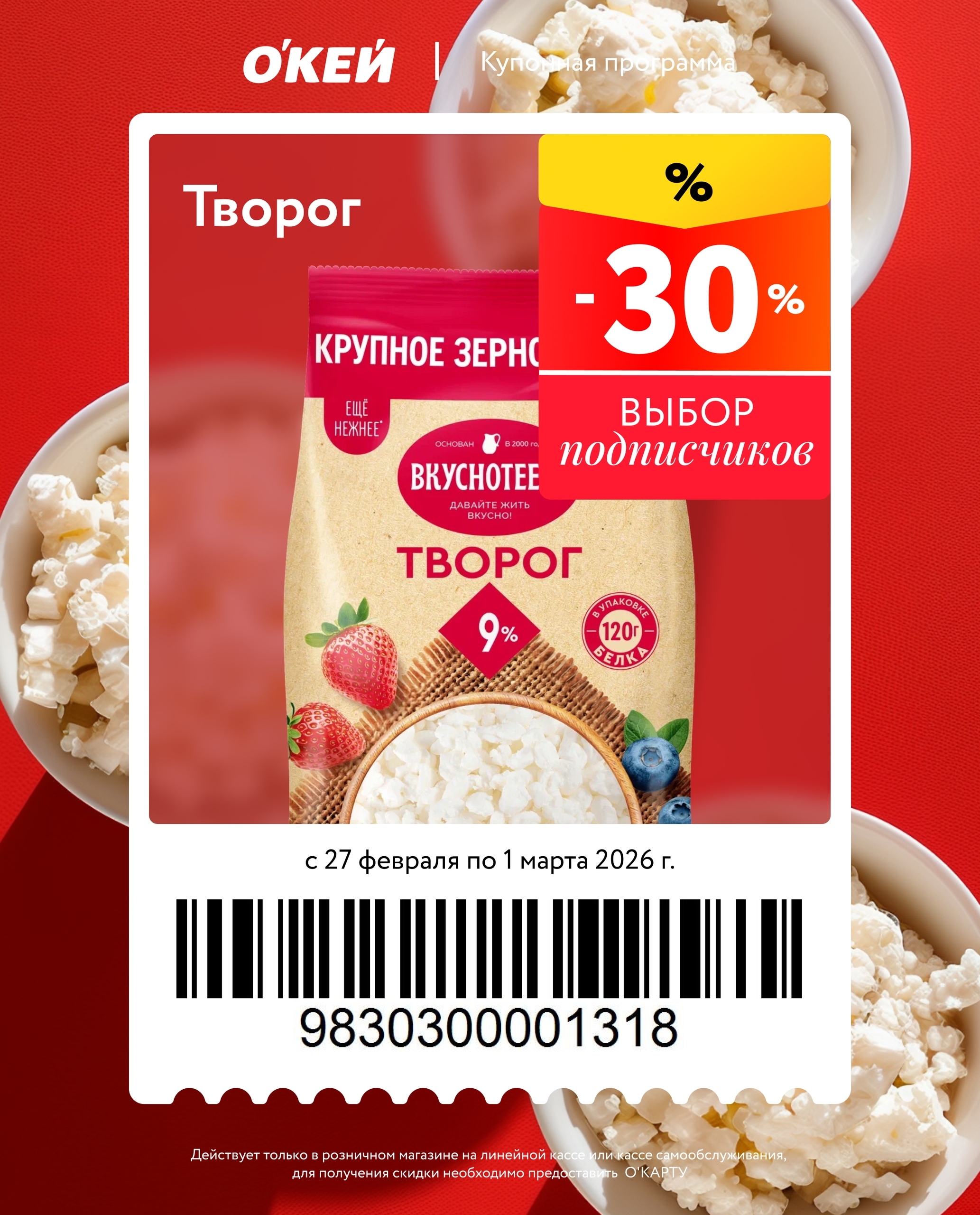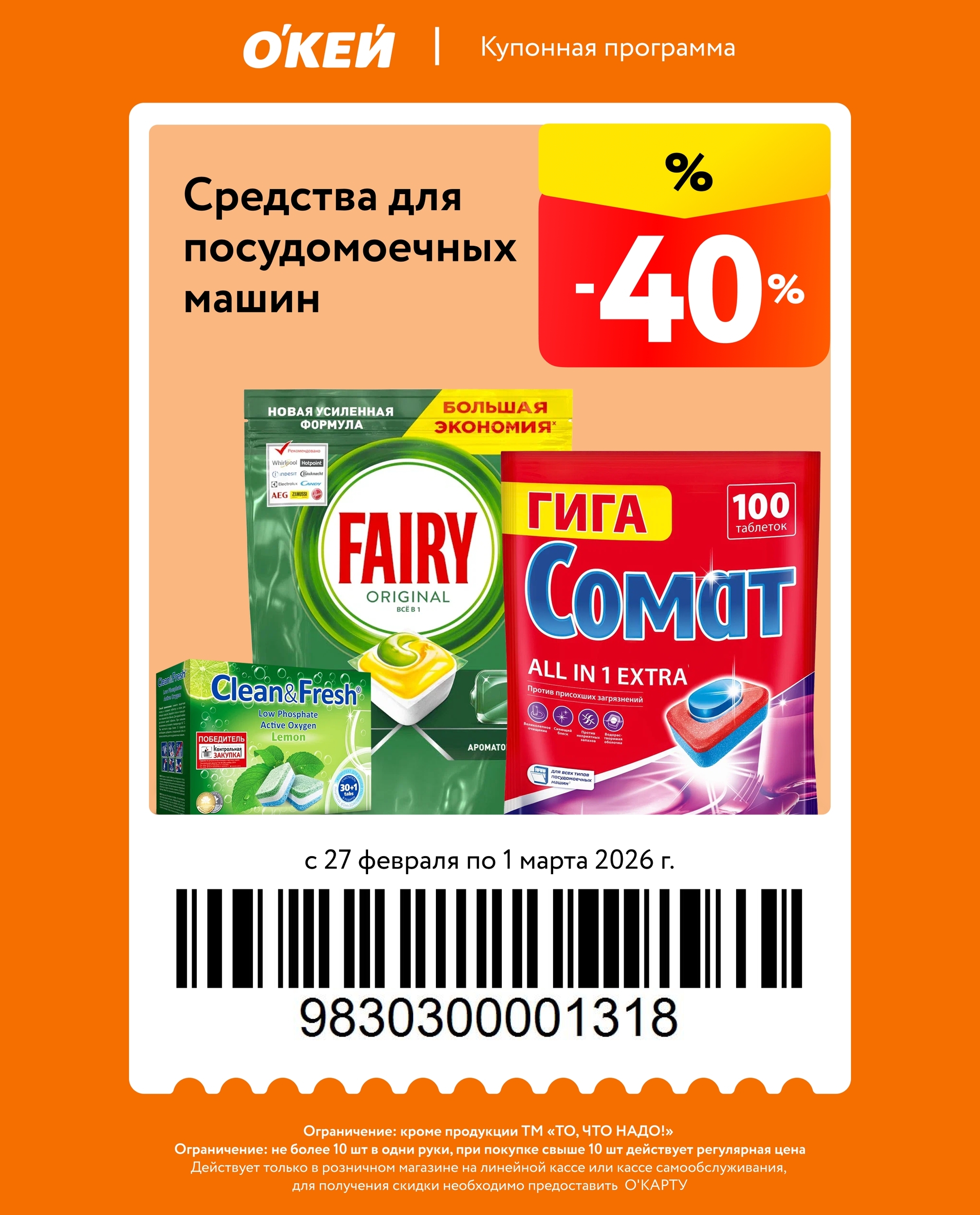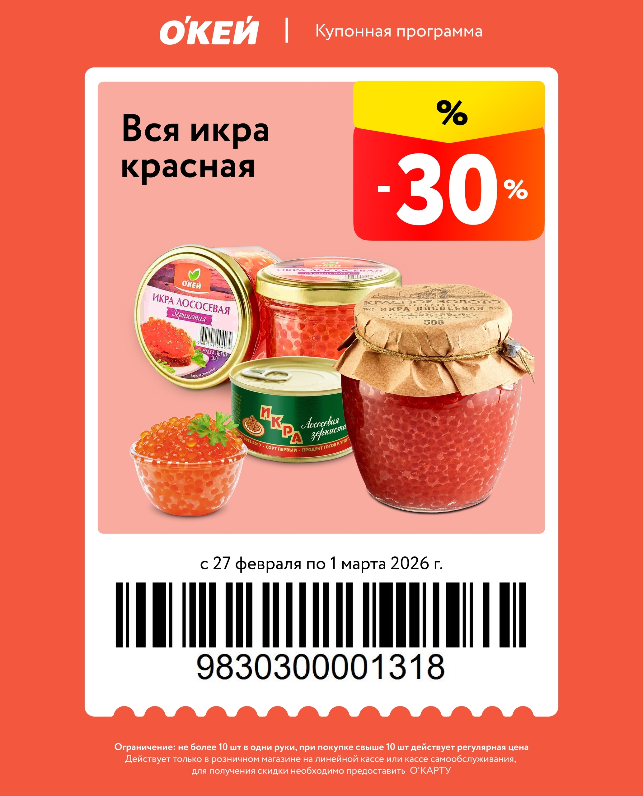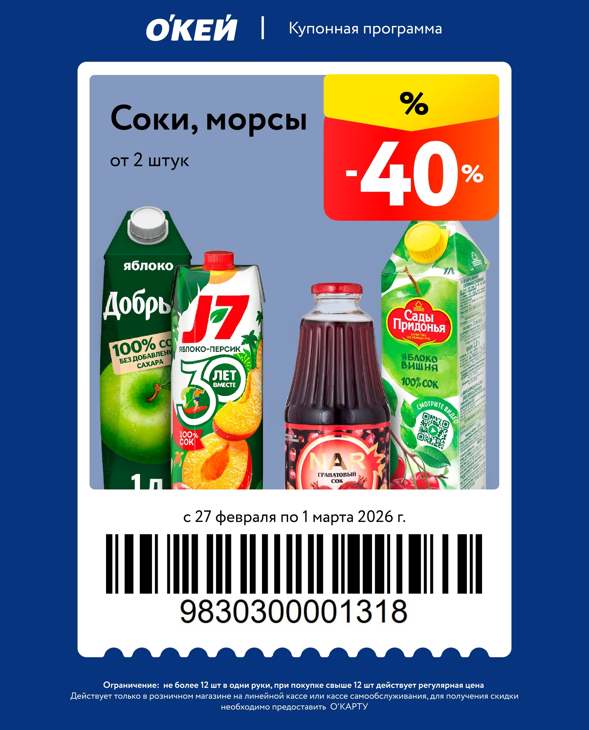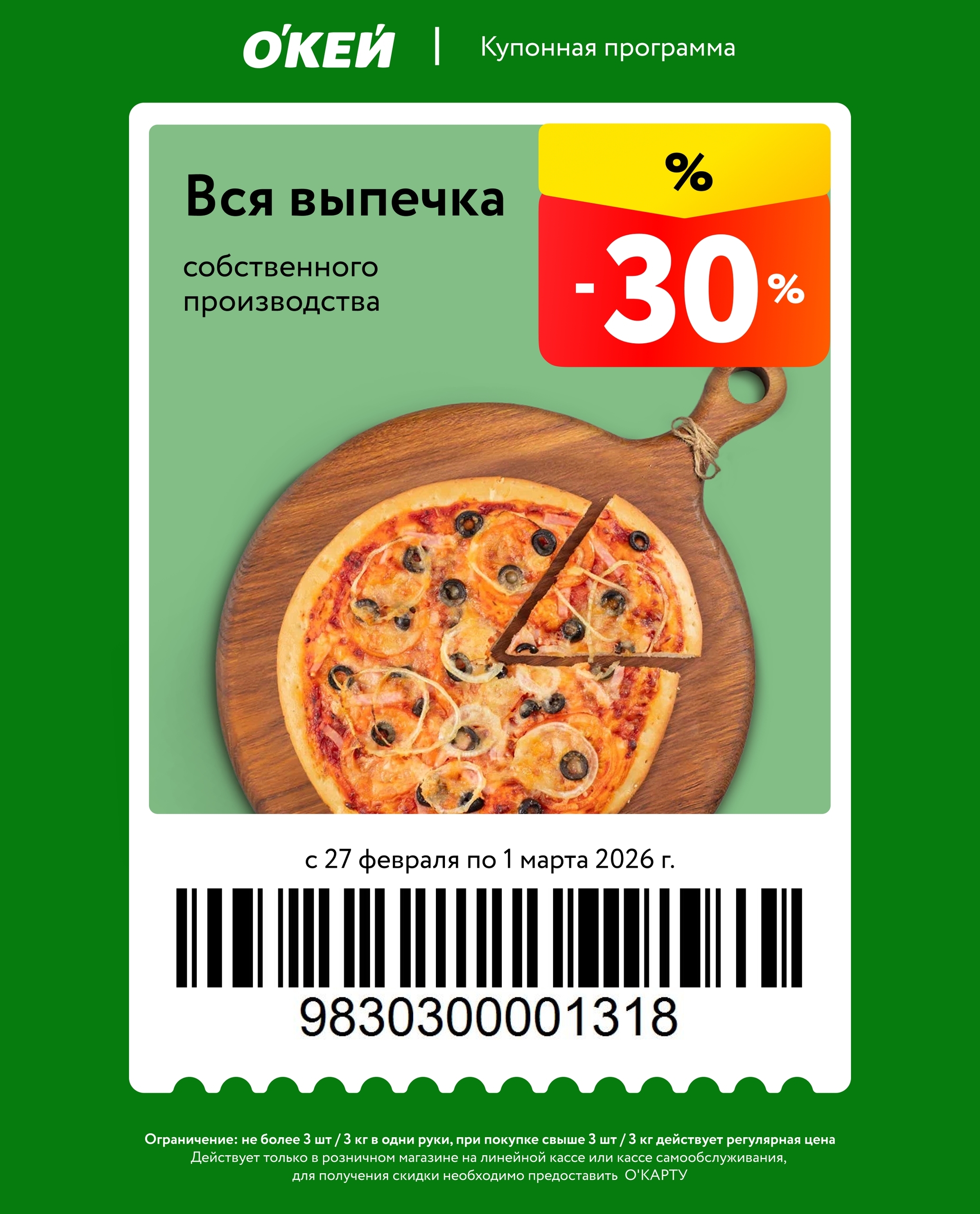 Представлены различные товары, которые предлагаются по выгодным ценам в магазинах Окей по акции с 27 февраля — 1 марта 2026 года. Наибольшая выгода — оливковое масло (40%), цитрусовые (40%), колбасы (40%). Купонная программа действует при предъявлении карты магазина.