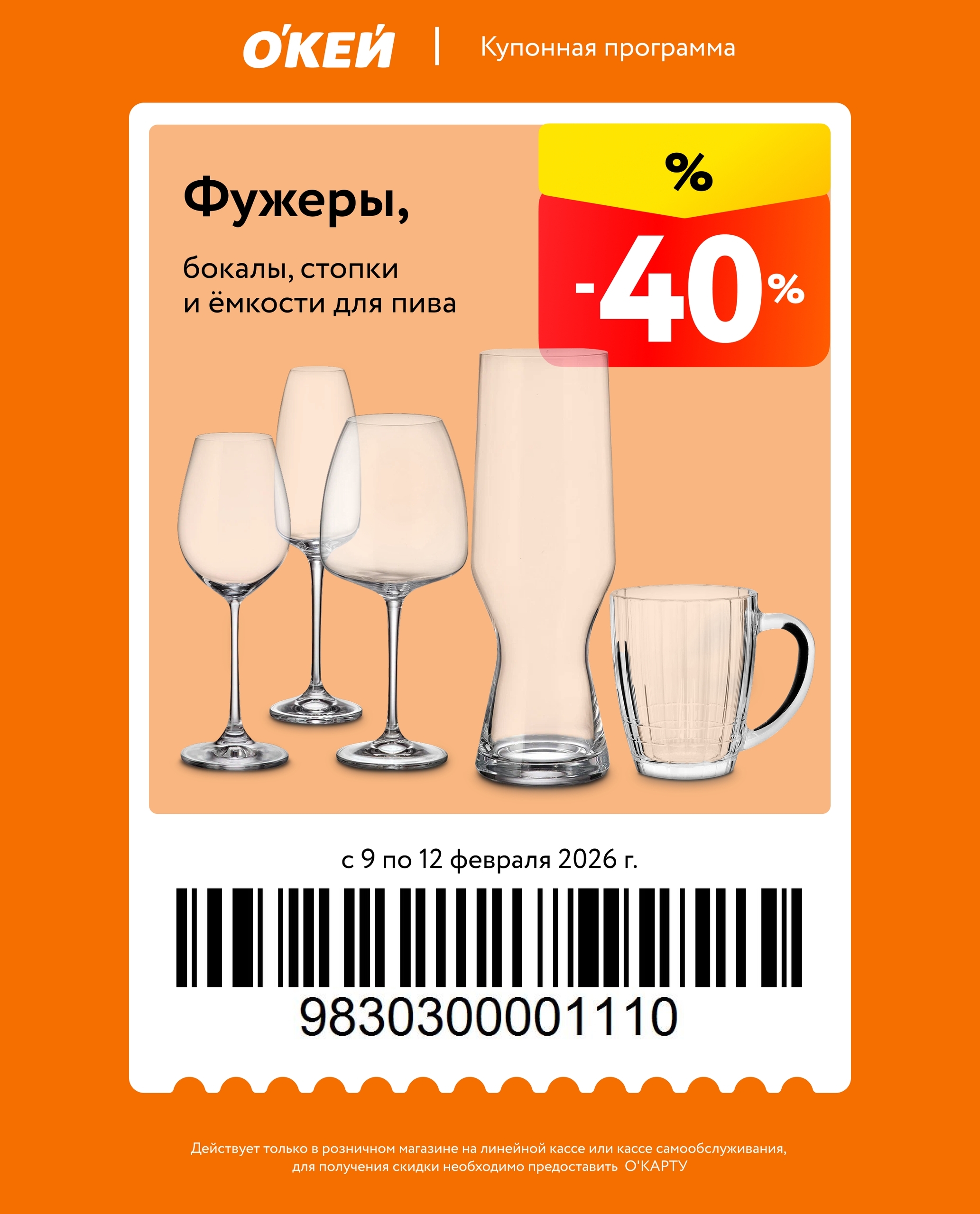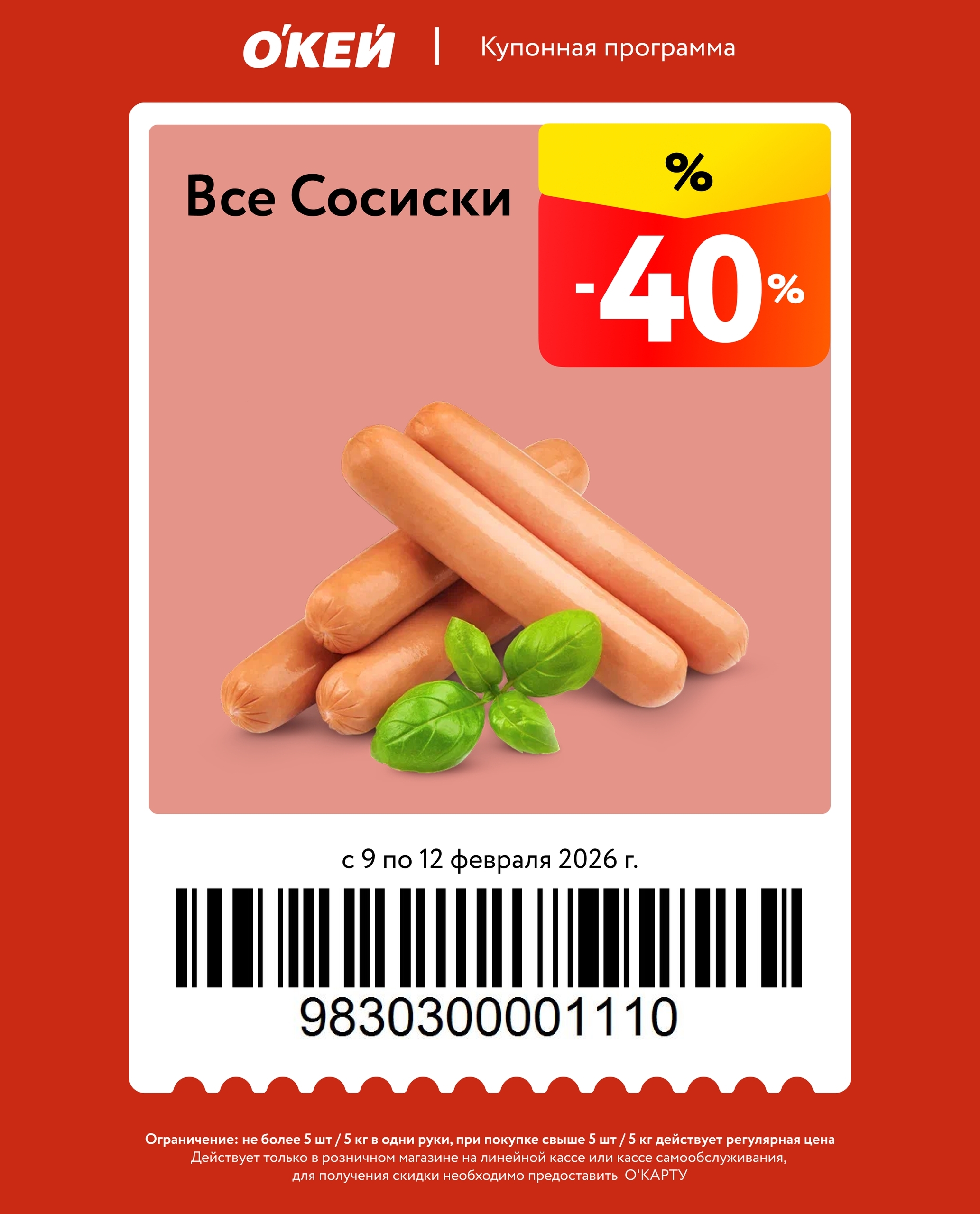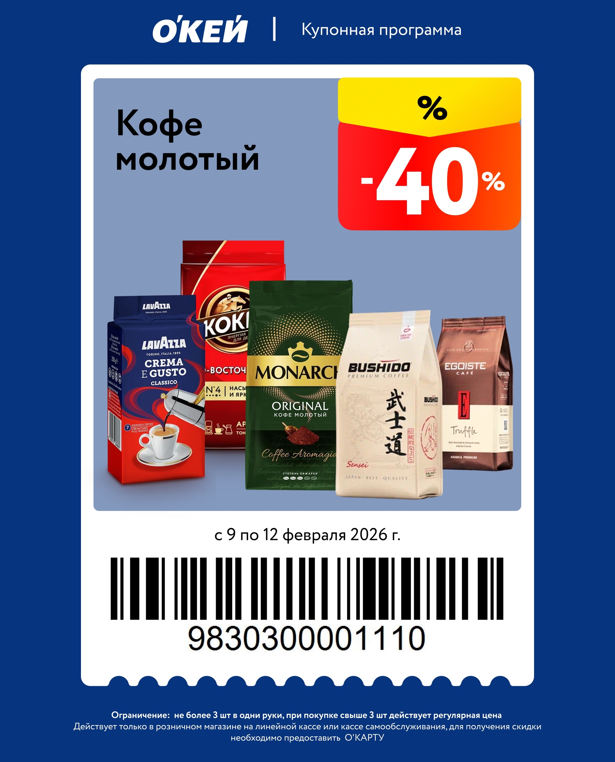 Представлены различные товары, которые предлагаются по выгодным ценам в магазинах Окей по акции с 9 февраля — 12 февраля 2026 года. Наибольшая выгода — кофе молотый (40%), сосиски (40%), фужеры (40%). Купонная программа действует при предъявлении карты магазина.