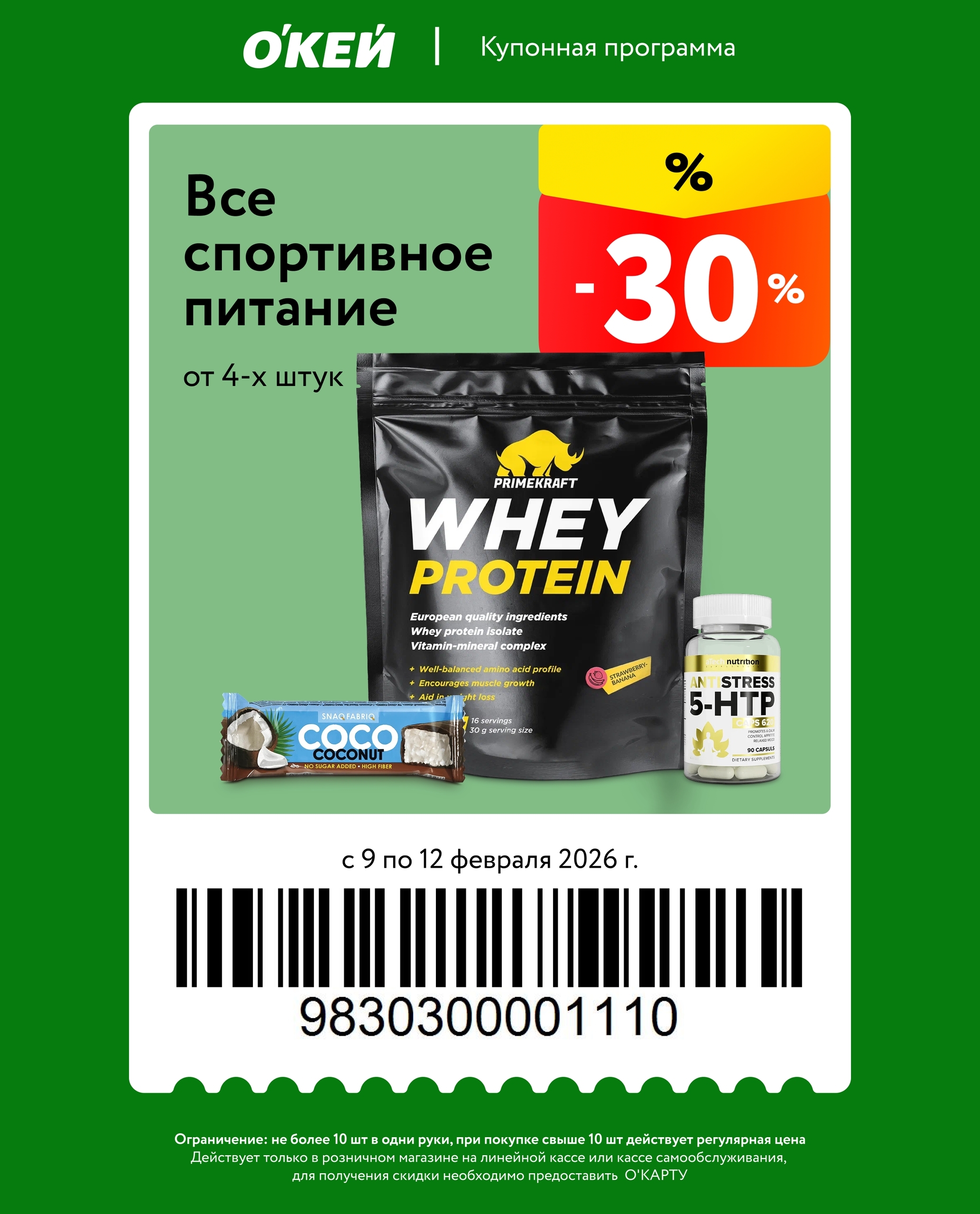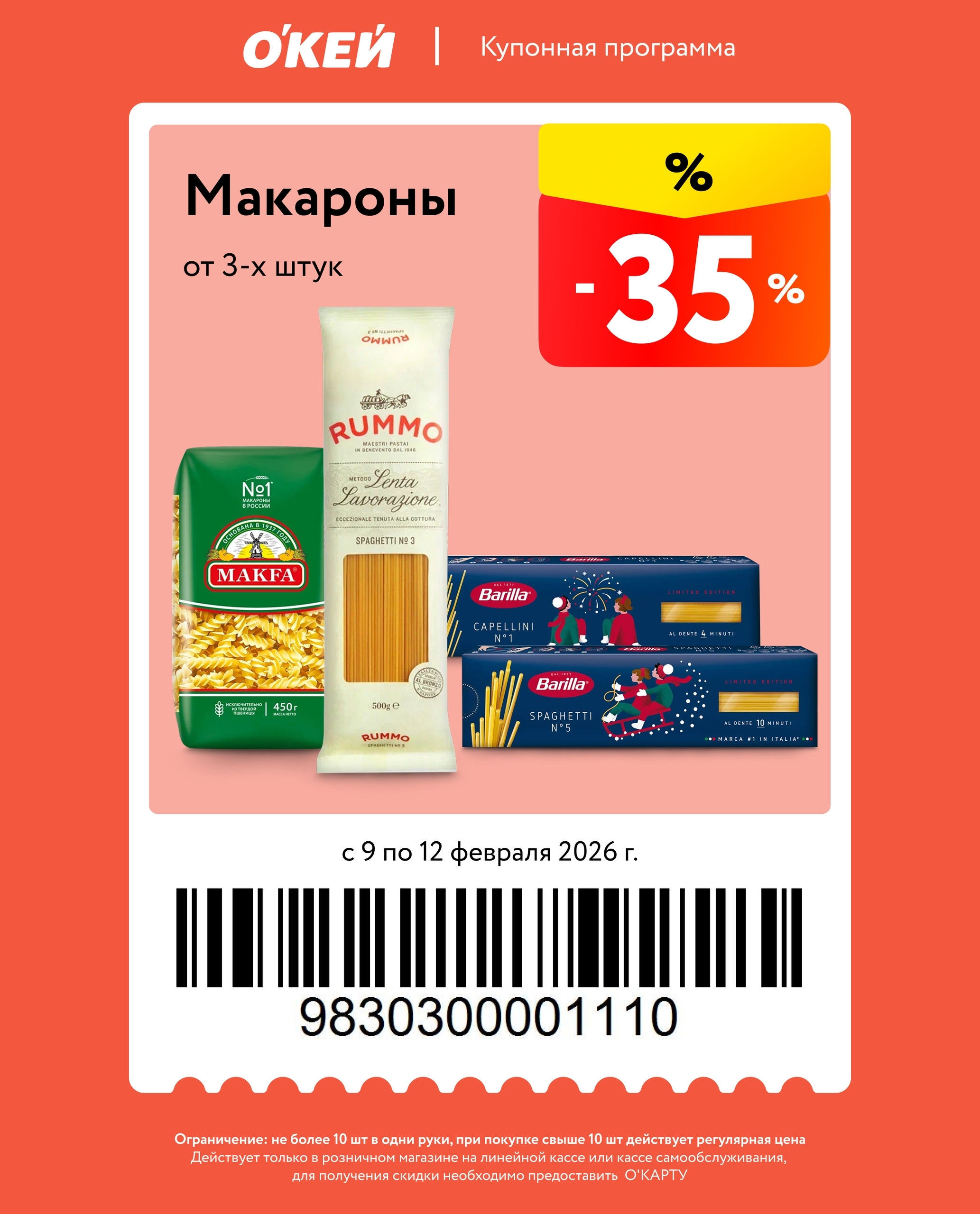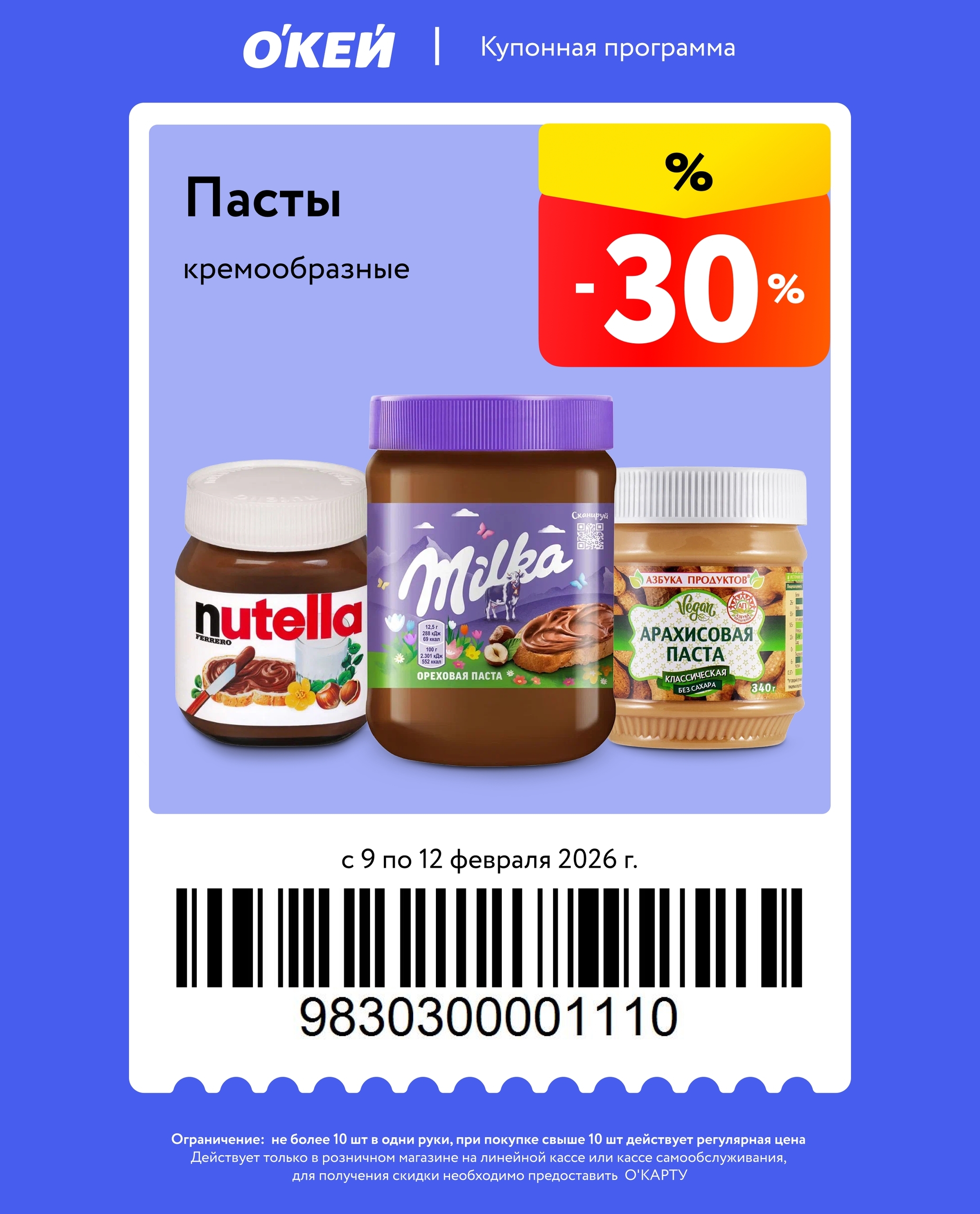 Представлены различные товары, которые предлагаются по выгодным ценам в магазинах Окей по акции с 9 февраля — 12 февраля 2026 года. Наибольшая выгода — кофе молотый (40%), сосиски (40%), фужеры (40%). Купонная программа действует при предъявлении карты магазина.