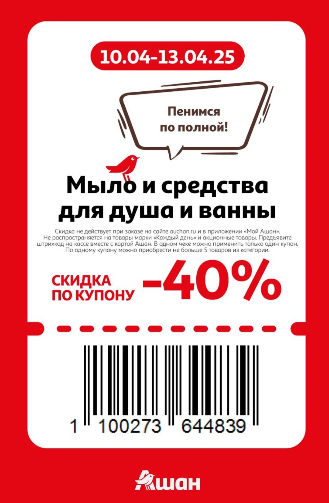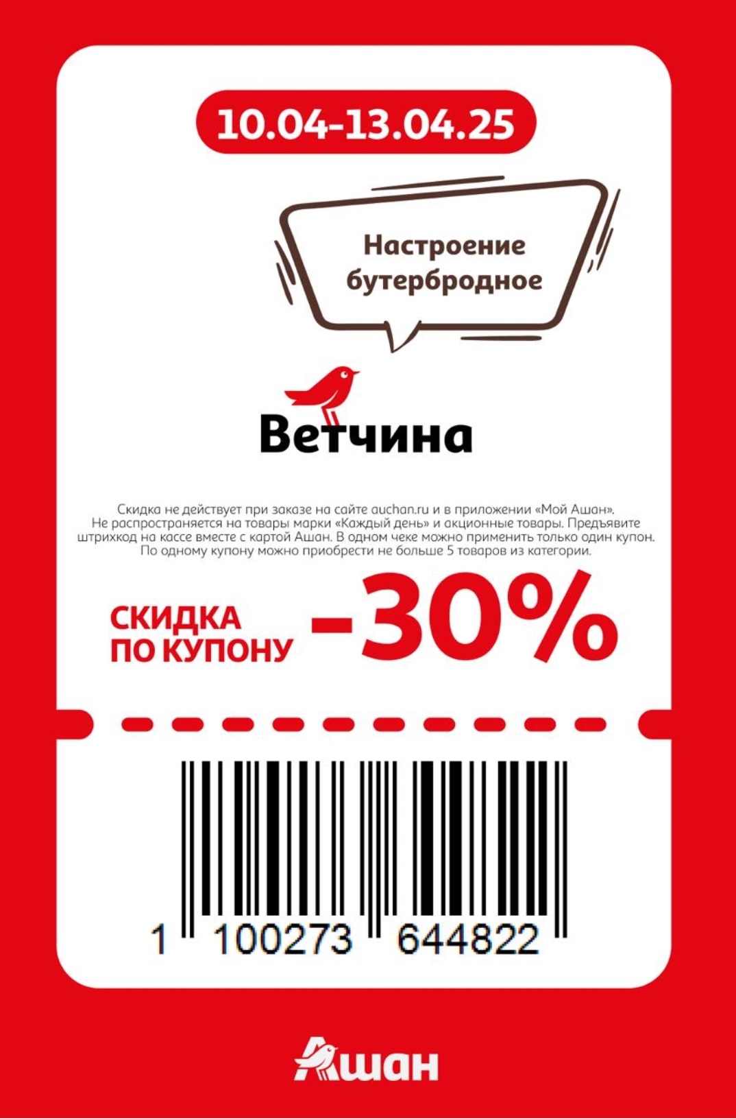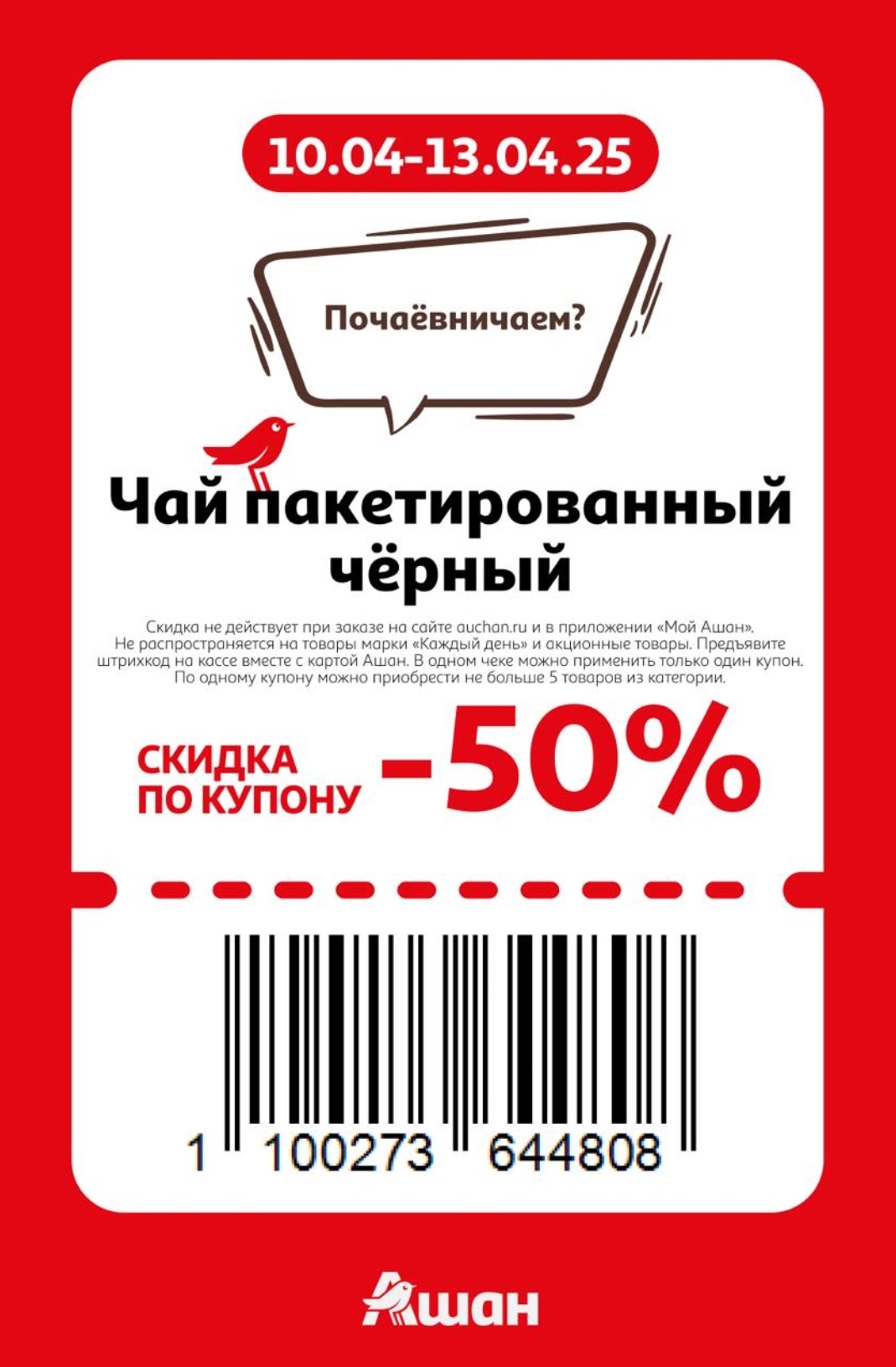 Представлены различные товары, которые предлагаются по выгодным ценам в магазинах Ашан по акции с 10 по 13 апреля 2025 года. Наибольшая выгода — на подушки (50%) и черный чай пакетированный (50%). Рекомендуем заранее спланировать покупки, чтобы максимально использовать чудо купоны.