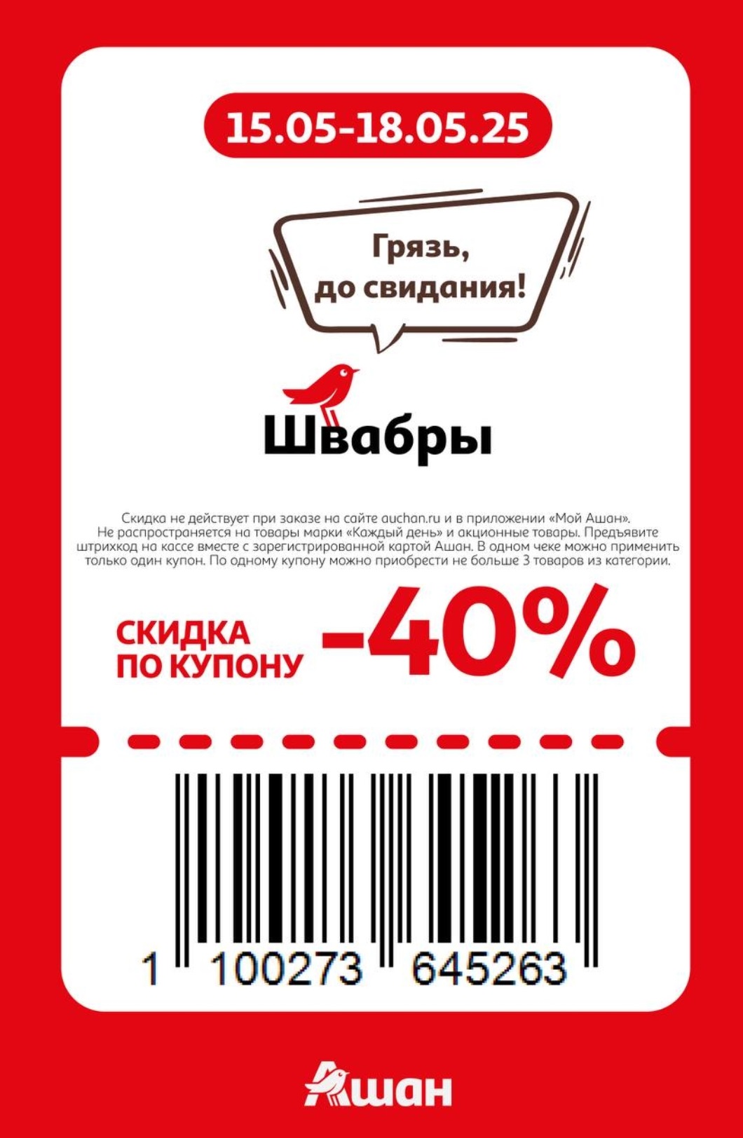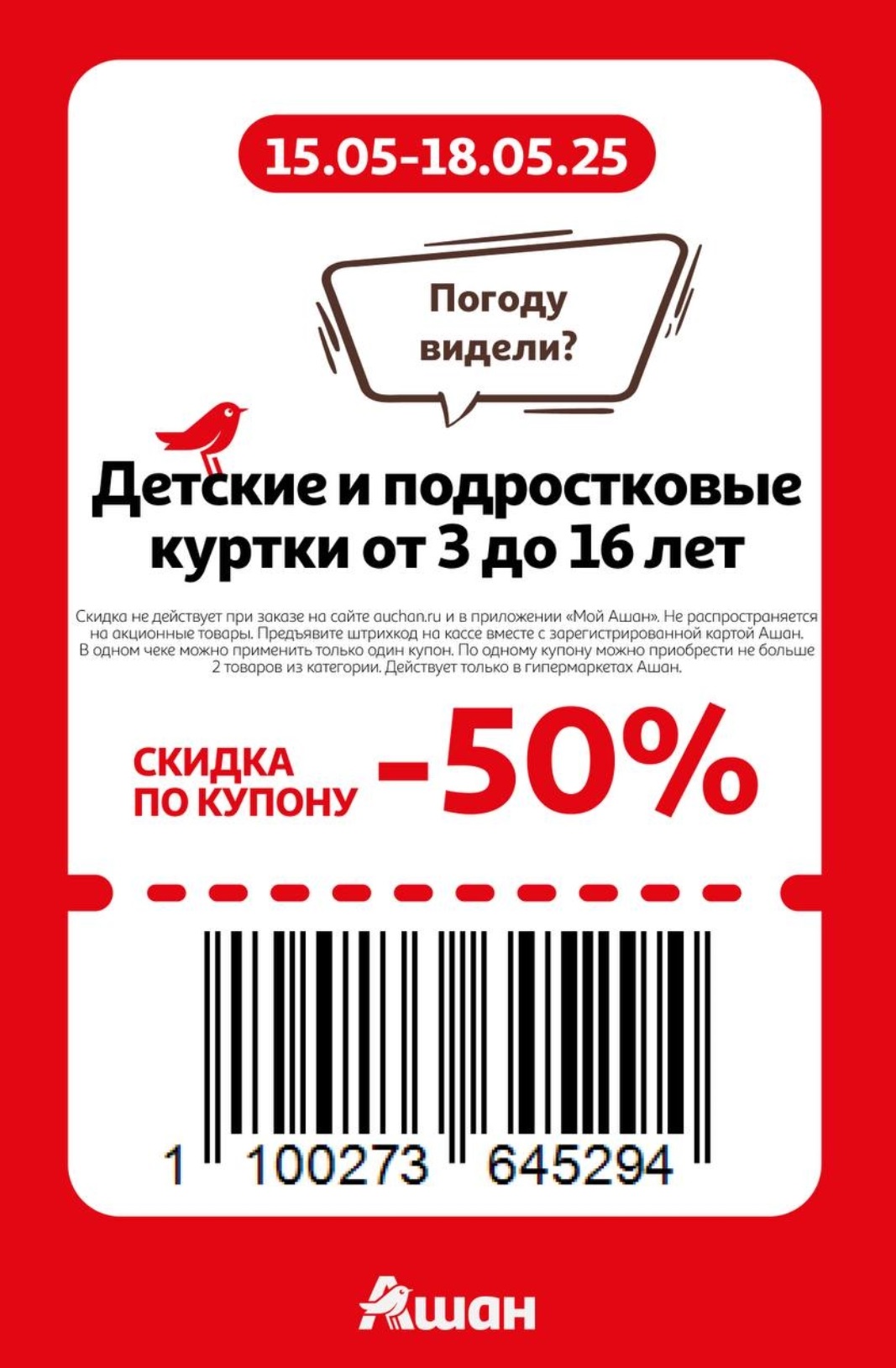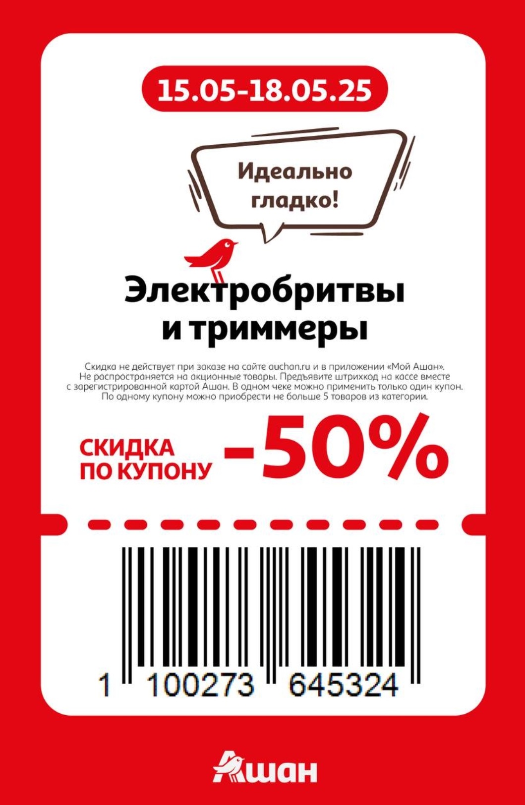 Представлены различные товары, которые предлагаются по выгодным ценам в магазинах Ашан по акции с 15 по 18 мая 2025 года. Наибольшая выгода — на детские и подростковые куртки (50%), электробритвы и триммеры (50%), швабры (40%). Рекомендуем заранее спланировать покупки, чтобы максимально использовать чудо купоны.