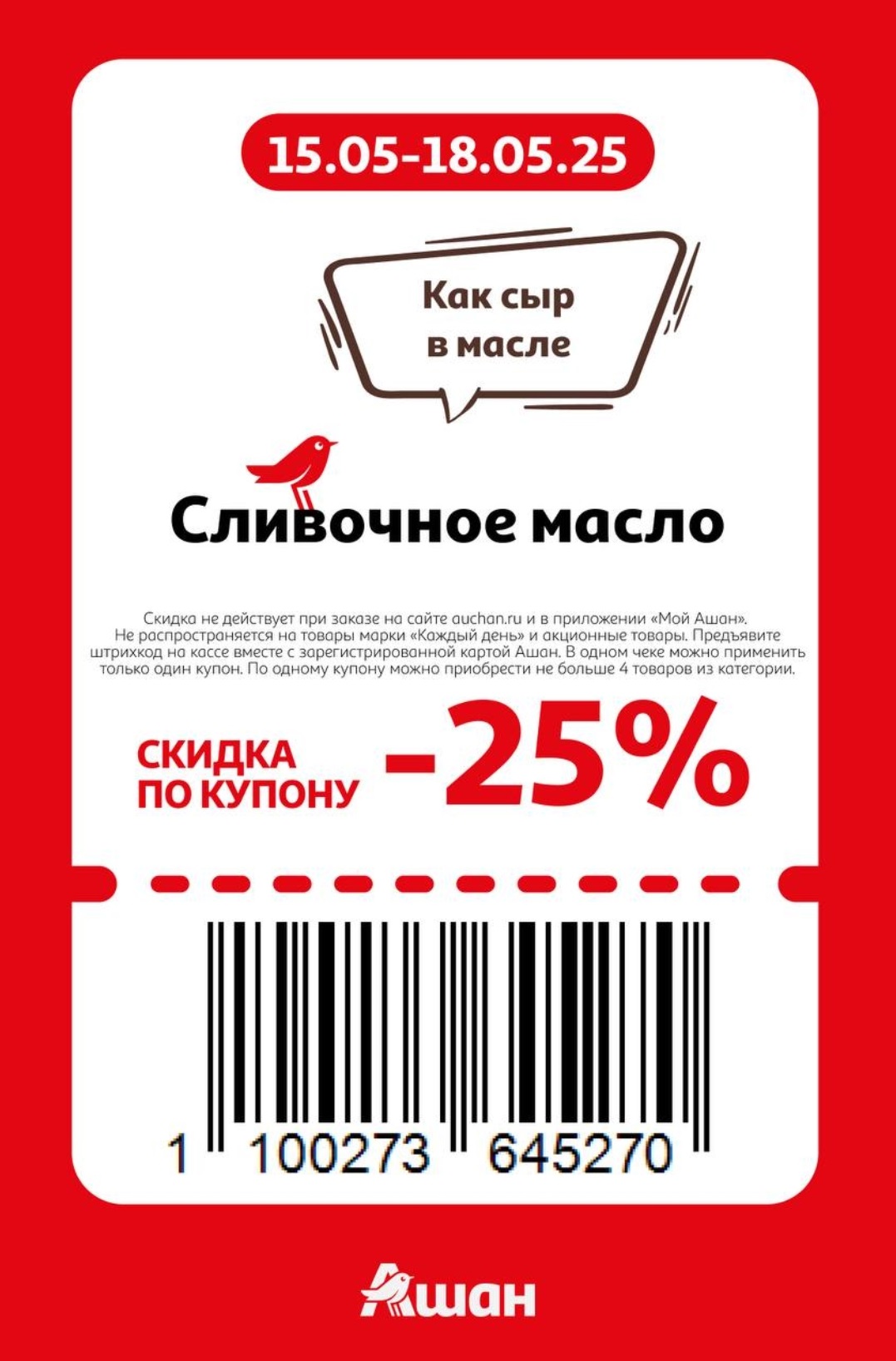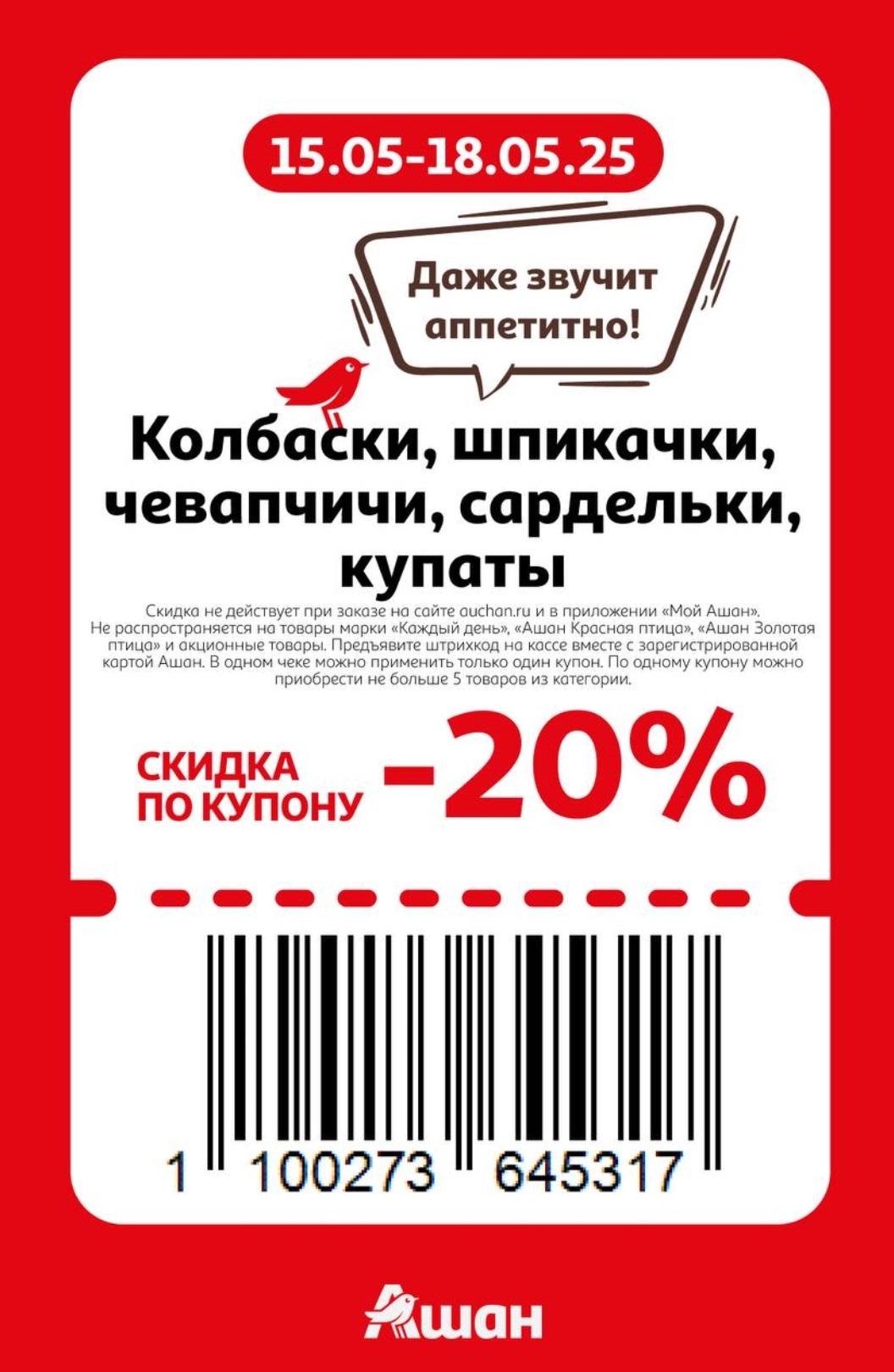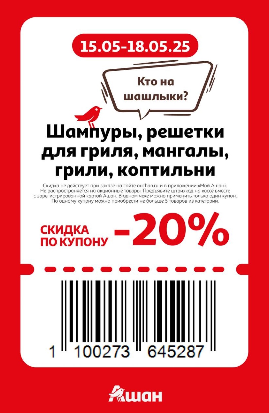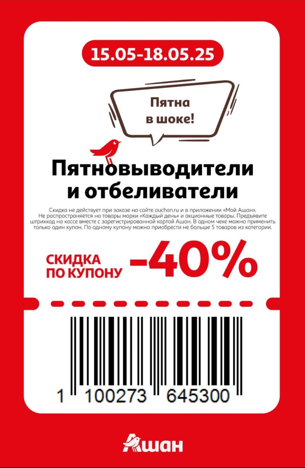 Представлены различные товары, которые предлагаются по выгодным ценам в магазинах Ашан по акции с 15 по 18 мая 2025 года. Наибольшая выгода — на детские и подростковые куртки (50%), электробритвы и триммеры (50%), швабры (40%). Рекомендуем заранее спланировать покупки, чтобы максимально использовать чудо купоны.