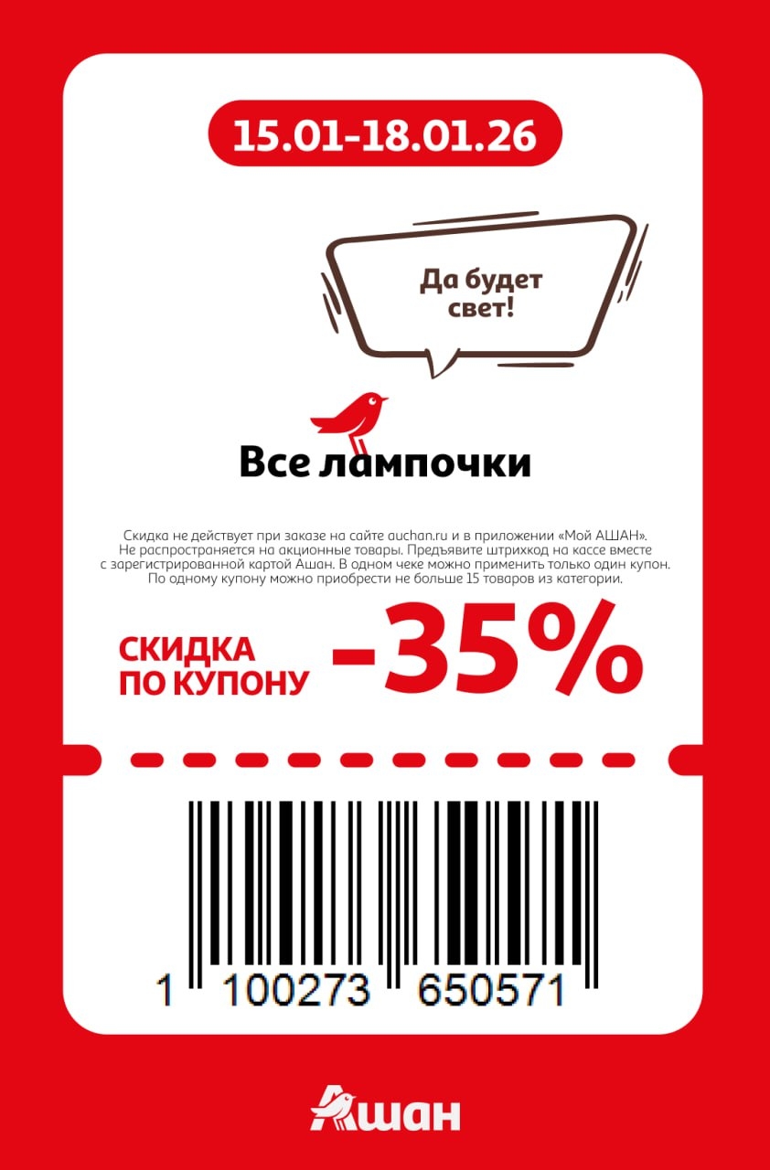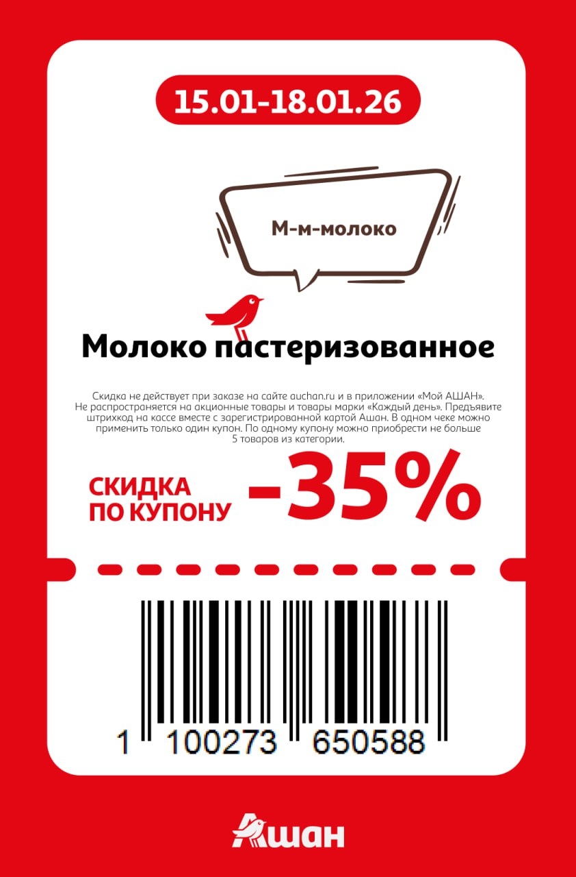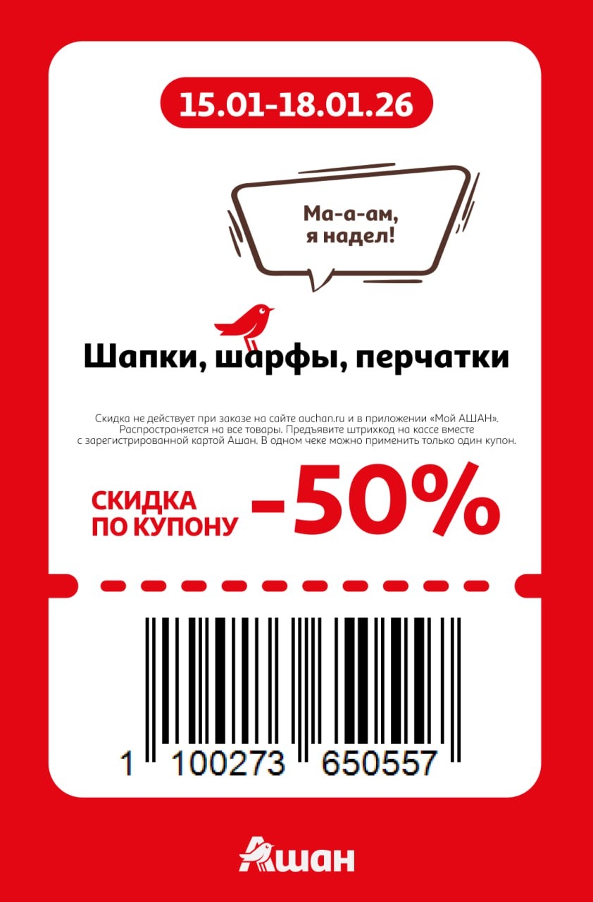 Представлены различные товары, которые предлагаются по выгодным ценам в магазинах Ашан по акции с 15 января — 18 января 2026 года. Наибольшая выгода — на шапки, шарфы, перчатки (50%), молоко пастеризованное (35%), автомасла (30%). Рекомендуем заранее спланировать покупки, чтобы максимально использовать чудо купоны.