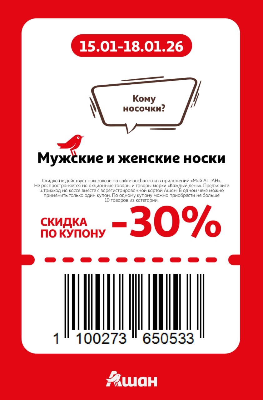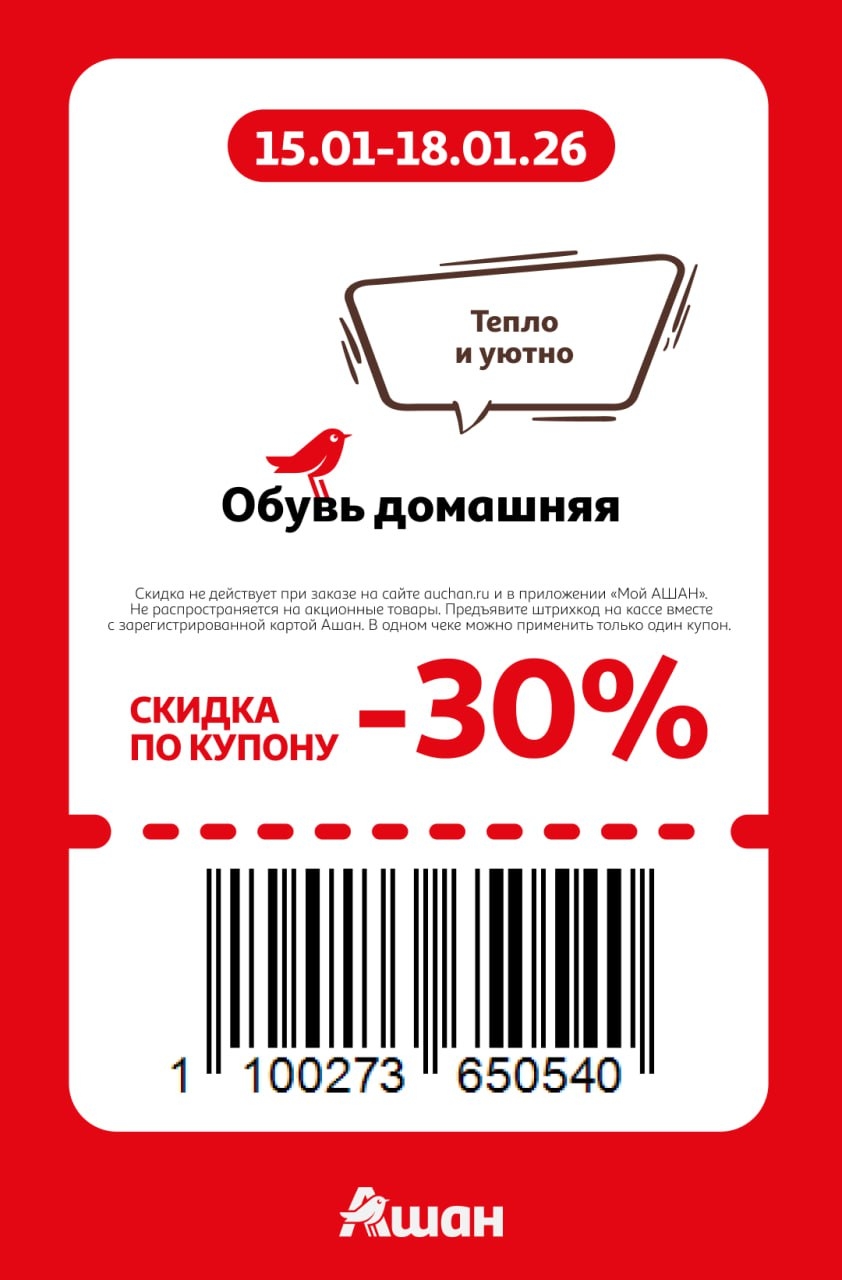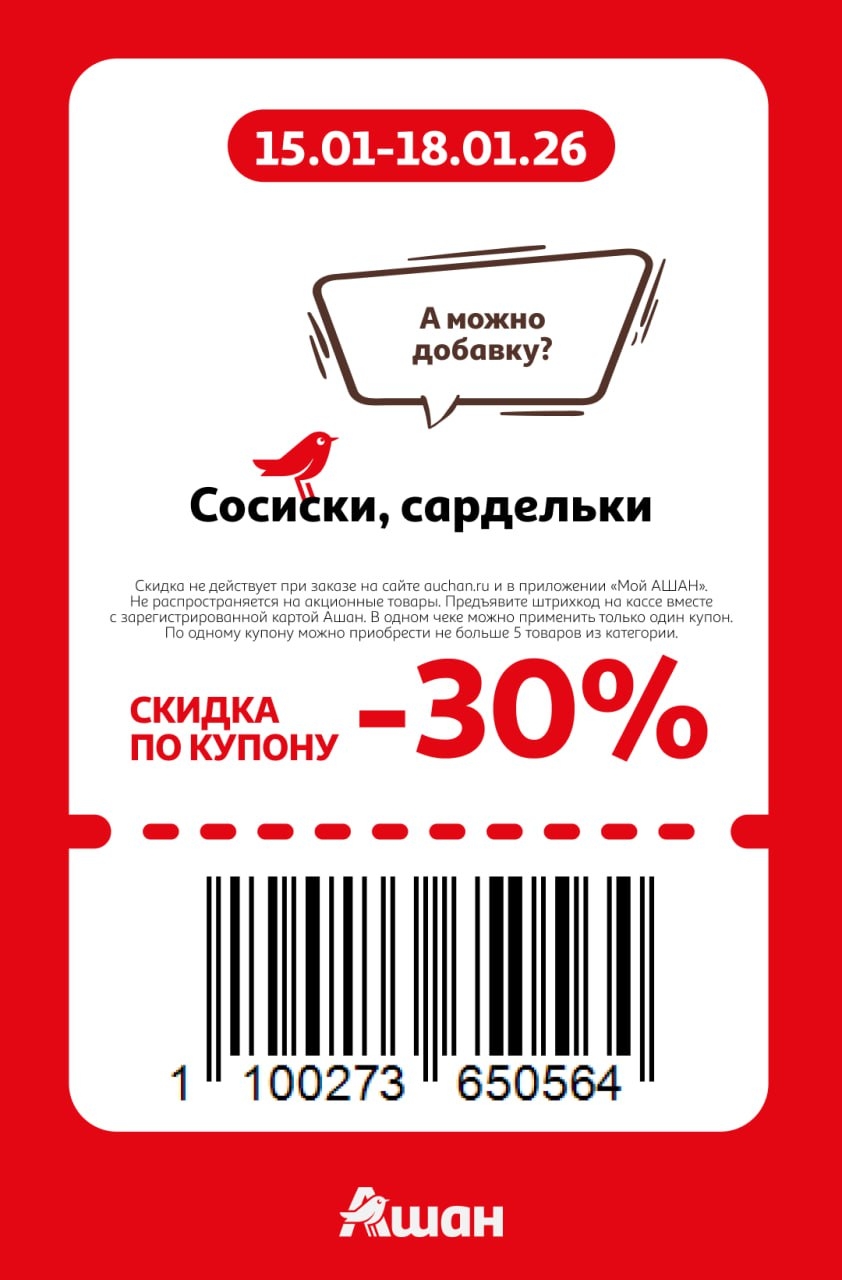 Представлены различные товары, которые предлагаются по выгодным ценам в магазинах Ашан по акции с 15 января — 18 января 2026 года. Наибольшая выгода — на шапки, шарфы, перчатки (50%), молоко пастеризованное (35%), автомасла (30%). Рекомендуем заранее спланировать покупки, чтобы максимально использовать чудо купоны.