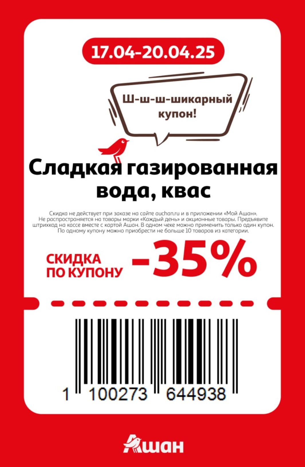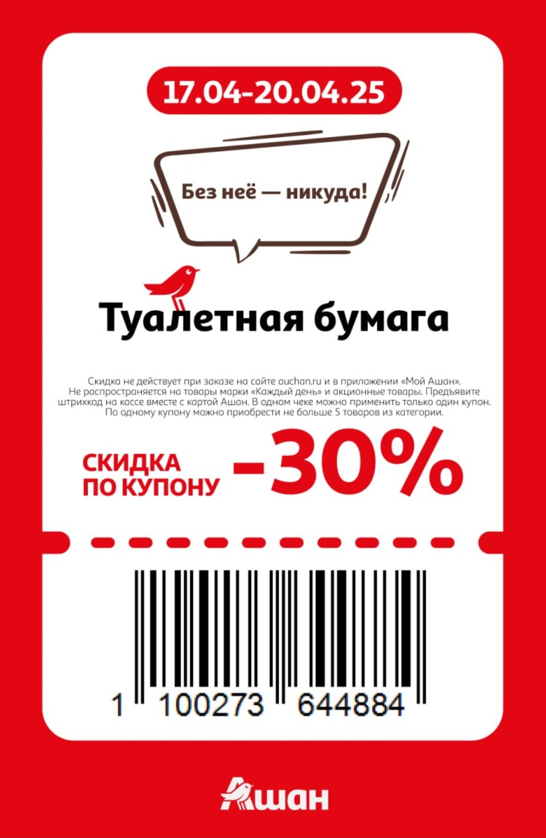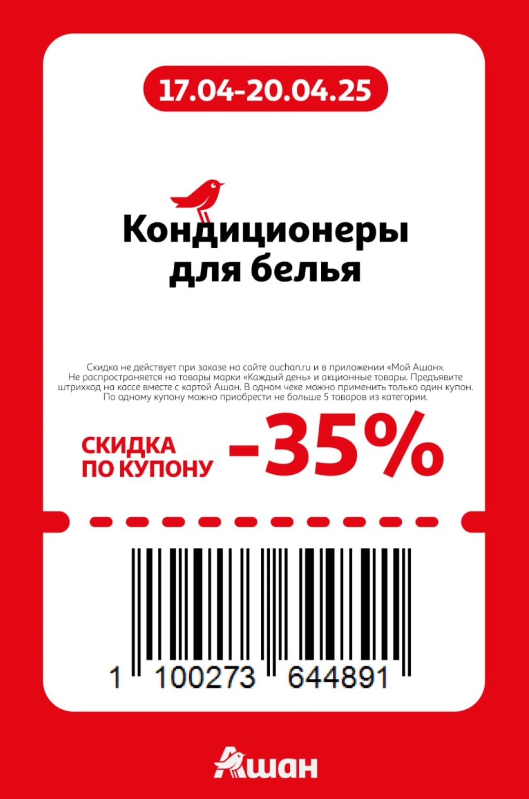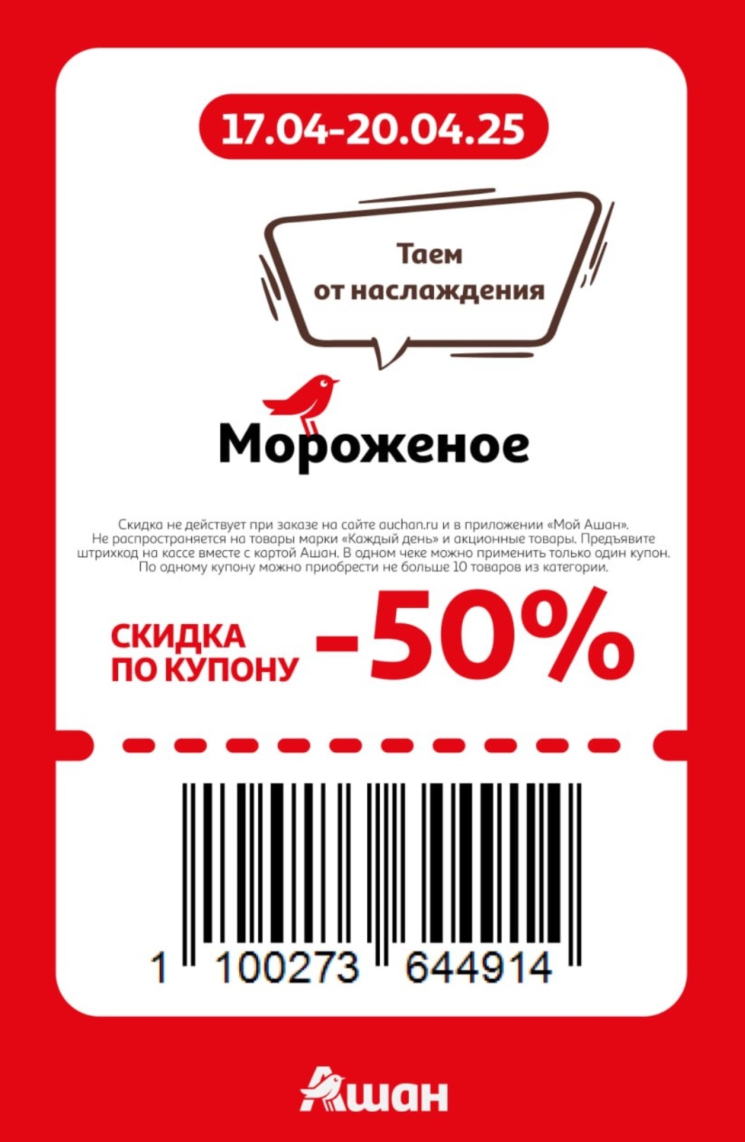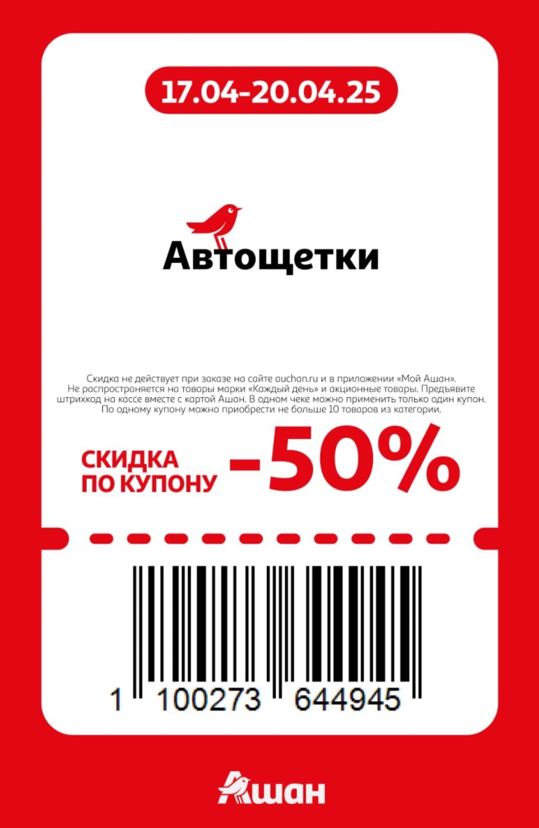 Представлены различные товары, которые предлагаются по выгодным ценам в магазинах Ашан по акции с 17 по 20 апреля 2025 года. Наибольшая выгода — на аксессуары для смартфонов (50%), мороженое (50%), автощетки (50%). Рекомендуем заранее спланировать покупки, чтобы максимально использовать чудо купоны.