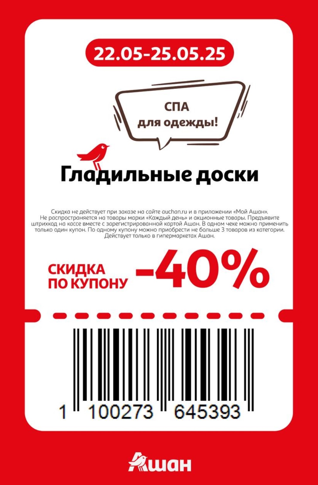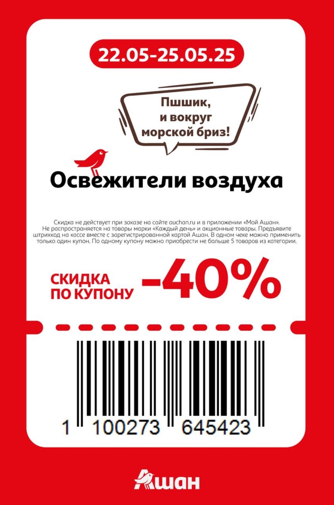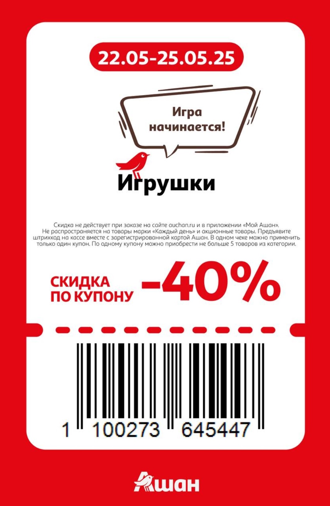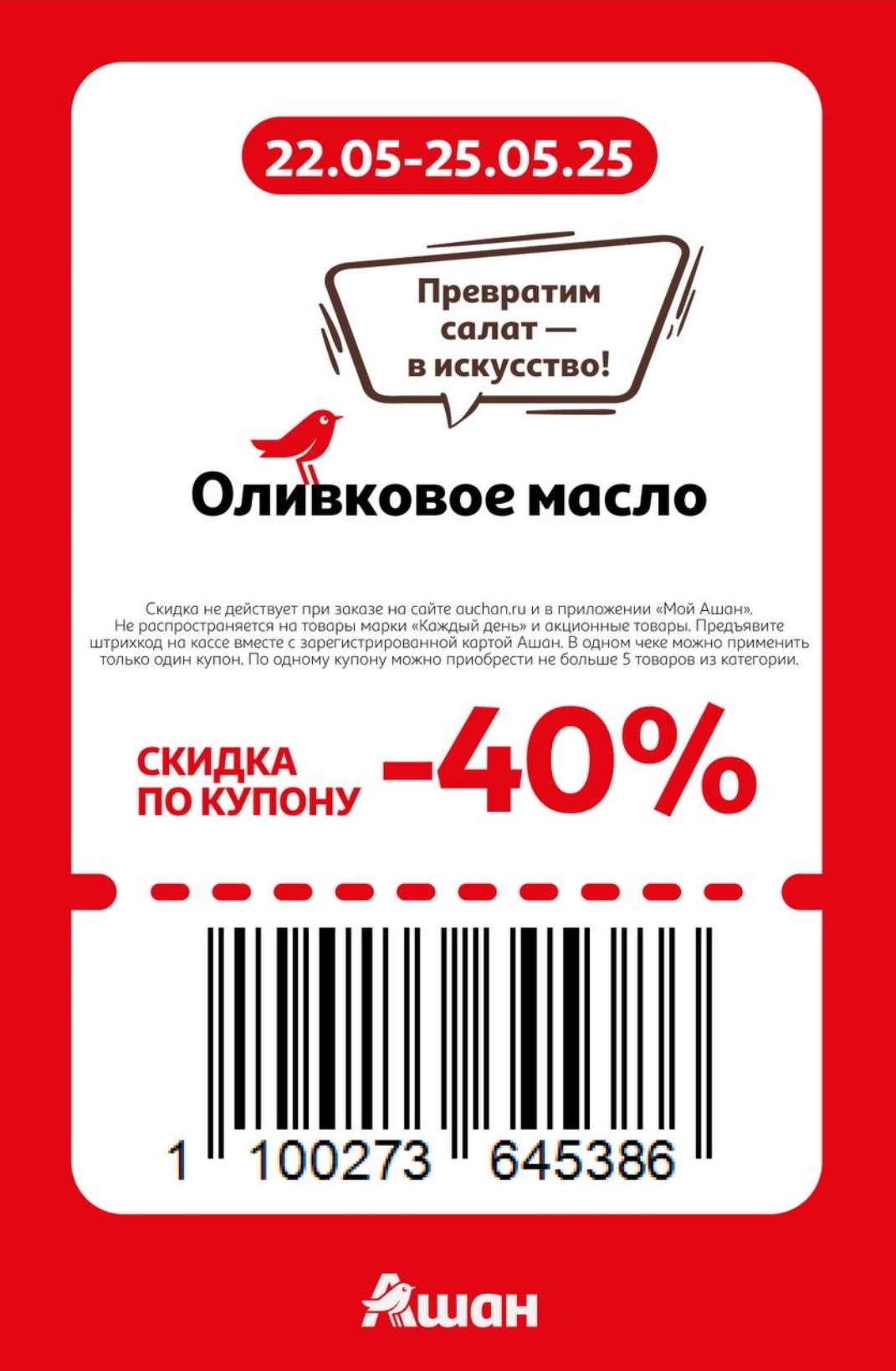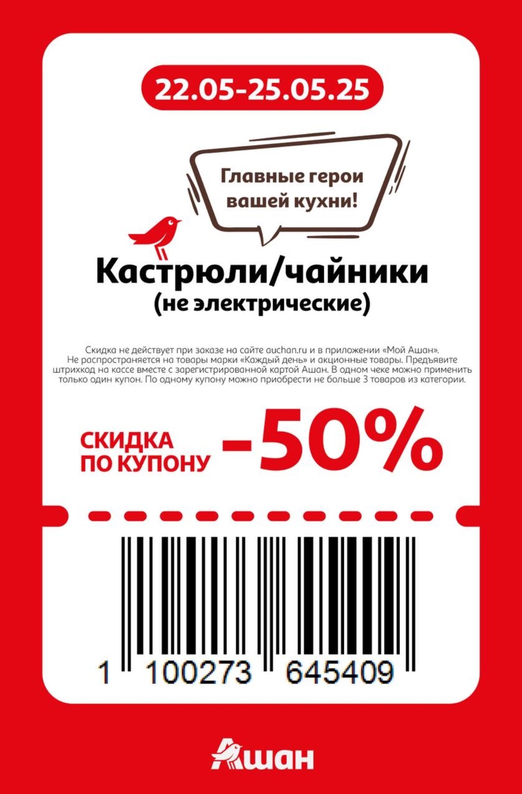 Представлены различные товары, которые предлагаются по выгодным ценам в магазинах Ашан по акции с 22 по 25 мая 2025 года. Наибольшая выгода — на кастрюли и не электрические чайники (50%), оливковое масло (40%), игрушки (40%). Рекомендуем заранее спланировать покупки, чтобы максимально использовать чудо купоны.