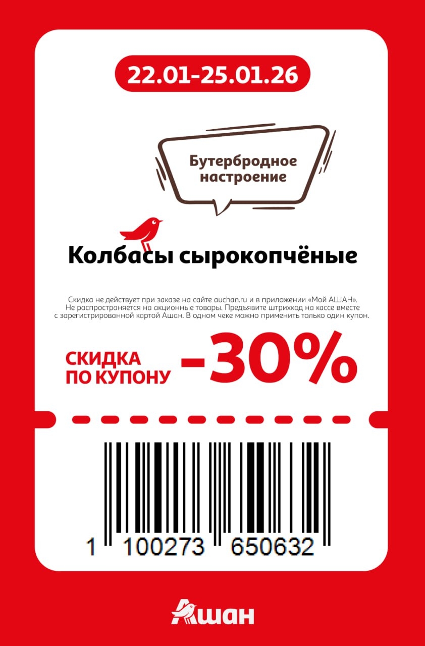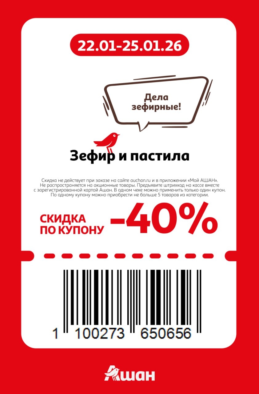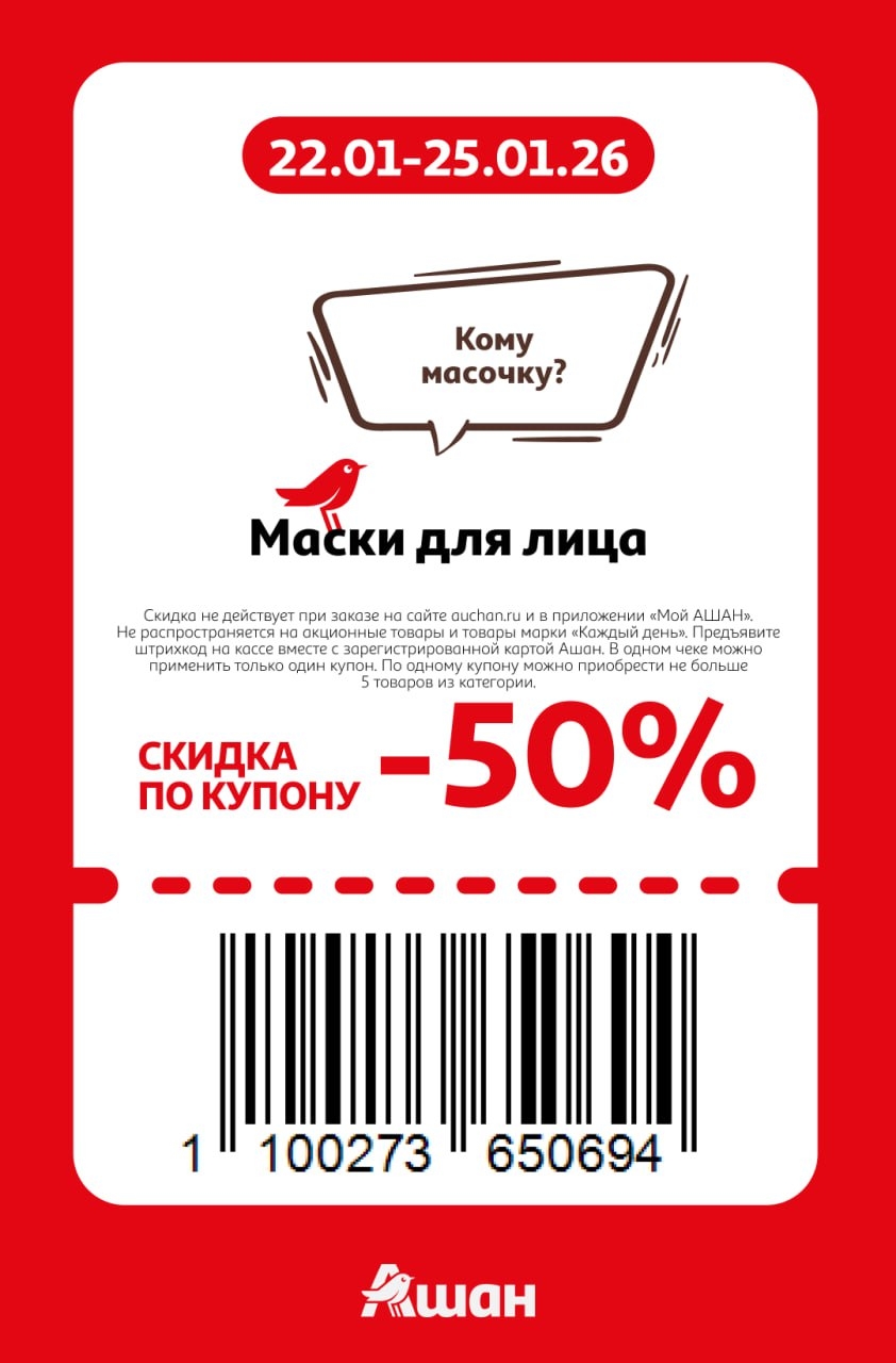 Представлены различные товары, которые предлагаются по выгодным ценам в магазинах Ашан по акции с 22 января — 25 января 2026 года. Наибольшая выгода — парфюмерию (50%), маски для лица (50%), зефир и пастила (40%). Рекомендуем заранее спланировать покупки, чтобы максимально использовать чудо купоны.