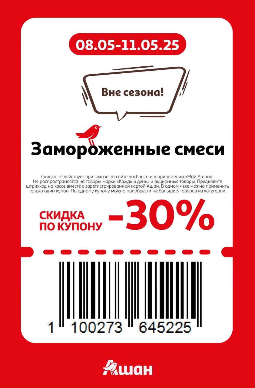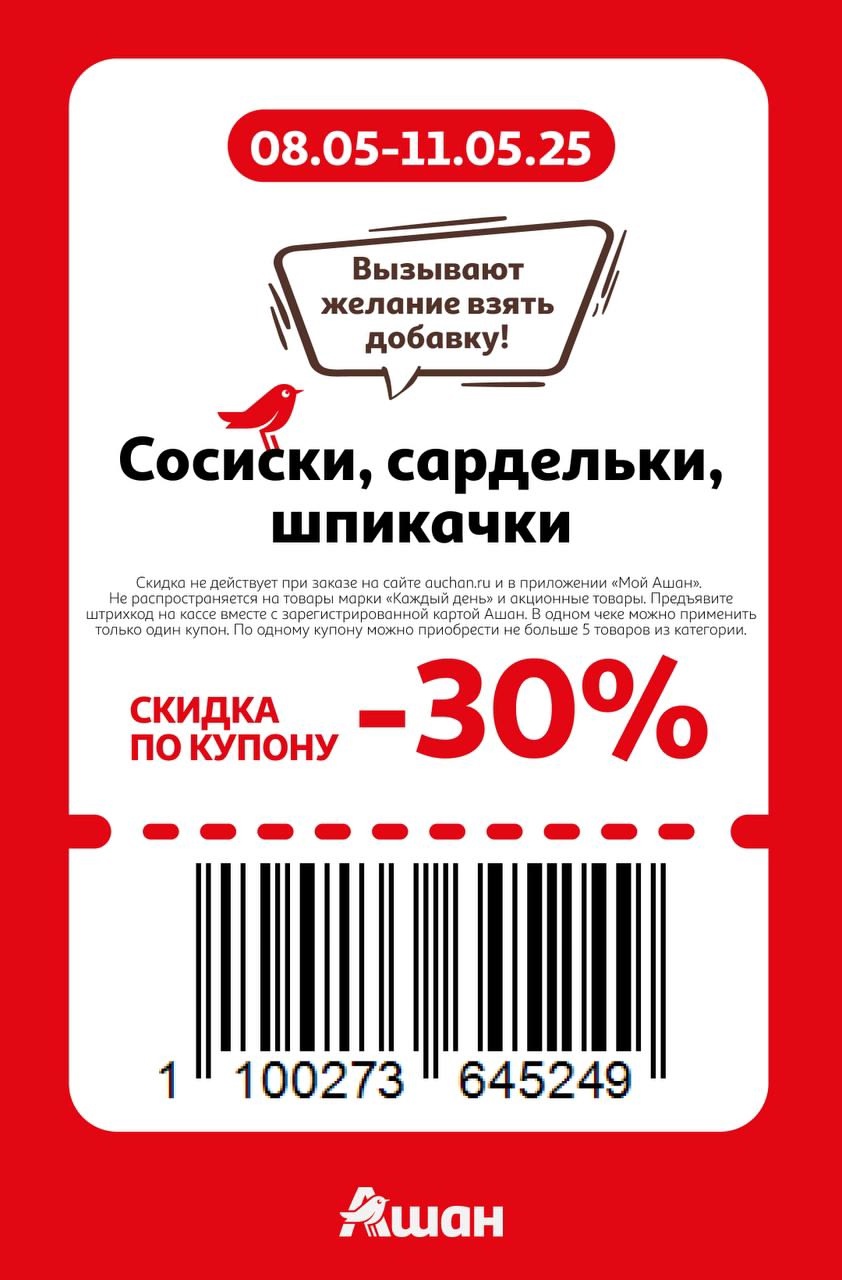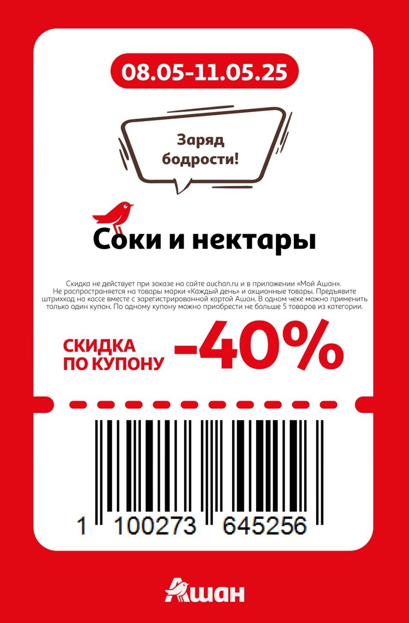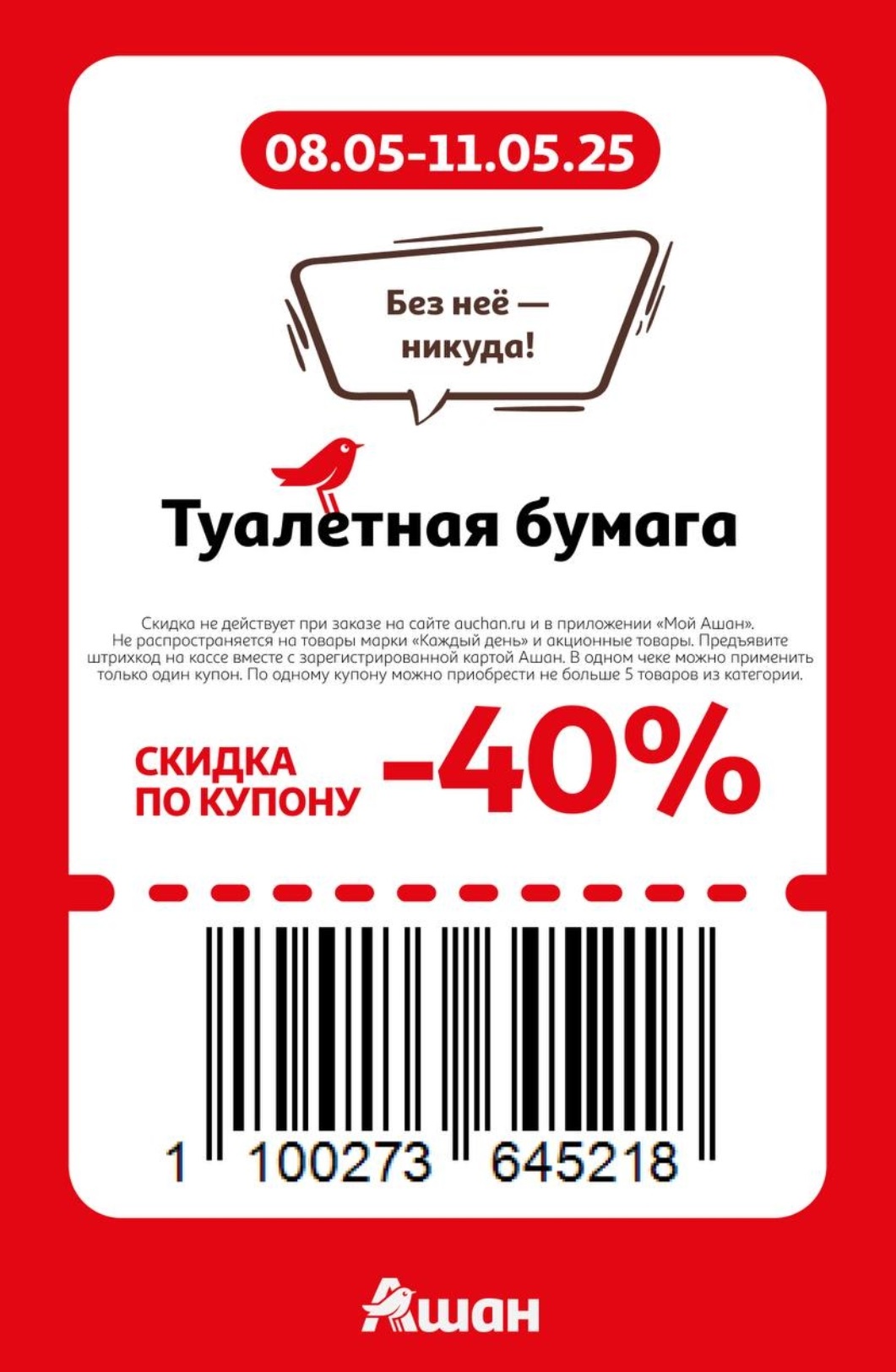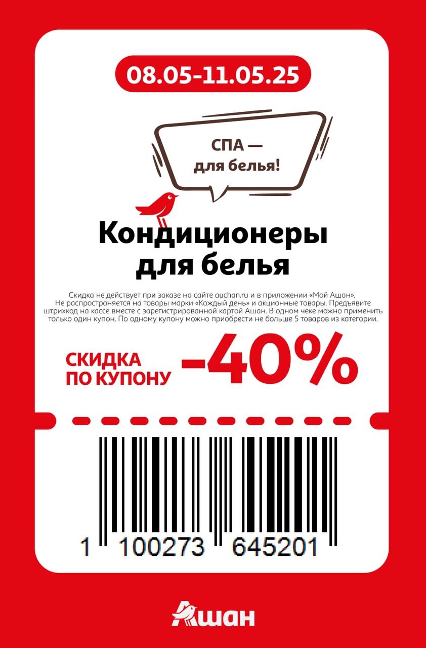 Представлены различные товары, которые предлагаются по выгодным ценам в магазинах Ашан по акции с 8 по 14 мая 2025 года. Наибольшая выгода — на туалетную бумагу (40%), кондиционеры для белья (40%), соки и нектары (40%). Рекомендуем заранее спланировать покупки, чтобы максимально использовать чудо купоны.