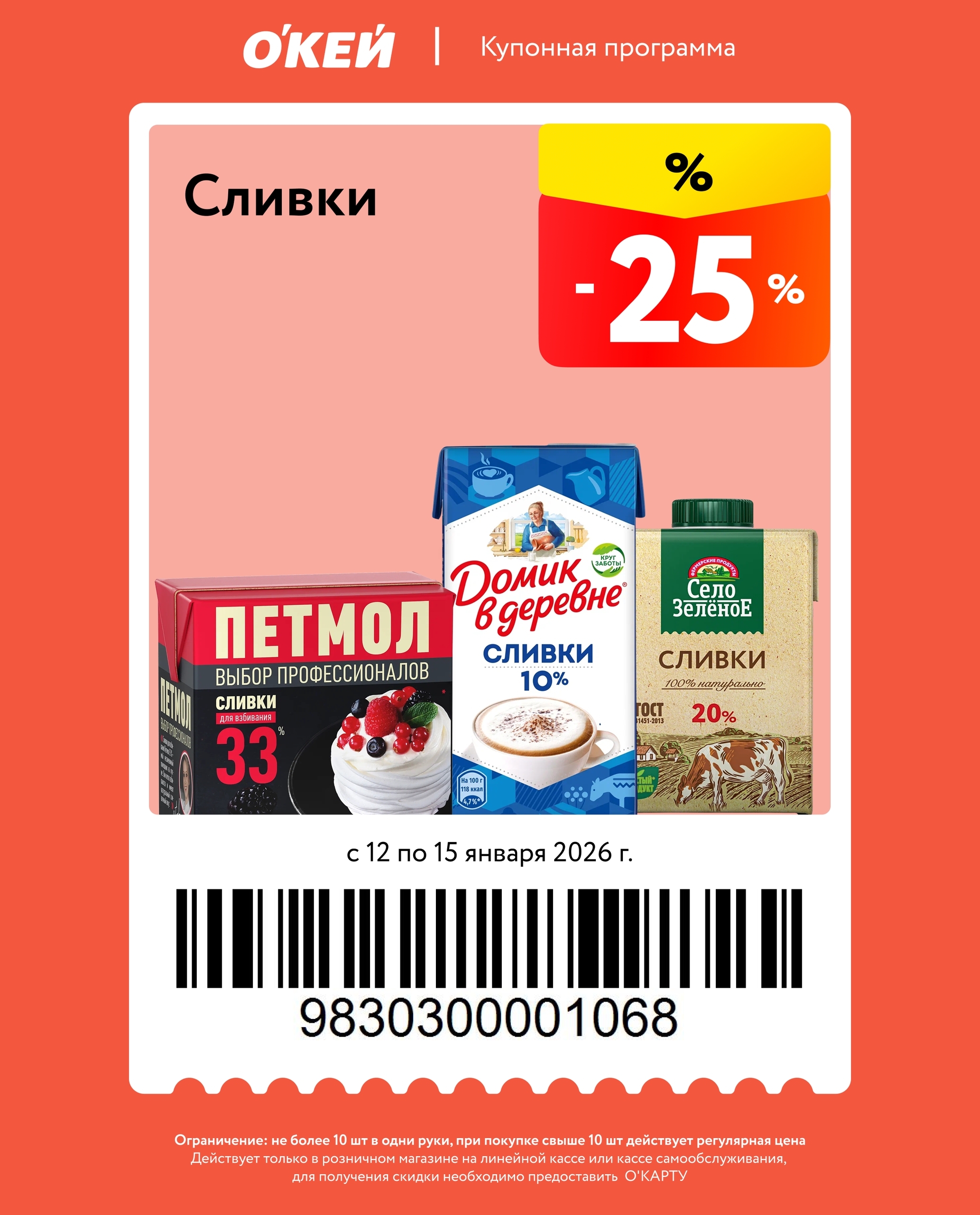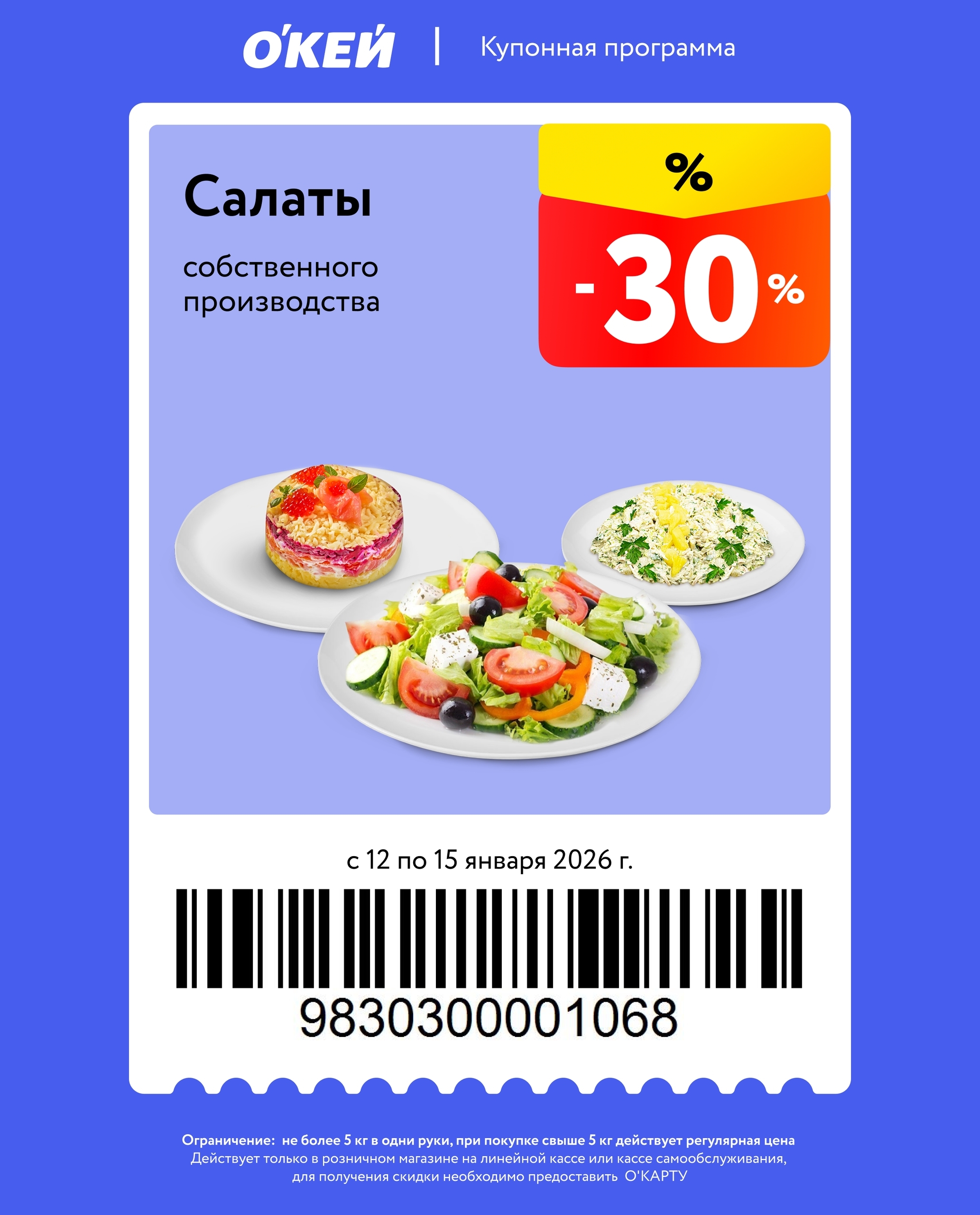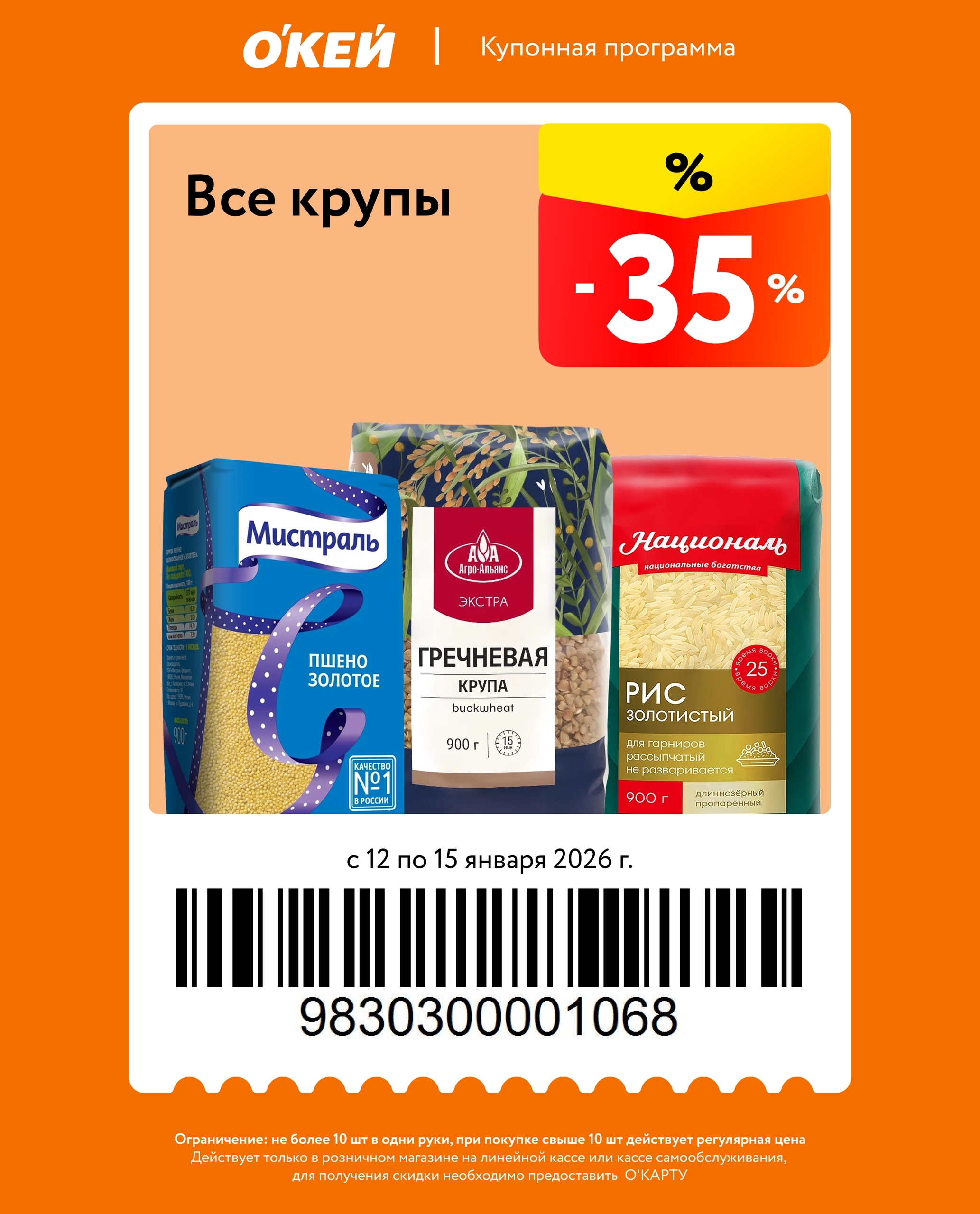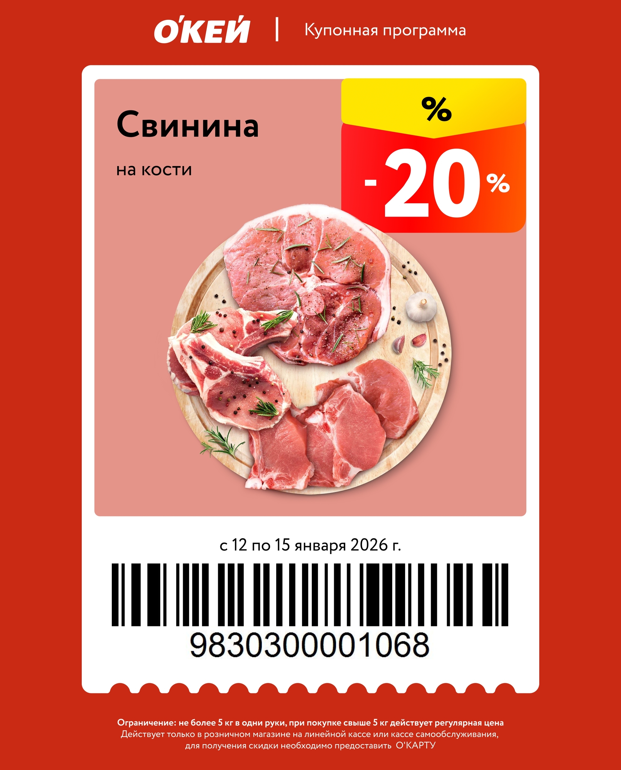 Представлены различные товары, которые предлагаются по выгодным ценам в магазинах Окей по акции с 12 января — 15 января 2026 года. Наибольшая выгода — напитки (50%), все крупы (35%), свинину (20%). Купонная программа действует при предъявлении карты магазина.