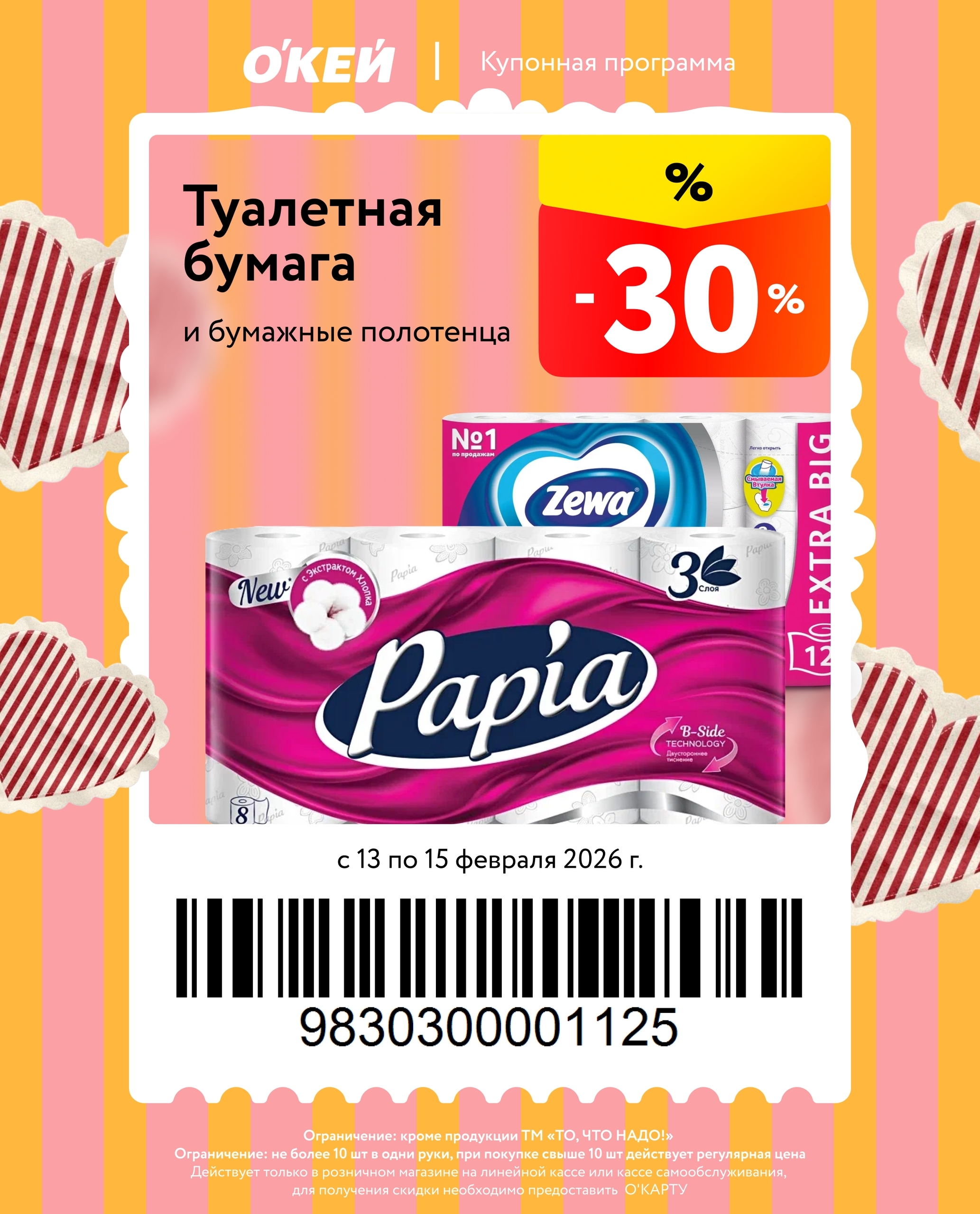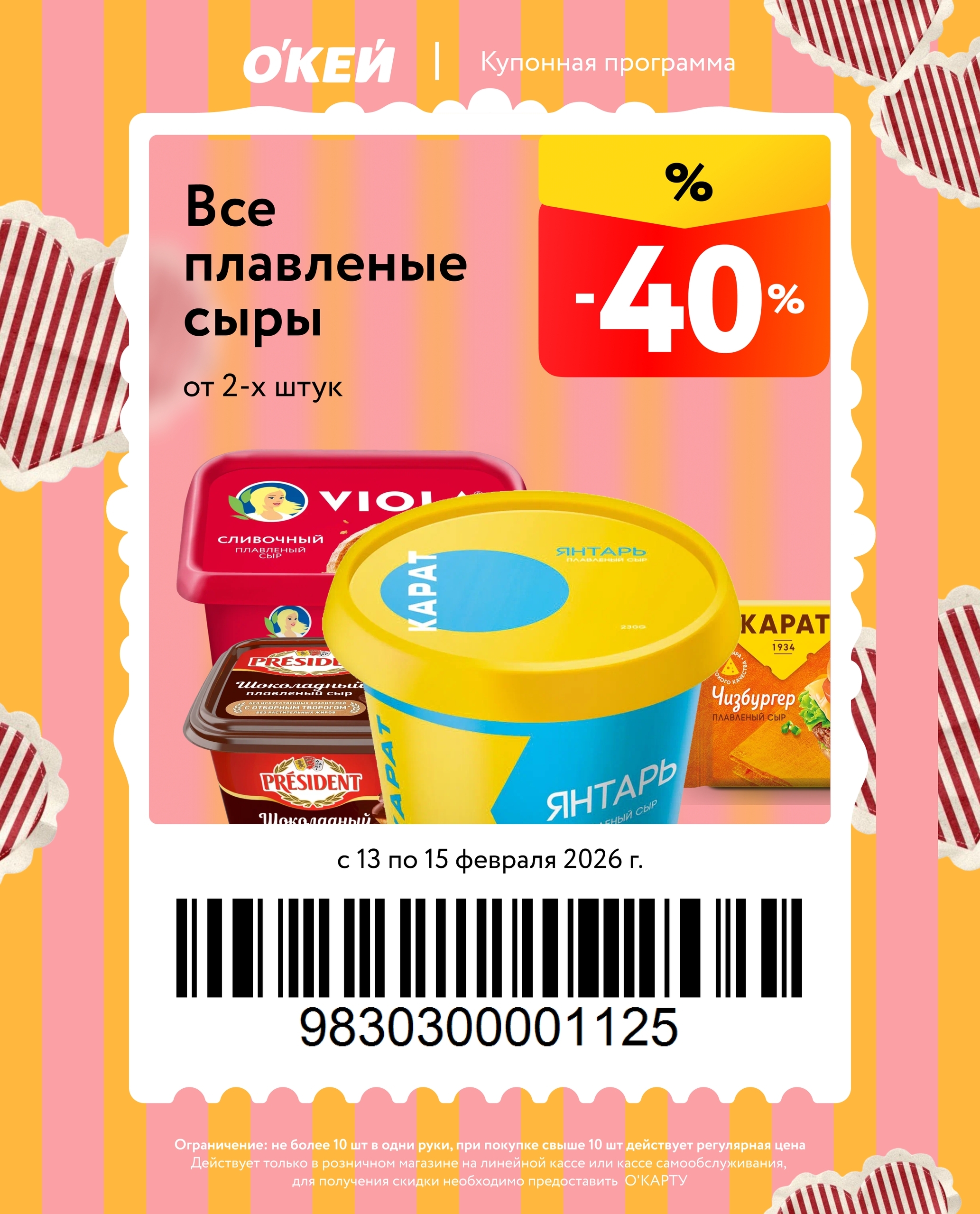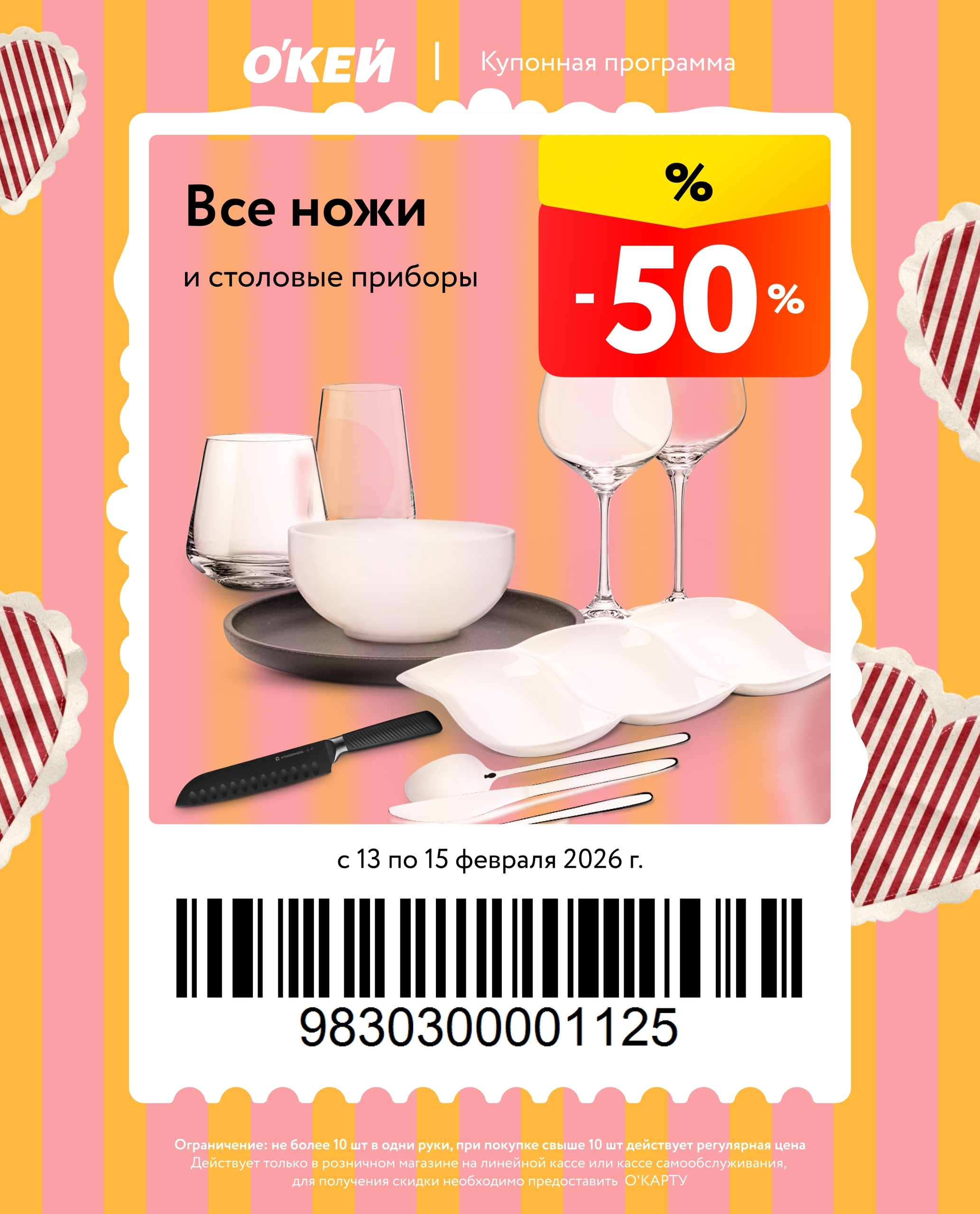 Представлены различные товары, которые предлагаются по выгодным ценам в магазинах Окей по акции с 13 февраля — 15 февраля 2026 года. Наибольшая выгода — блинчики (50%), ножи и столовые приборы (50%), креветки (40%). Купонная программа действует при предъявлении карты магазина.