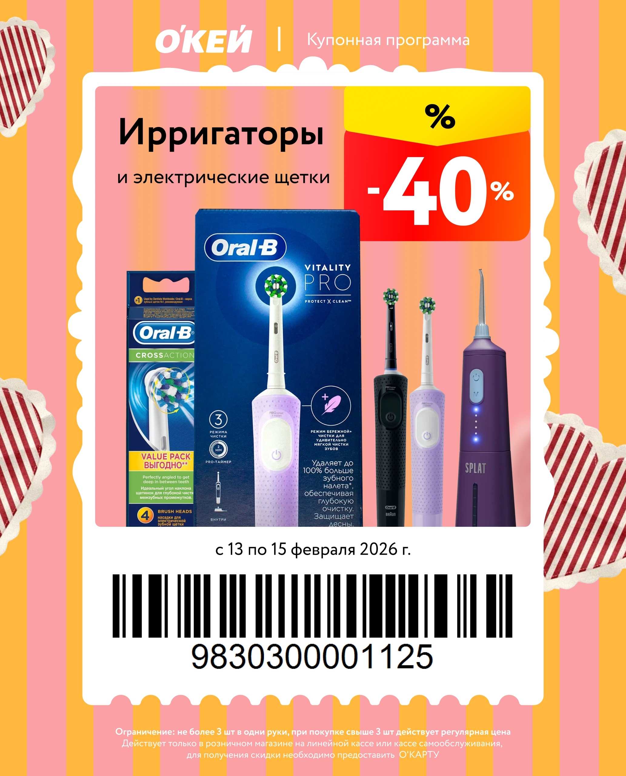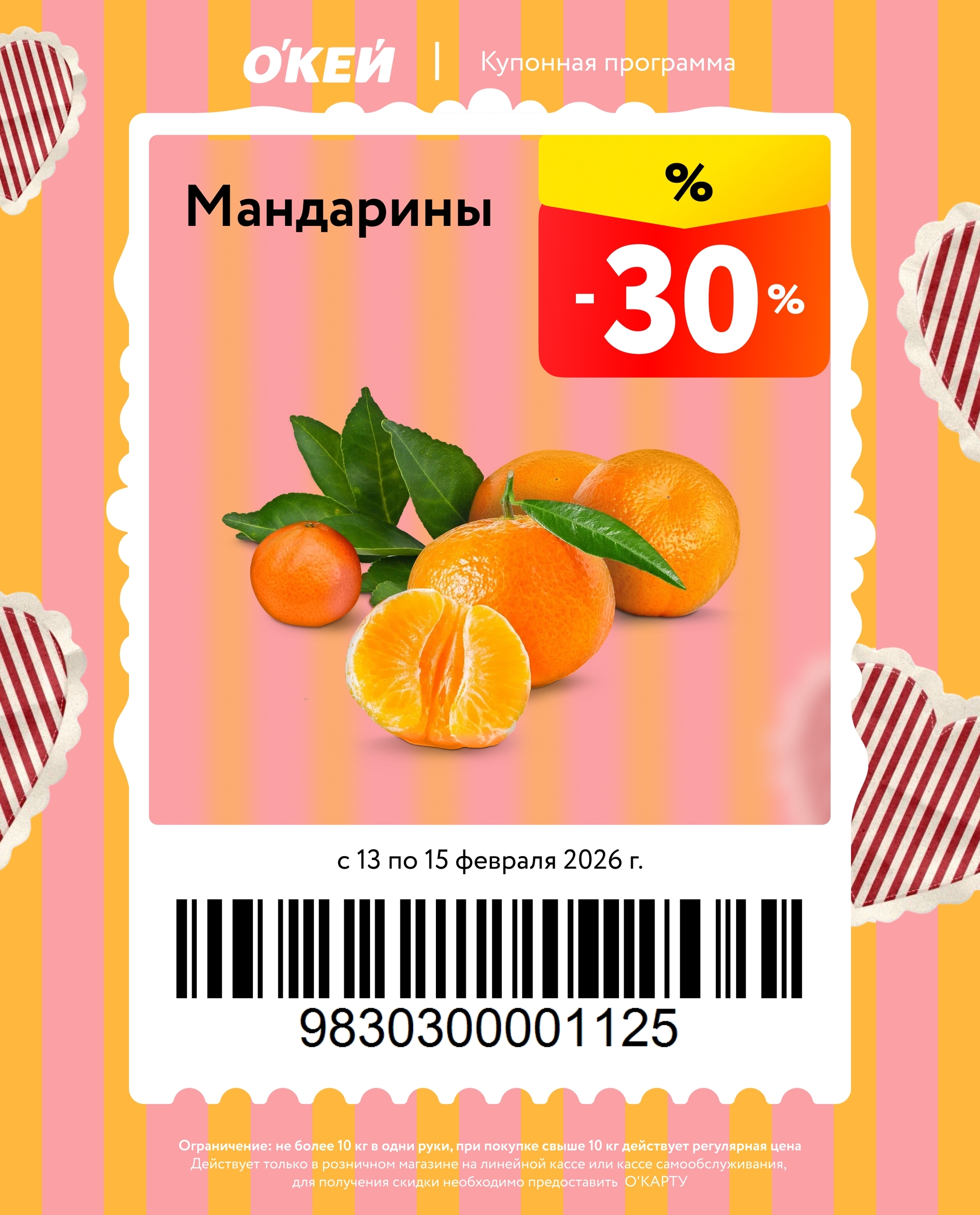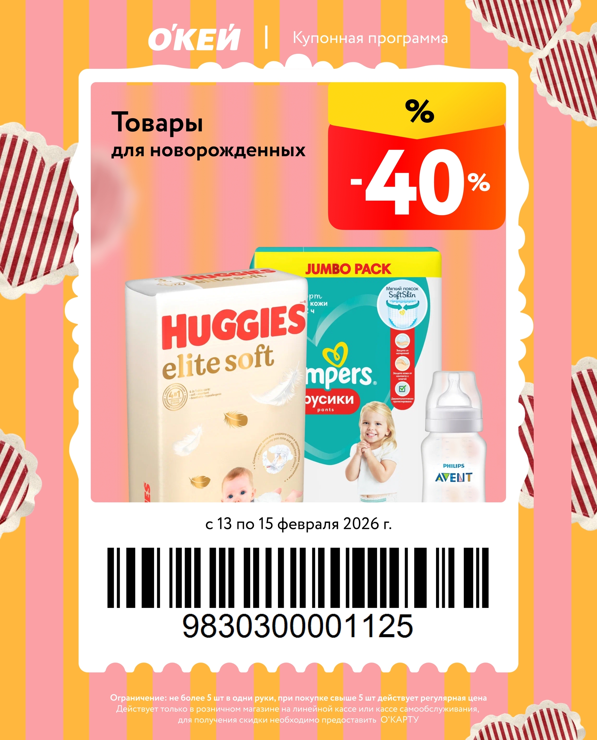 Представлены различные товары, которые предлагаются по выгодным ценам в магазинах Окей по акции с 13 февраля — 15 февраля 2026 года. Наибольшая выгода — блинчики (50%), ножи и столовые приборы (50%), креветки (40%). Купонная программа действует при предъявлении карты магазина.