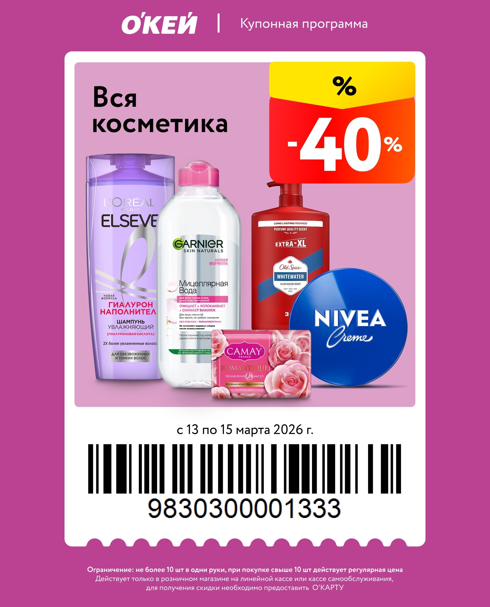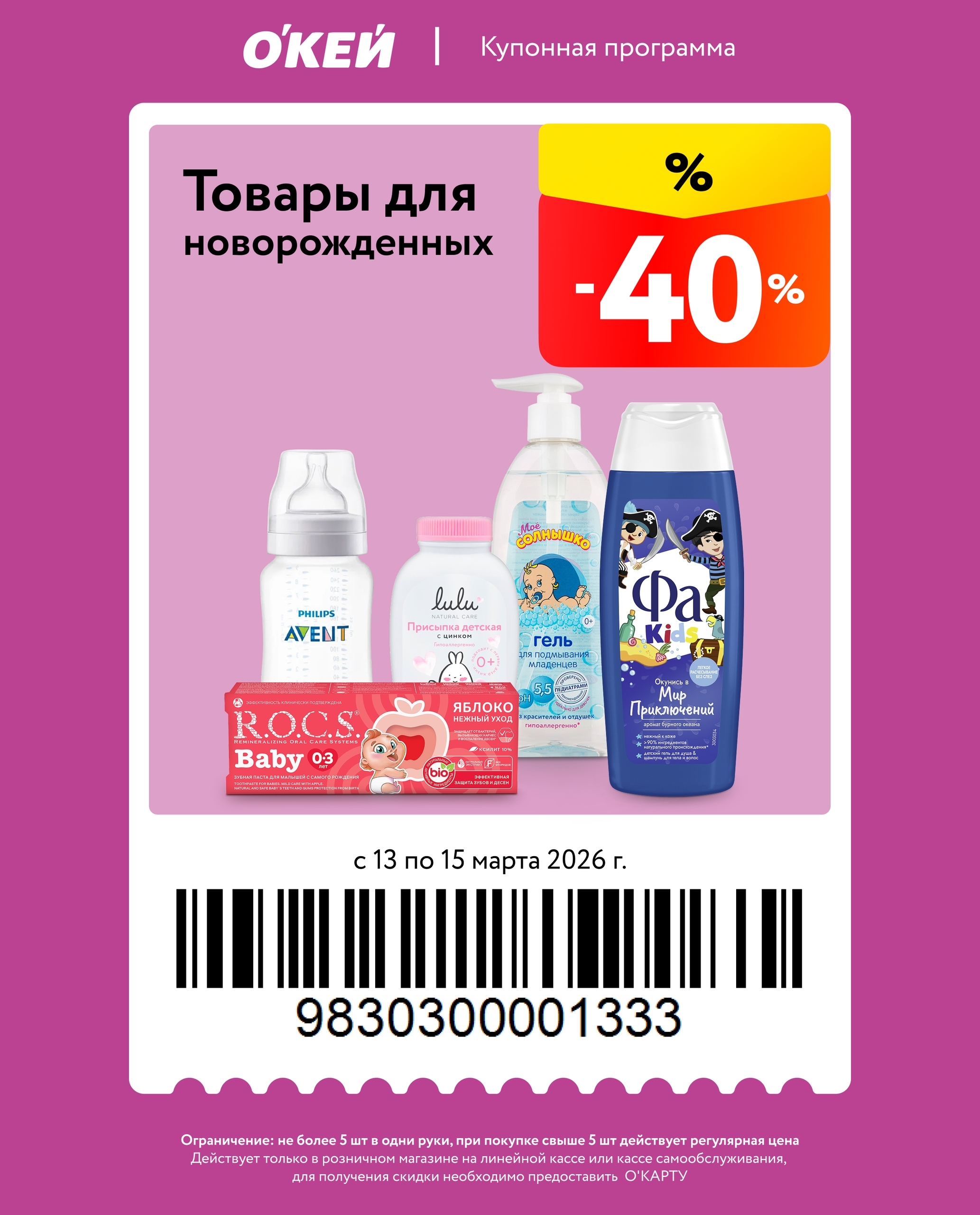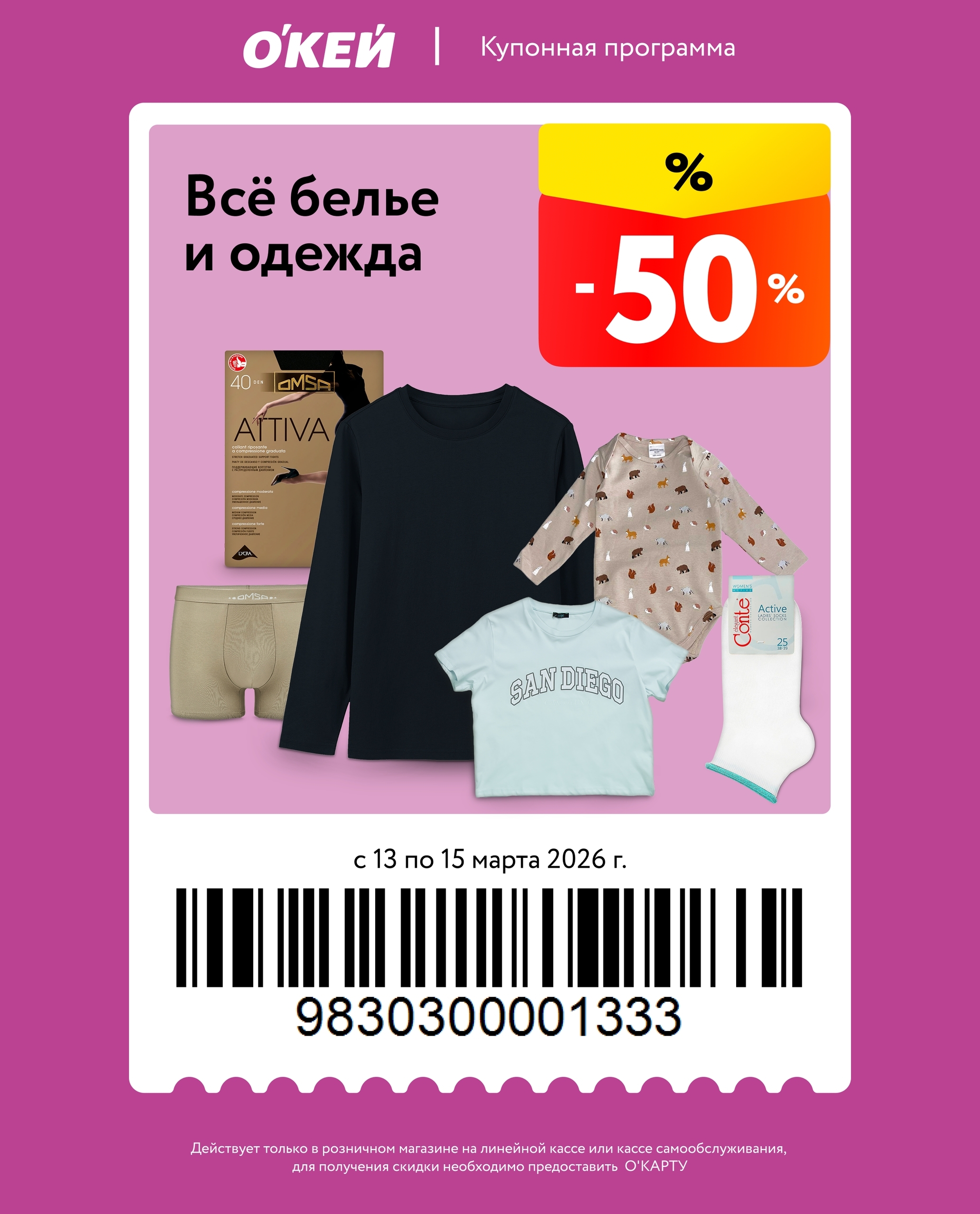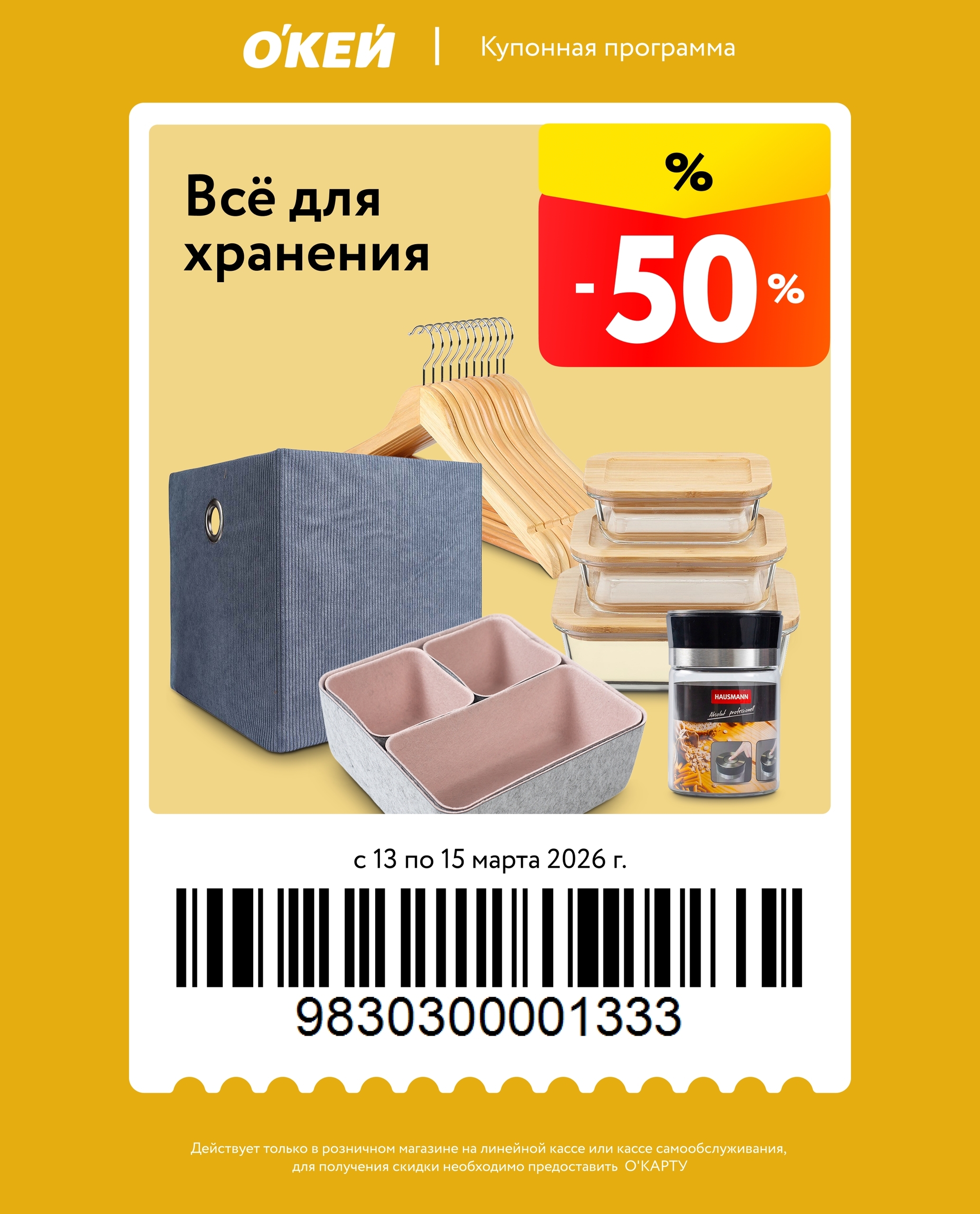 Представлены различные товары, которые предлагаются по выгодным ценам в магазинах Окей по акции с 13 марта — 15 марта 2026 года. Наибольшая выгода — белье и одежда (50%), все для хранения (50%), товары для новорожденных (40%). Купонная программа действует при предъявлении карты магазина.