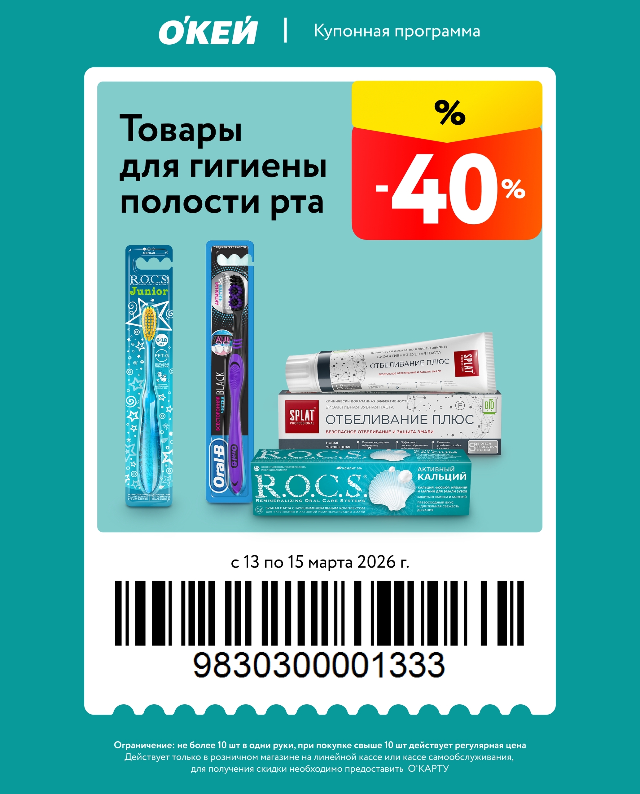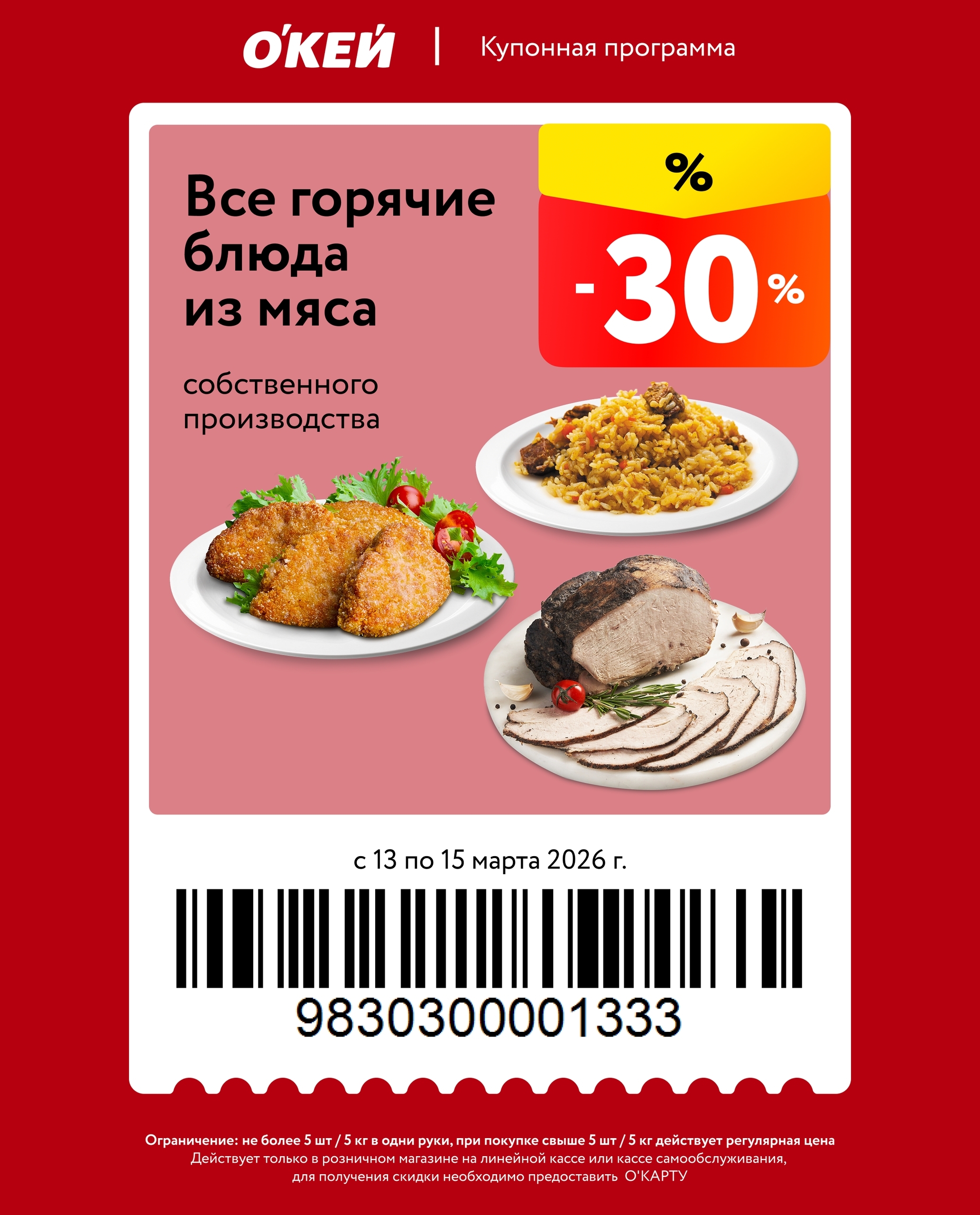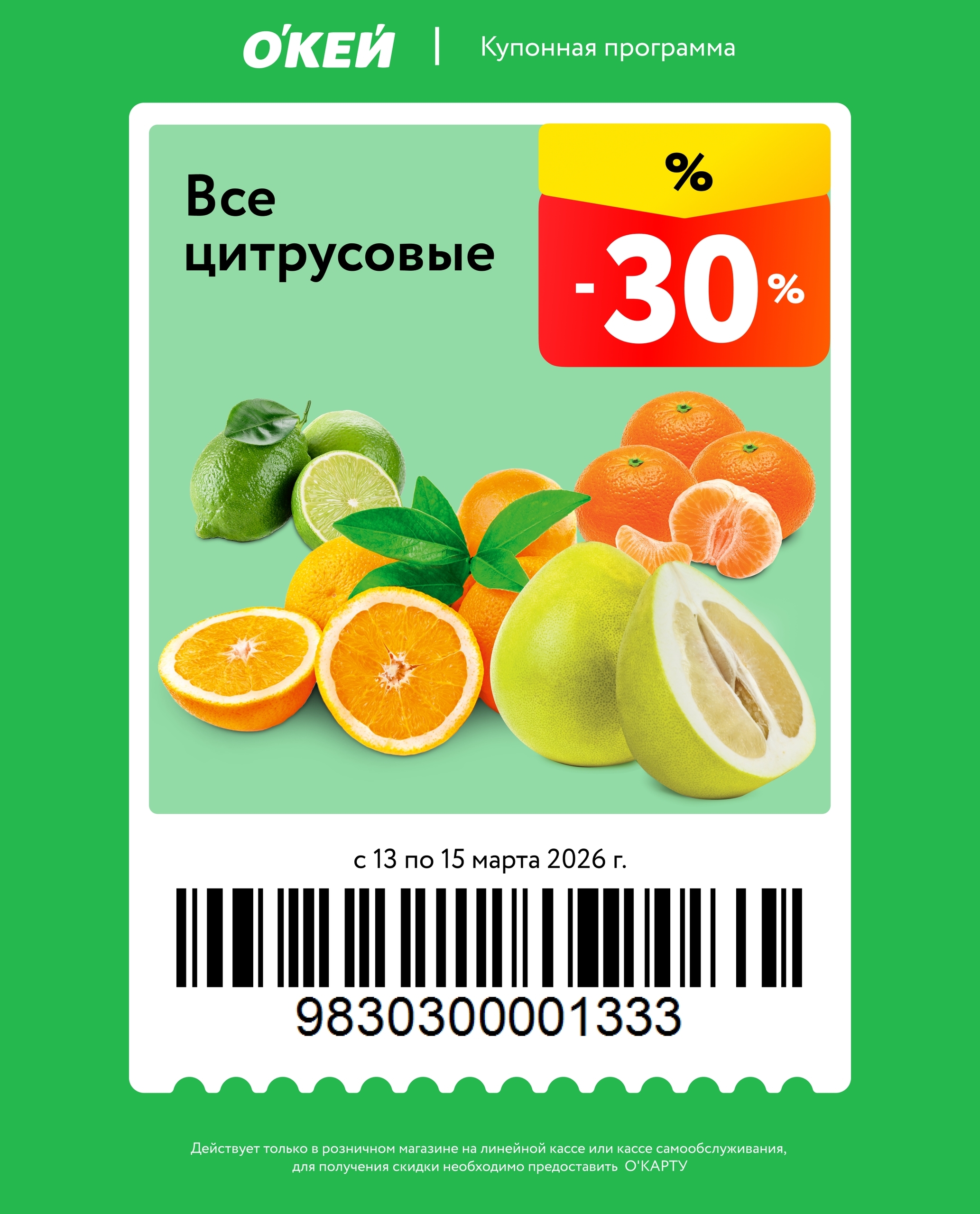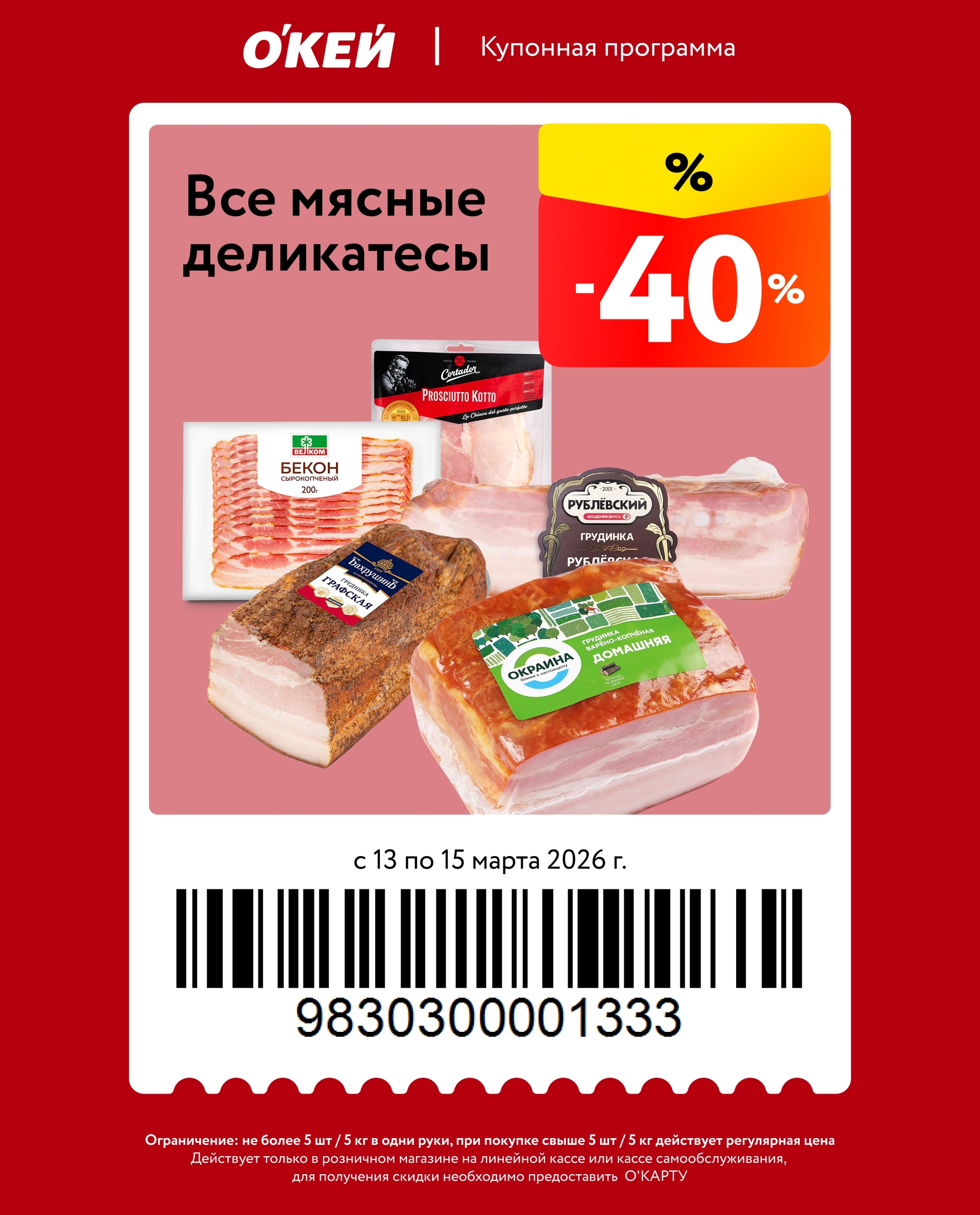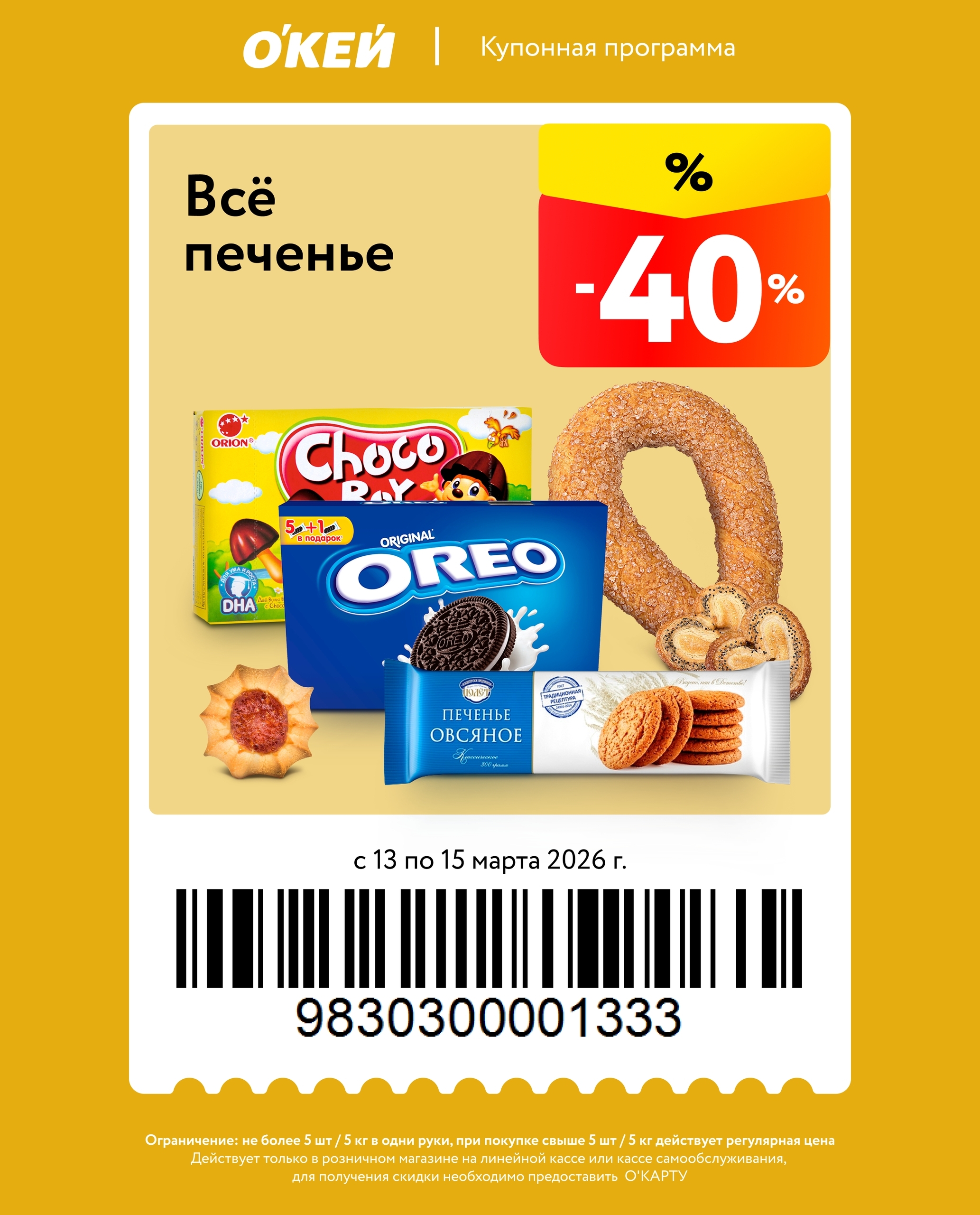 Представлены различные товары, которые предлагаются по выгодным ценам в магазинах Окей по акции с 13 марта — 15 марта 2026 года. Наибольшая выгода — белье и одежда (50%), все для хранения (50%), товары для новорожденных (40%). Купонная программа действует при предъявлении карты магазина.