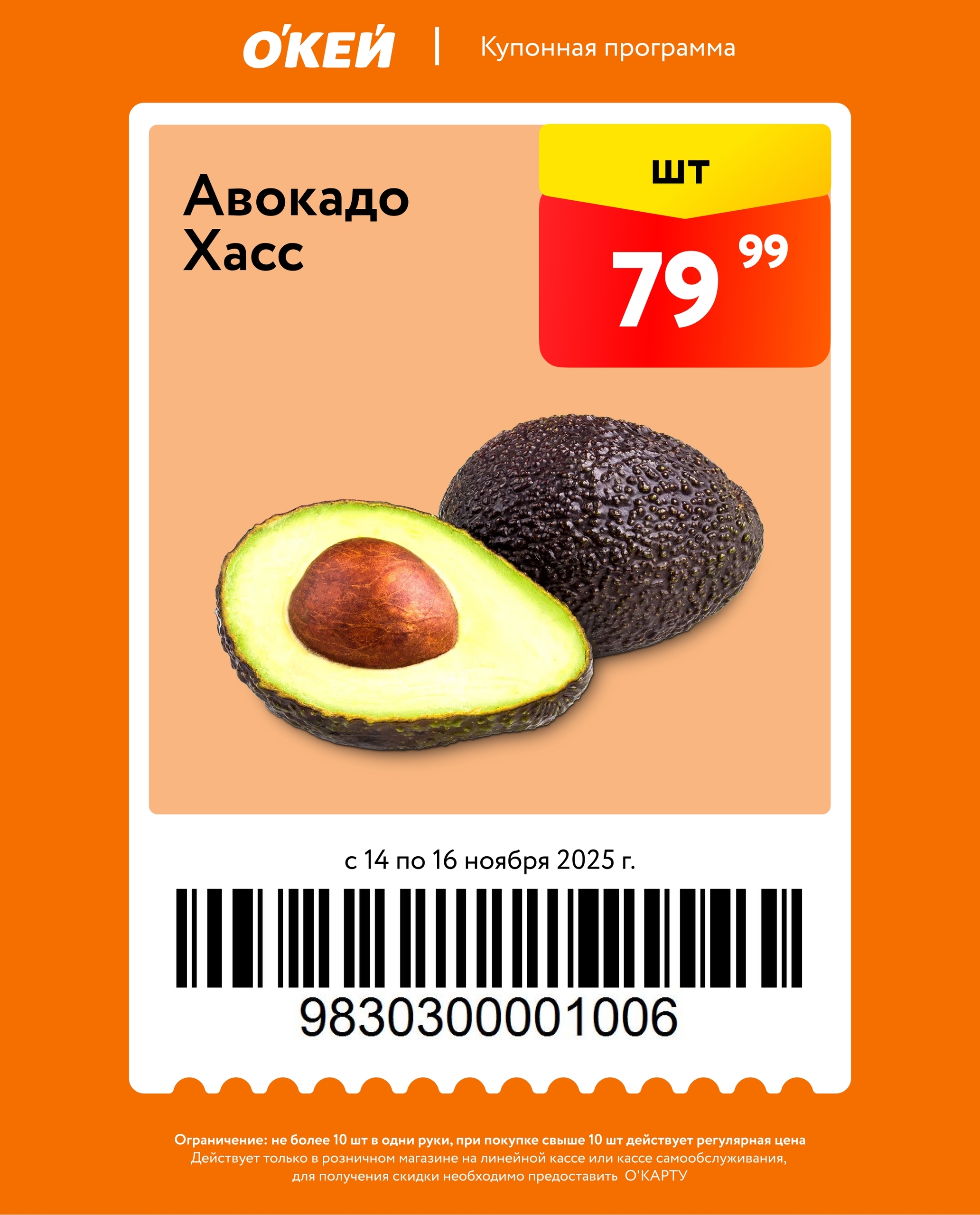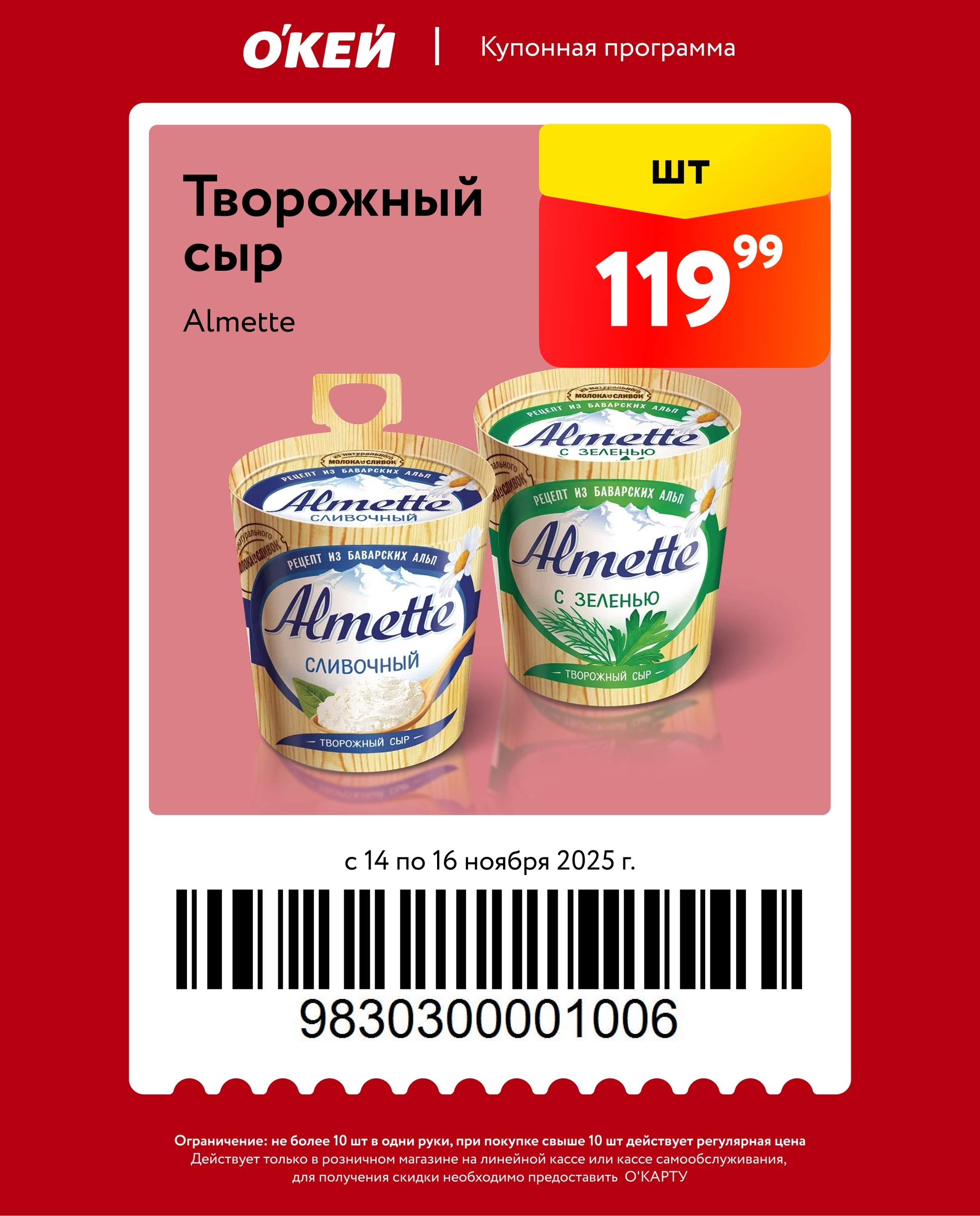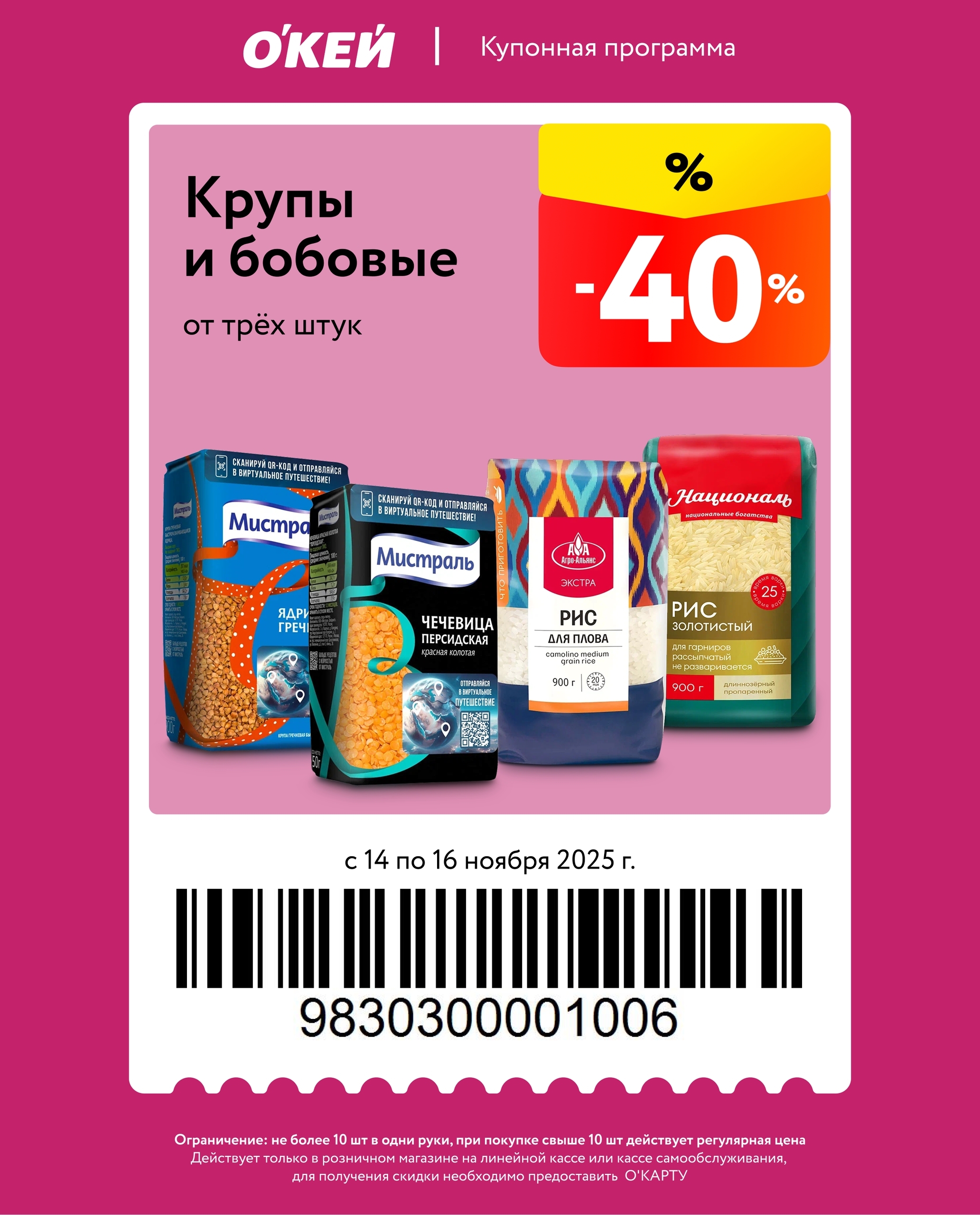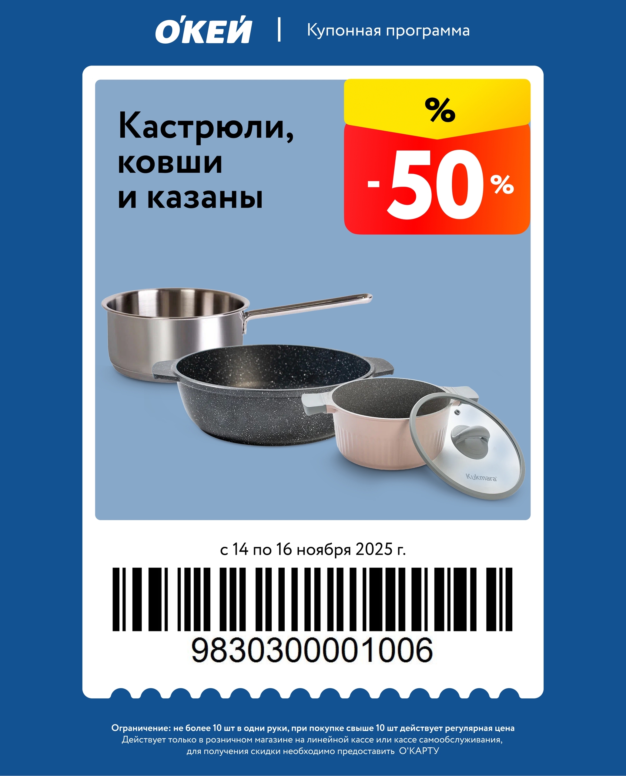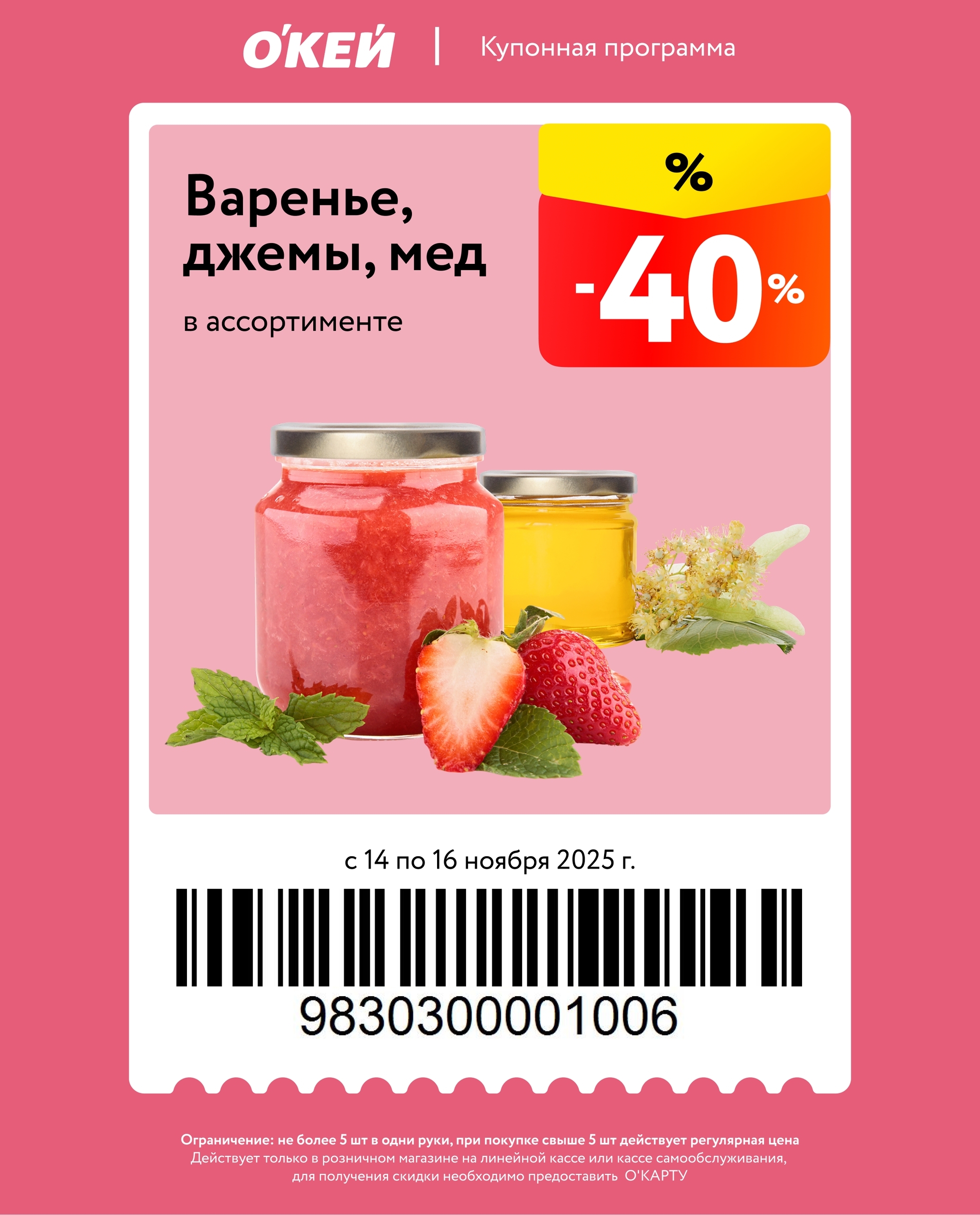 Представлены различные товары, которые предлагаются по выгодным ценам в магазинах Окей по акции с 14 ноября — 16 ноября 2025 года. Наибольшая выгода — кастрюли и казаны (50%), варенье, джемы, мед (40%), крупы и бобовые (40%). Купонная программа действует при предъявлении карты магазина.