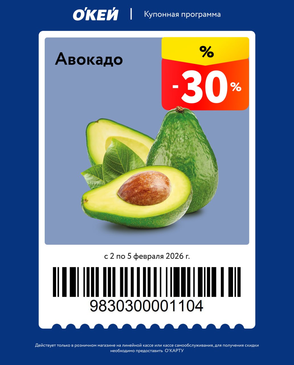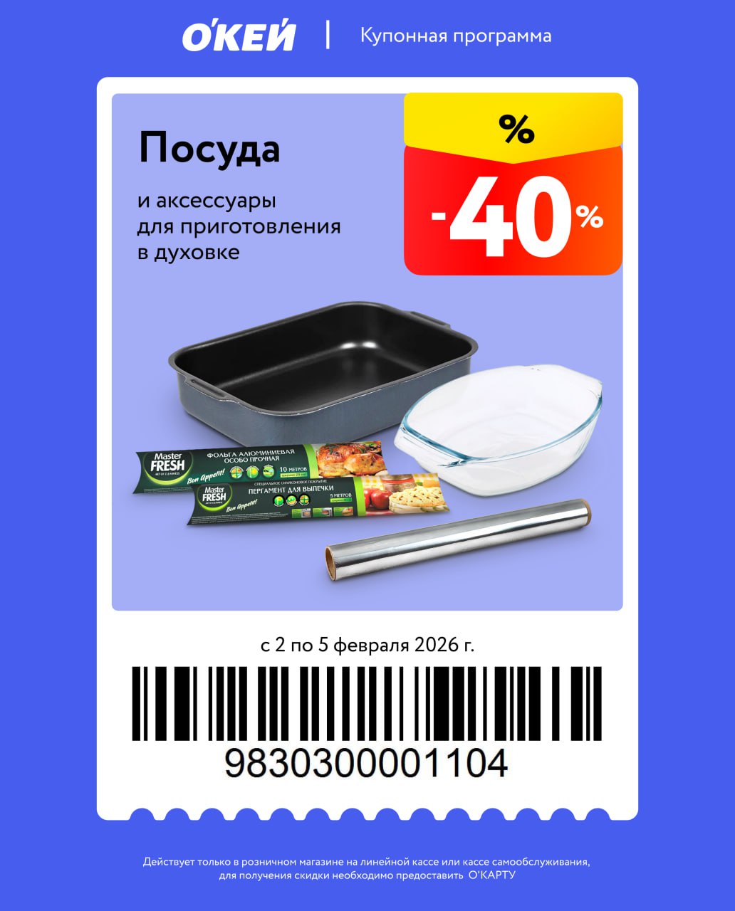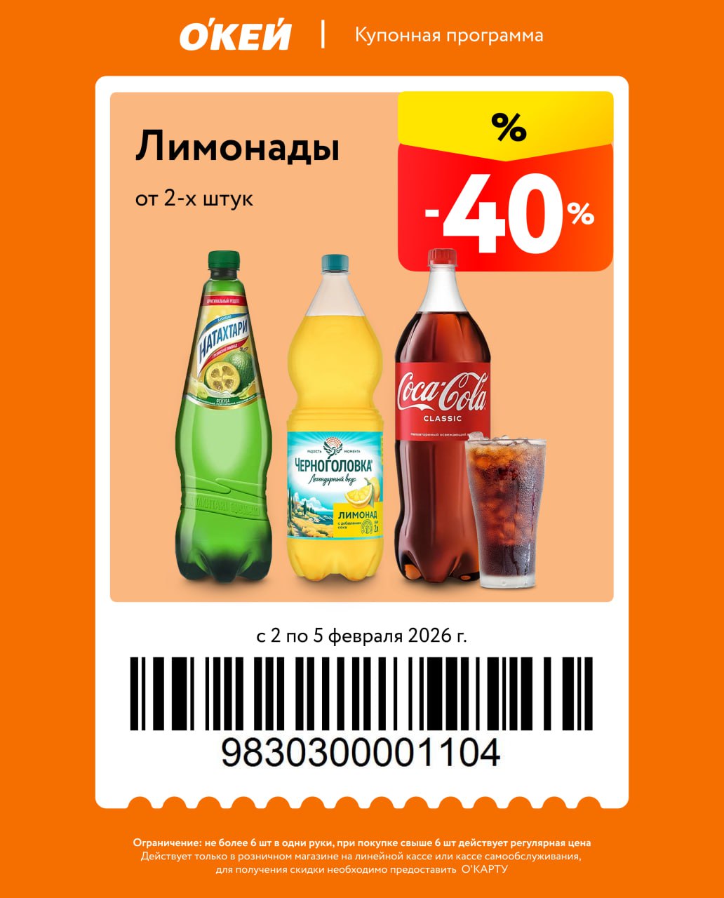 Представлены различные товары, которые предлагаются по выгодным ценам в магазинах Окей по акции с 2 февраля — 5 февраля 2026 года. Наибольшая выгода — кетчупы и соусы (50%), лимонады (40%), посуда (40%). Купонная программа действует при предъявлении карты магазина.