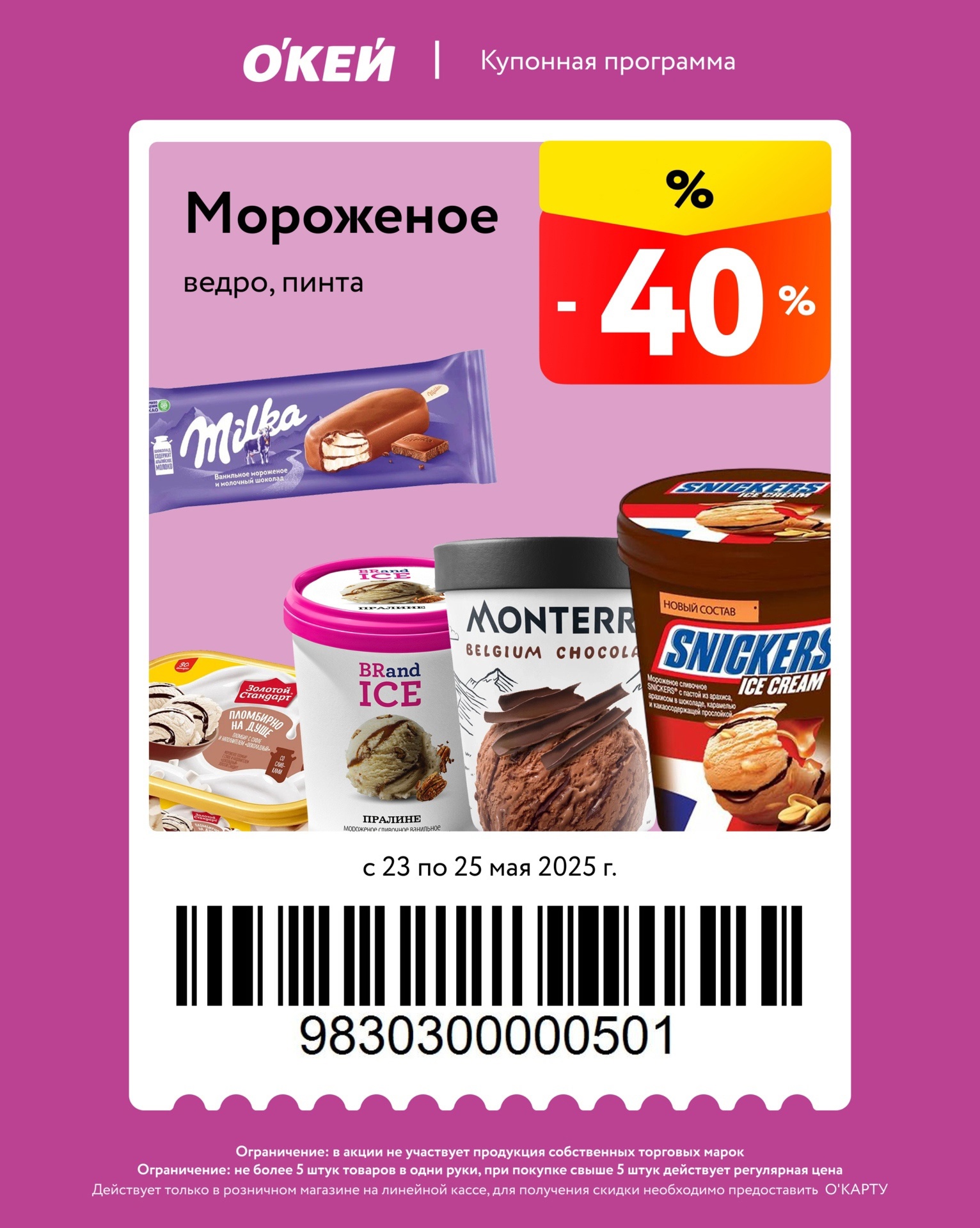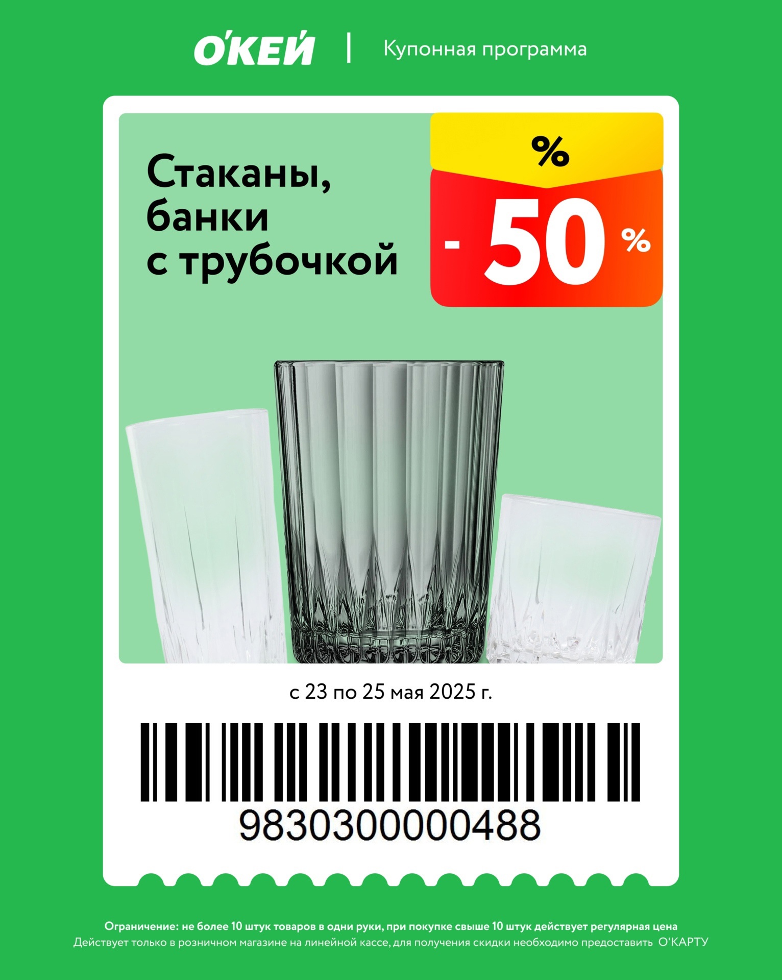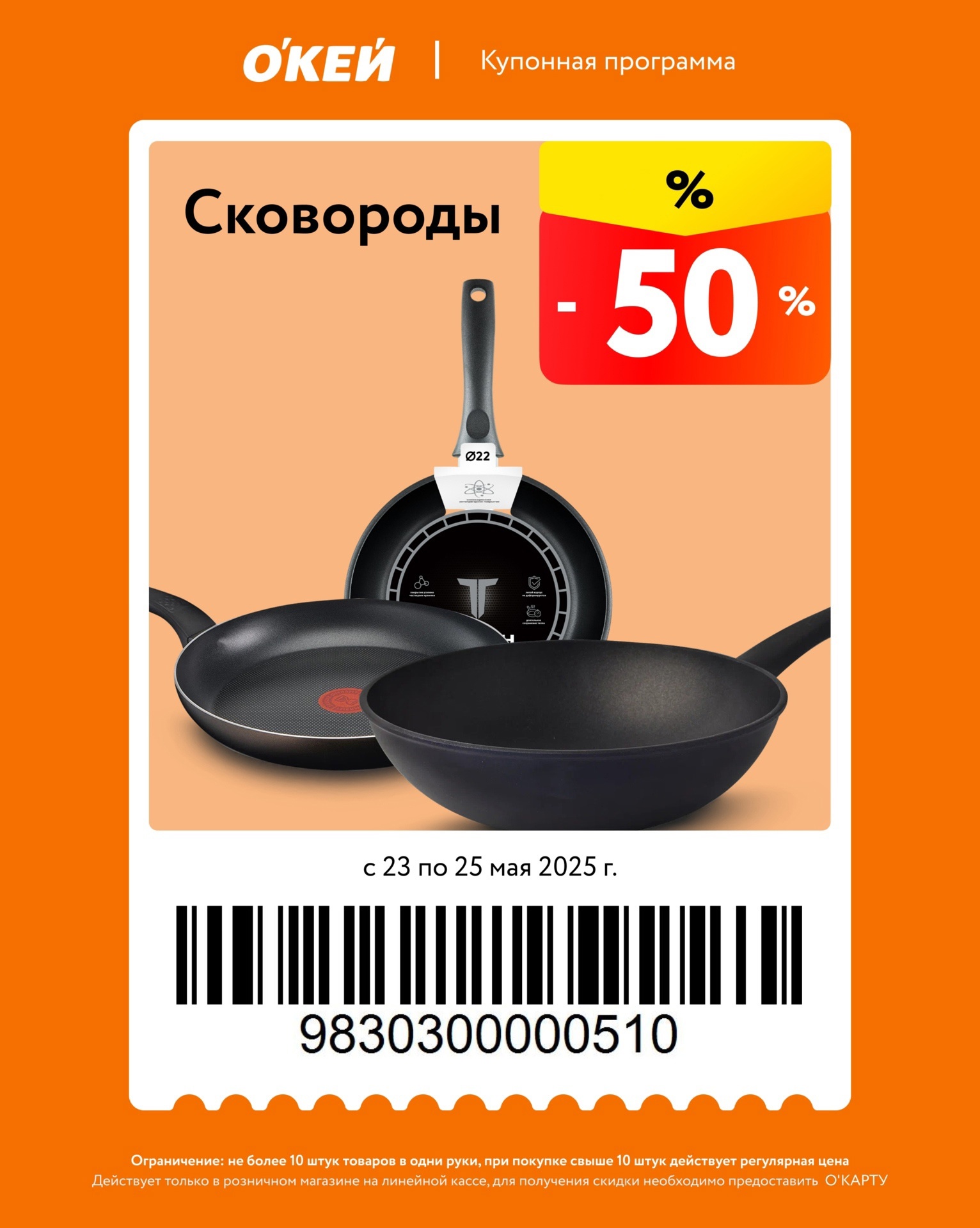 Представлены различные товары, которые предлагаются по выгодным ценам в магазинах Окей по акции с 23 по 25 мая 2025 года. Наибольшая выгода — на сковороды (50%), стаканы, банки (50%), мороженое (40%). Купонная программа действует при предъявлении карты магазина.