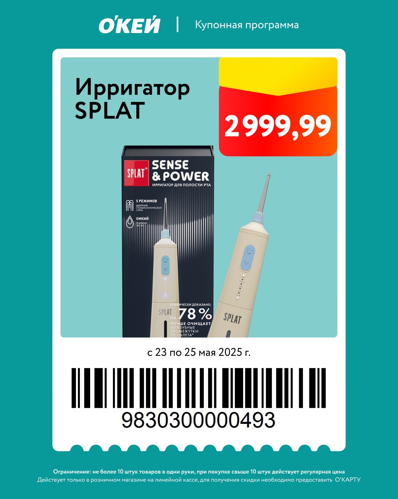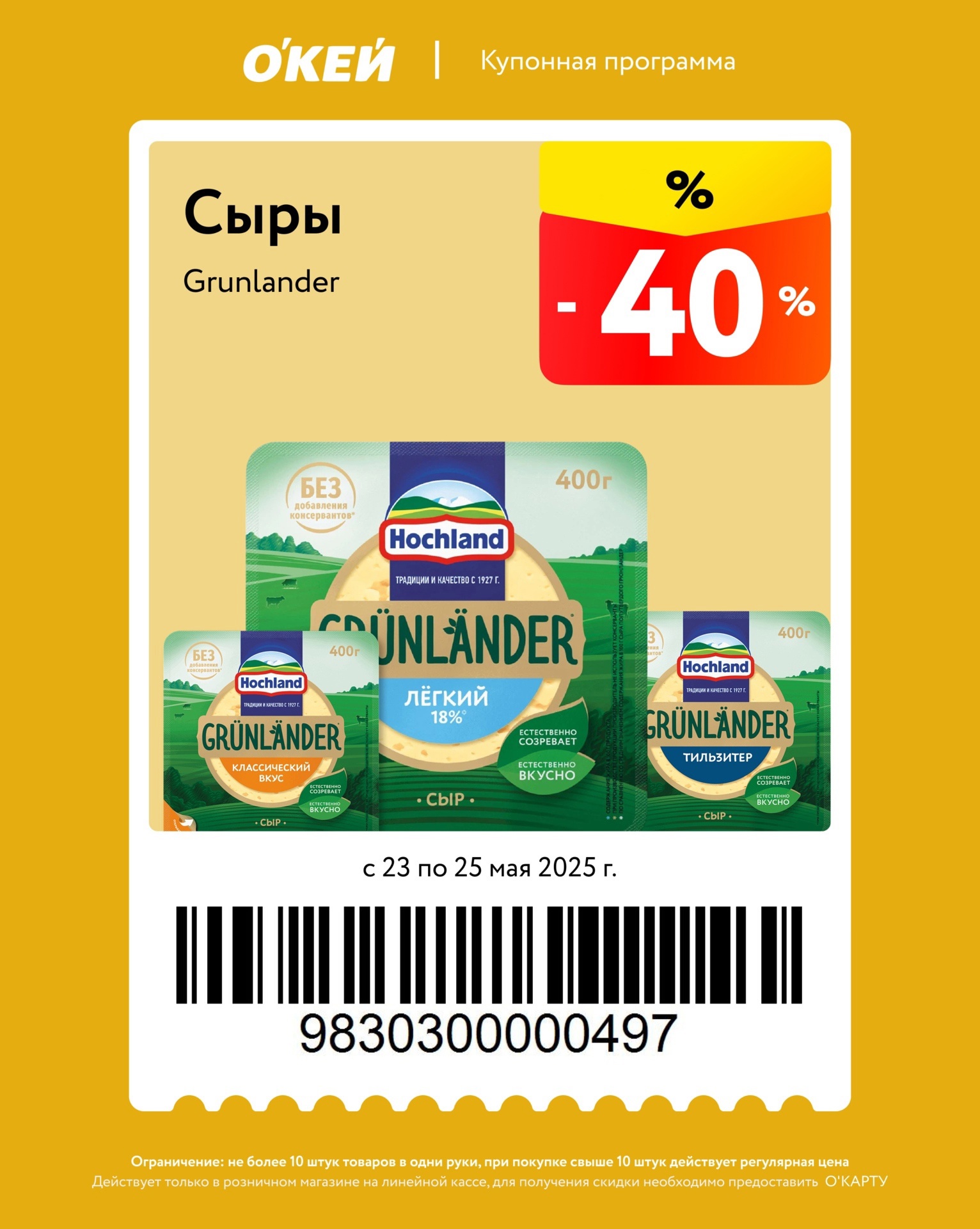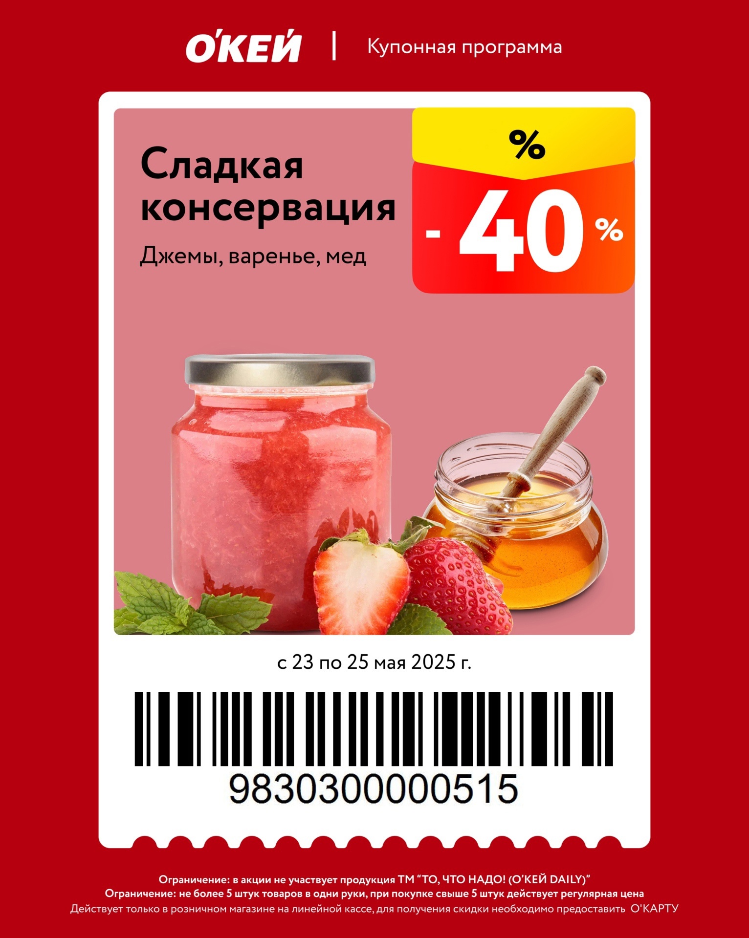 Представлены различные товары, которые предлагаются по выгодным ценам в магазинах Окей по акции с 23 по 25 мая 2025 года. Наибольшая выгода — на сковороды (50%), стаканы, банки (50%), мороженое (40%). Купонная программа действует при предъявлении карты магазина.