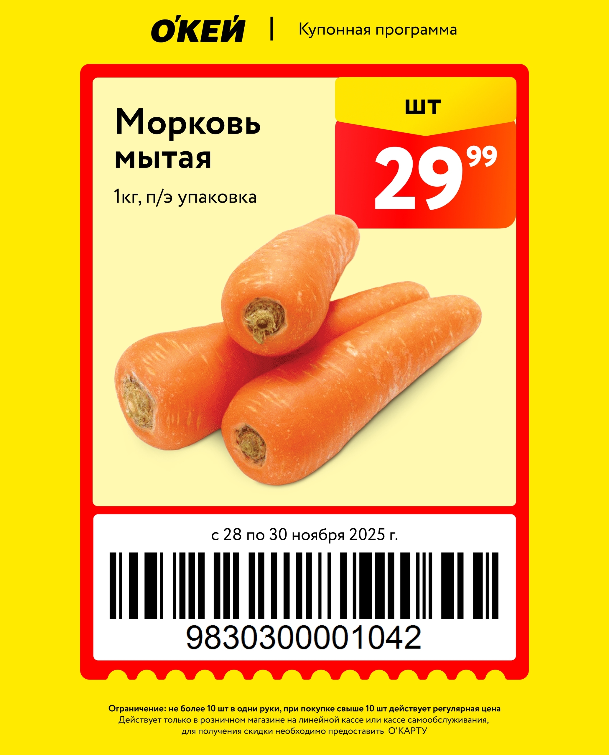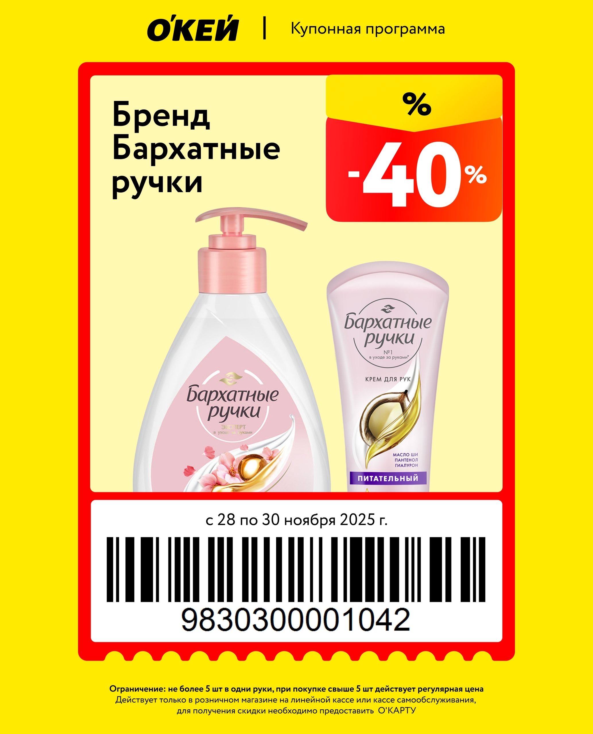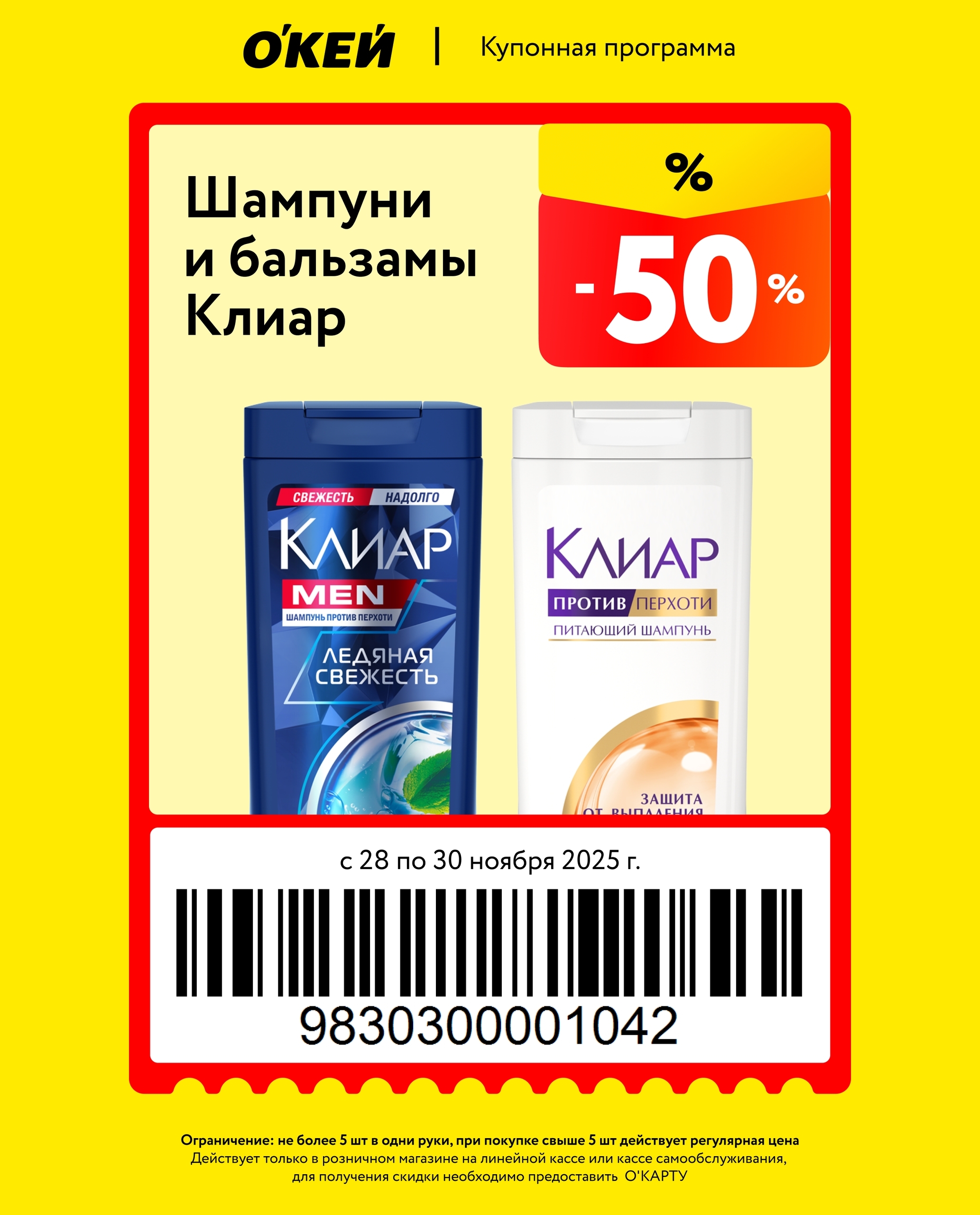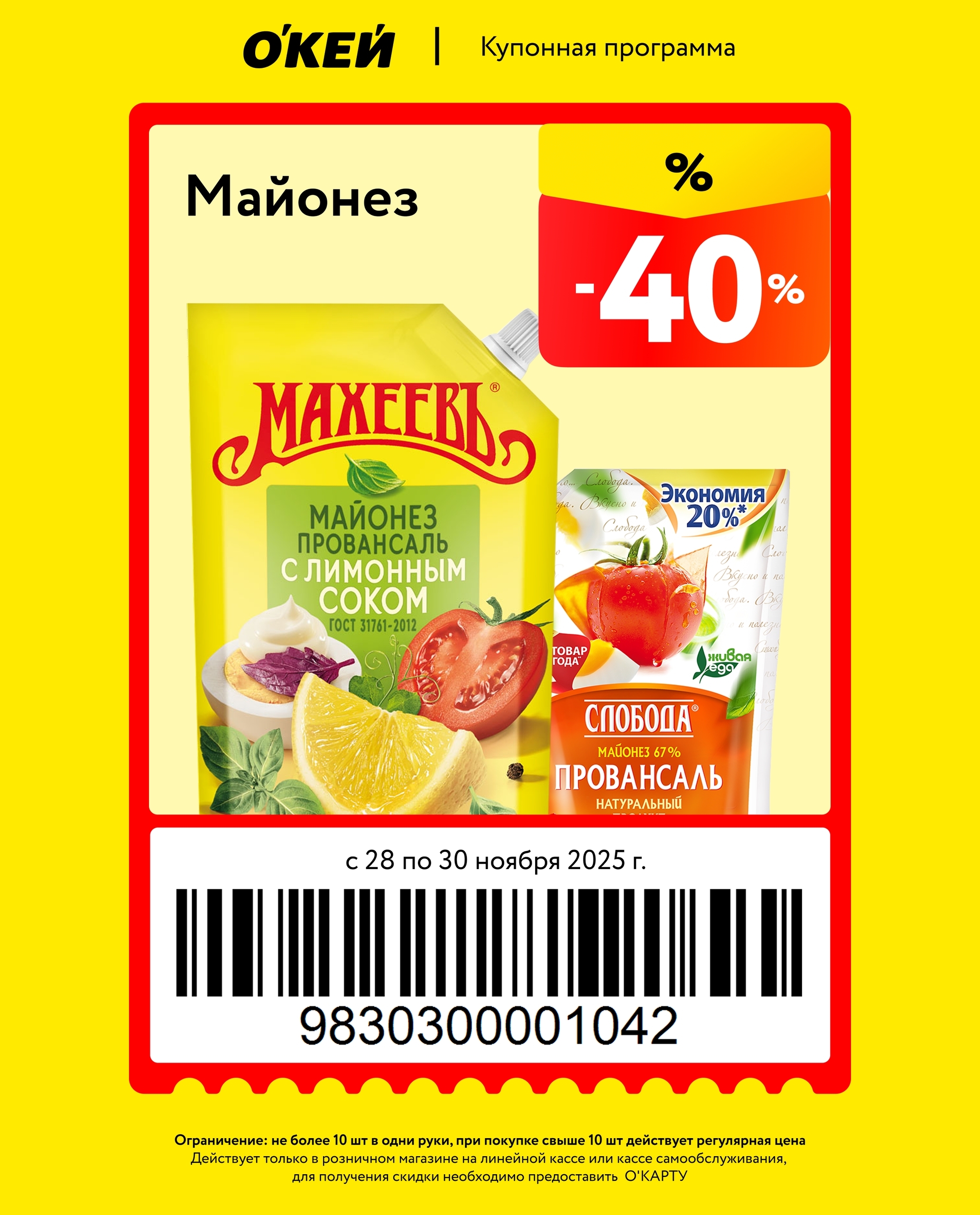 Представлены различные товары, которые предлагаются по выгодным ценам в магазинах Окей по акции с 28 ноября — 30 ноября 2025 года. Наибольшая выгода — майонез (40%), шампуни и бальзамы Клиар (50%), бренд бархатные ручки (40%). Купонная программа действует при предъявлении карты магазина.
