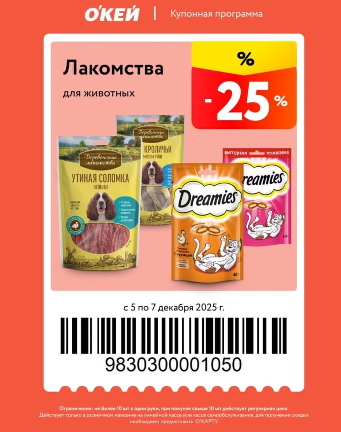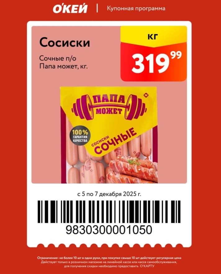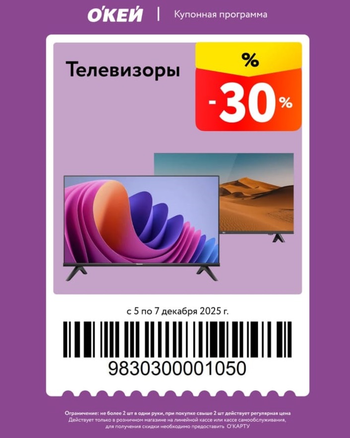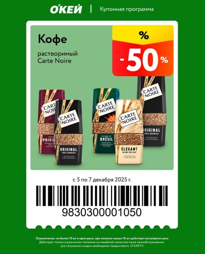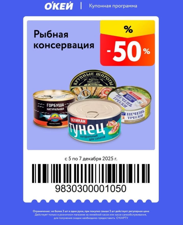 Представлены различные товары, которые предлагаются по выгодным ценам в магазинах Окей по акции с 5 декабря — 7 декабря 2025 года. Наибольшая выгода — рыбные консервы (50%), кофе растворимый Карт Нуар (50%), телевизоры (30%). Купонная программа действует при предъявлении карты магазина.