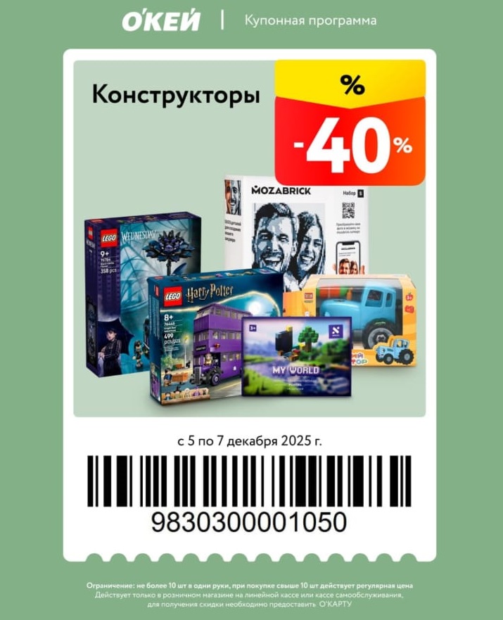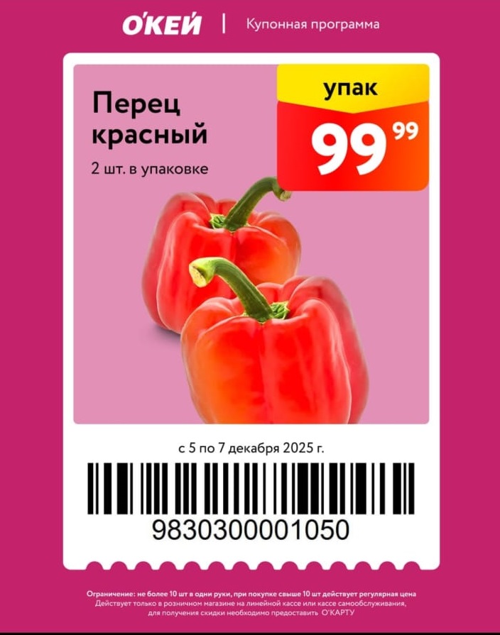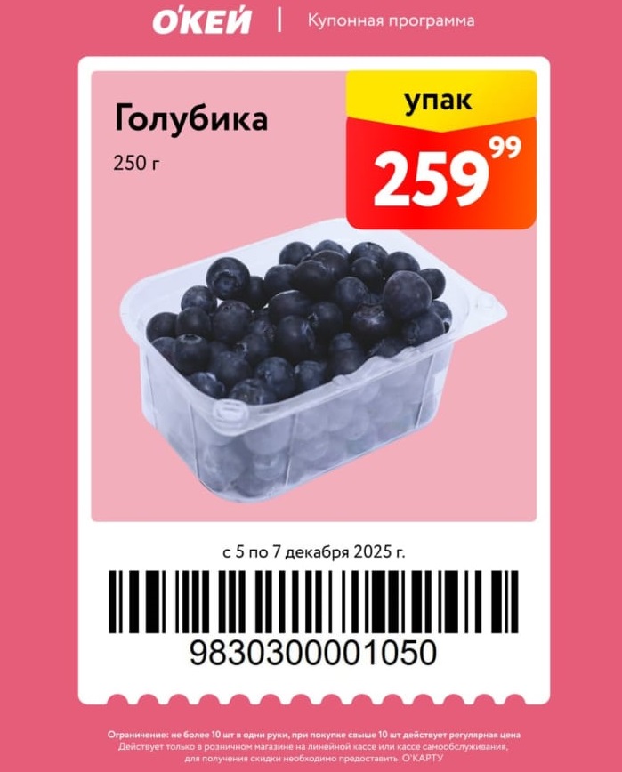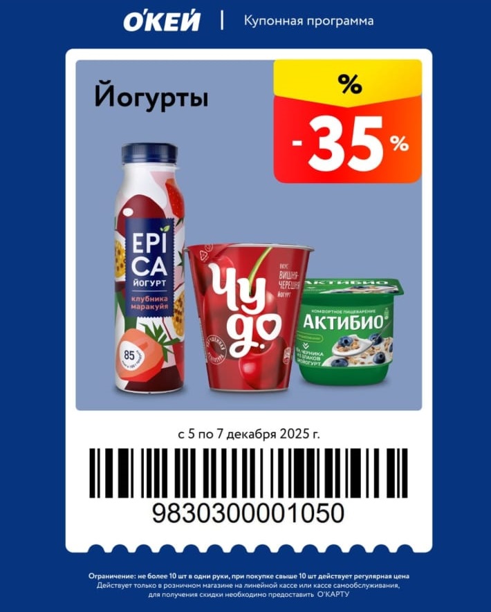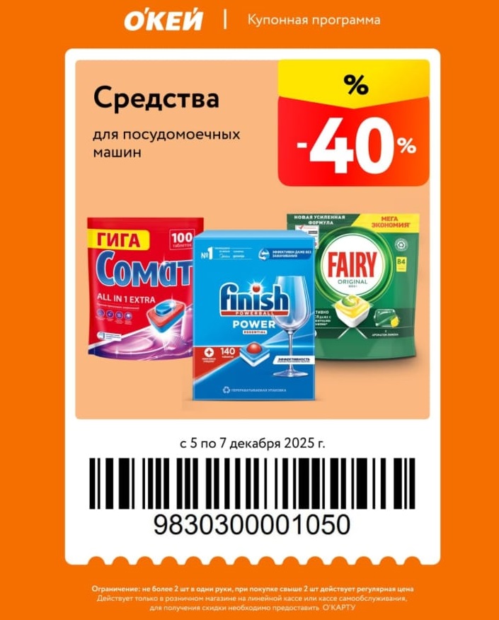 Представлены различные товары, которые предлагаются по выгодным ценам в магазинах Окей по акции с 5 декабря — 7 декабря 2025 года. Наибольшая выгода — рыбные консервы (50%), кофе растворимый Карт Нуар (50%), телевизоры (30%). Купонная программа действует при предъявлении карты магазина.