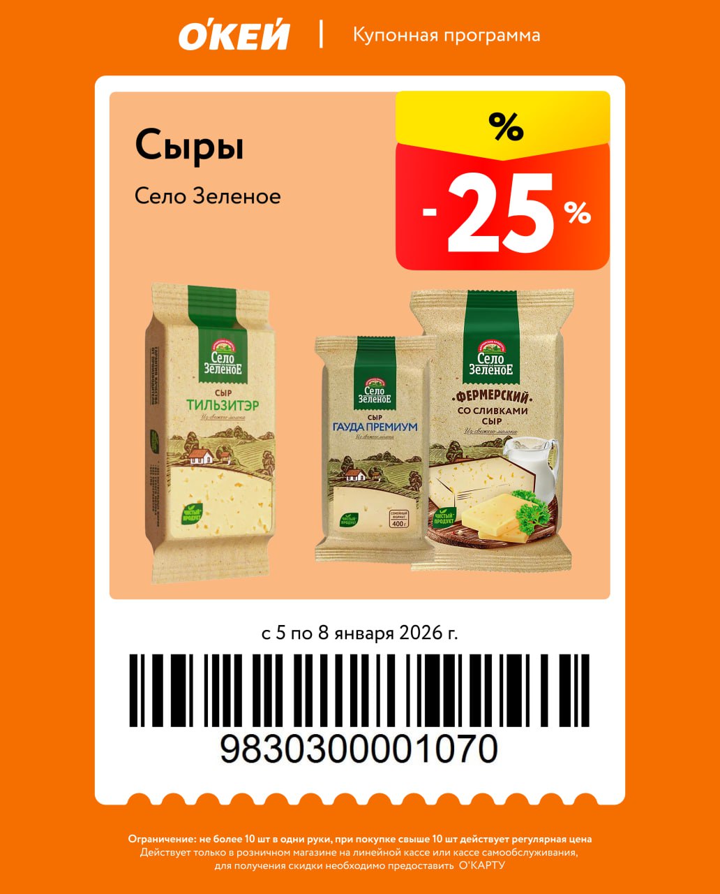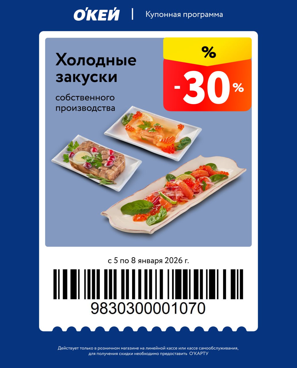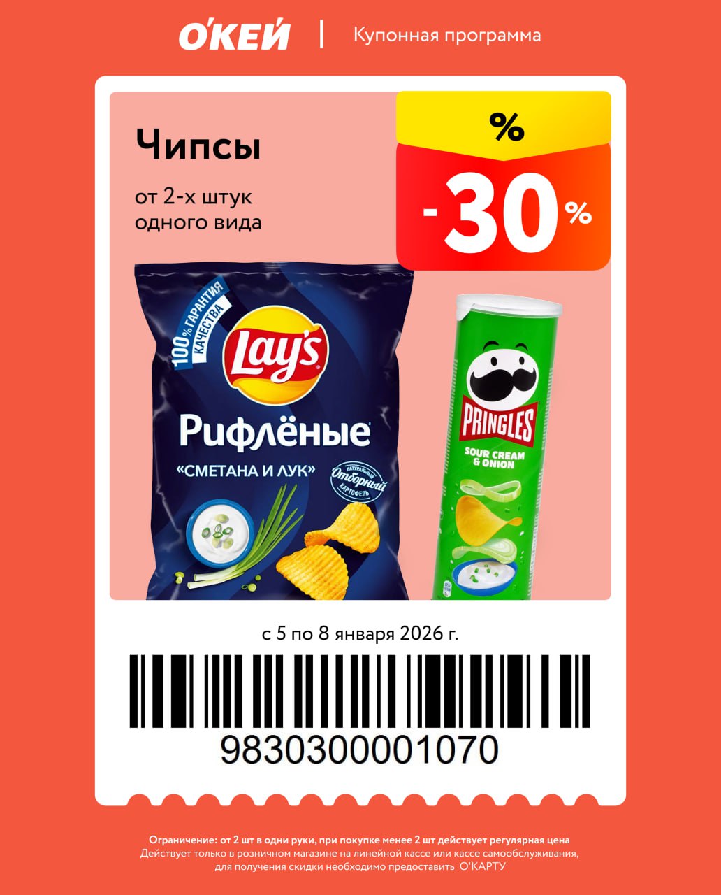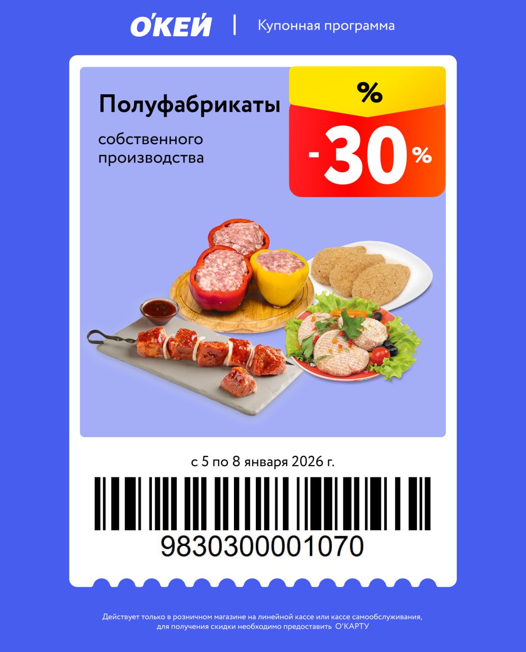 Представлены различные товары, которые предлагаются по выгодным ценам в магазинах Окей по акции с 5 января — 8 января 2026 года. Наибольшая выгода — пиво (50%), полуфабрикаты (30%), чипсы (30%). Купонная программа действует при предъявлении карты магазина.