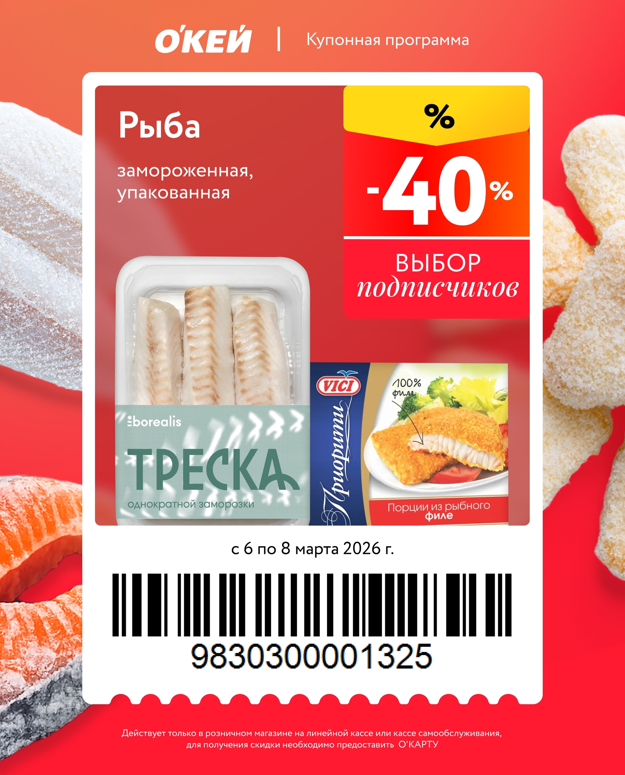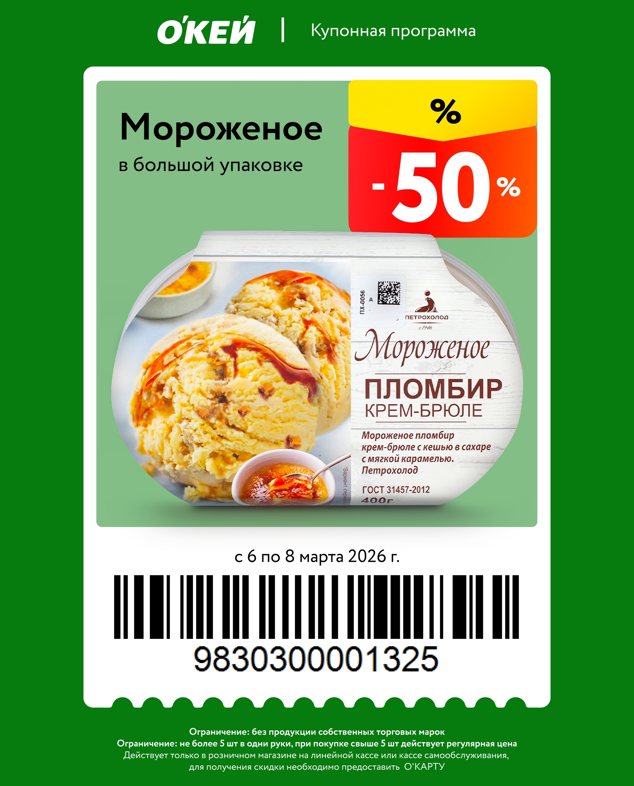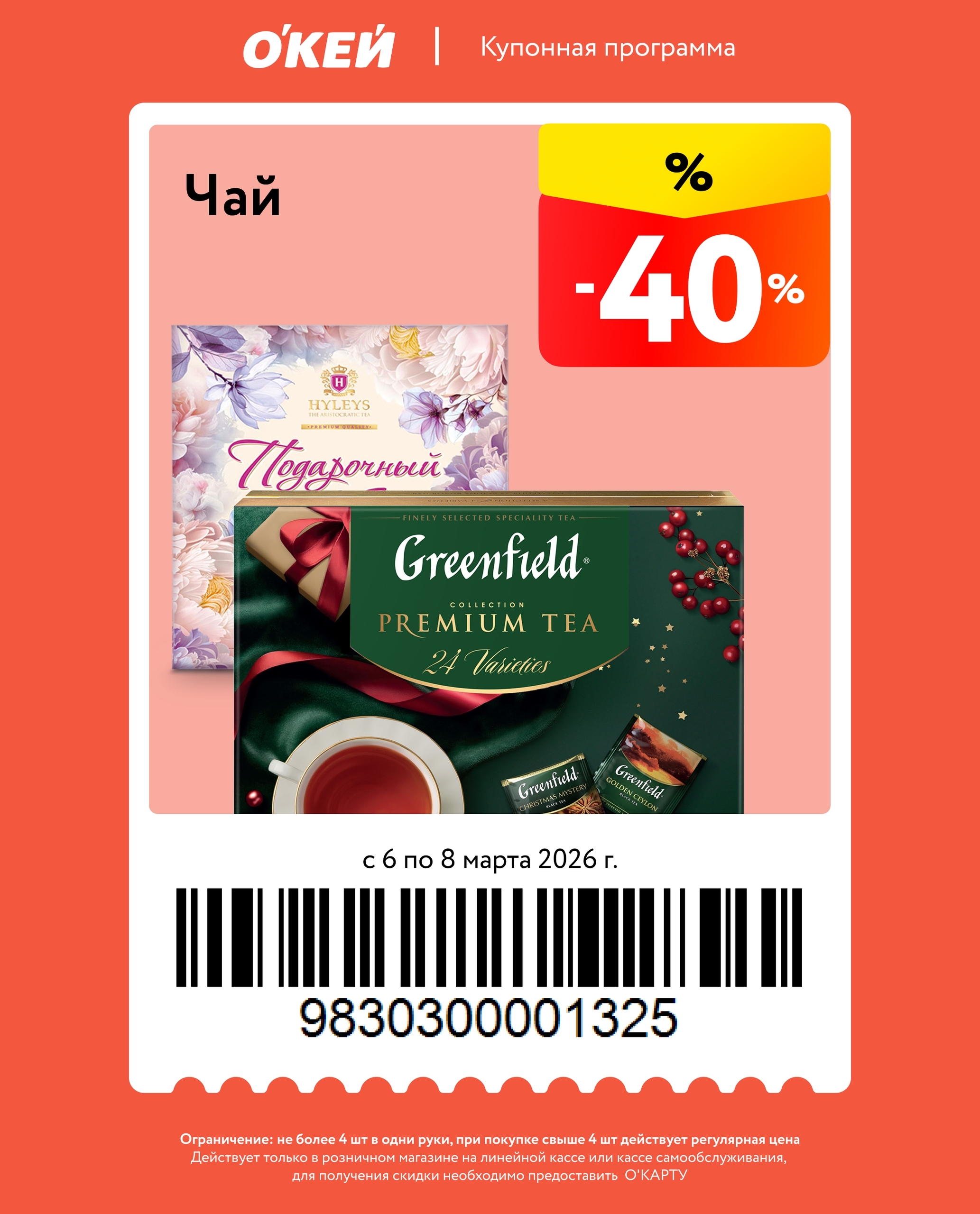 Представлены различные товары, которые предлагаются по выгодным ценам в магазинах Окей по акции с 6 марта — 8 марта 2026 года. Наибольшая выгода — мороженое (50%), техника для кухни (50%), чай (40%). Купонная программа действует при предъявлении карты магазина.
