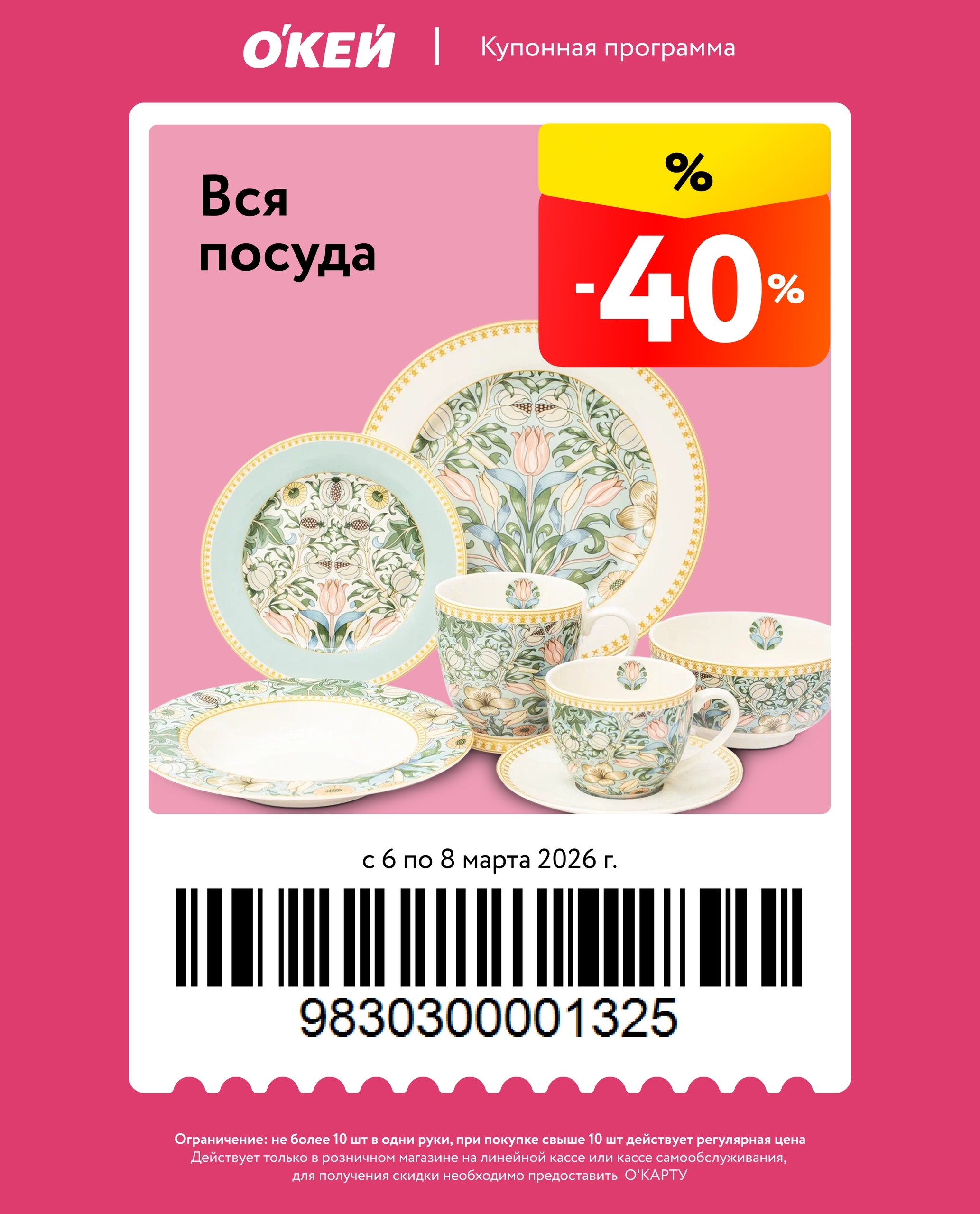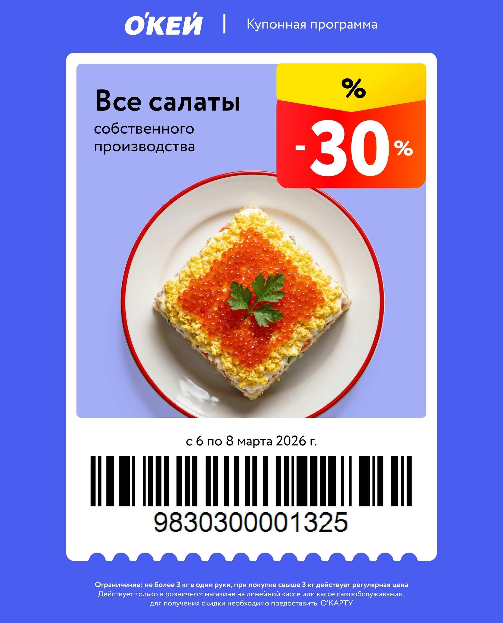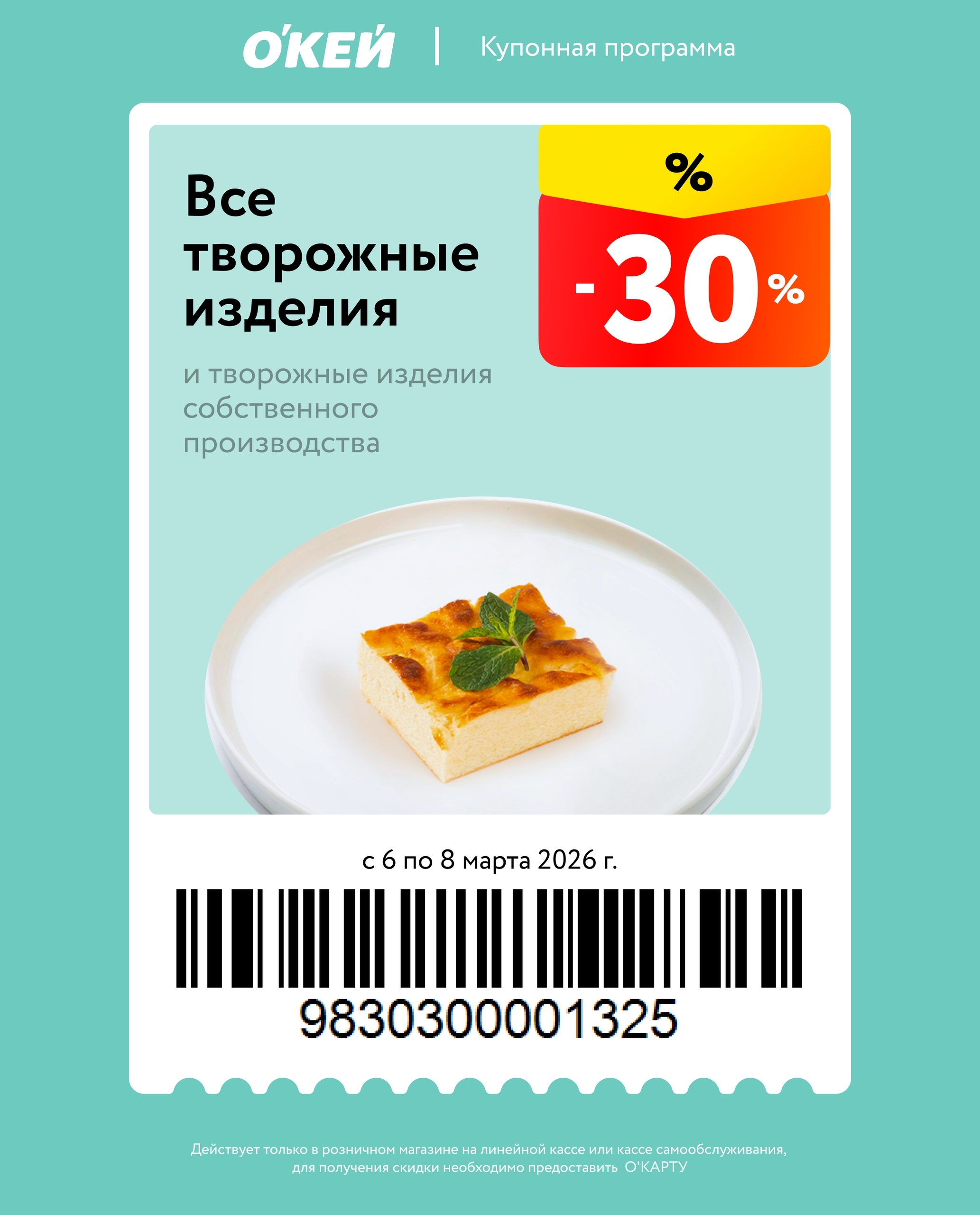 Представлены различные товары, которые предлагаются по выгодным ценам в магазинах Окей по акции с 6 марта — 8 марта 2026 года. Наибольшая выгода — мороженое (50%), техника для кухни (50%), чай (40%). Купонная программа действует при предъявлении карты магазина.