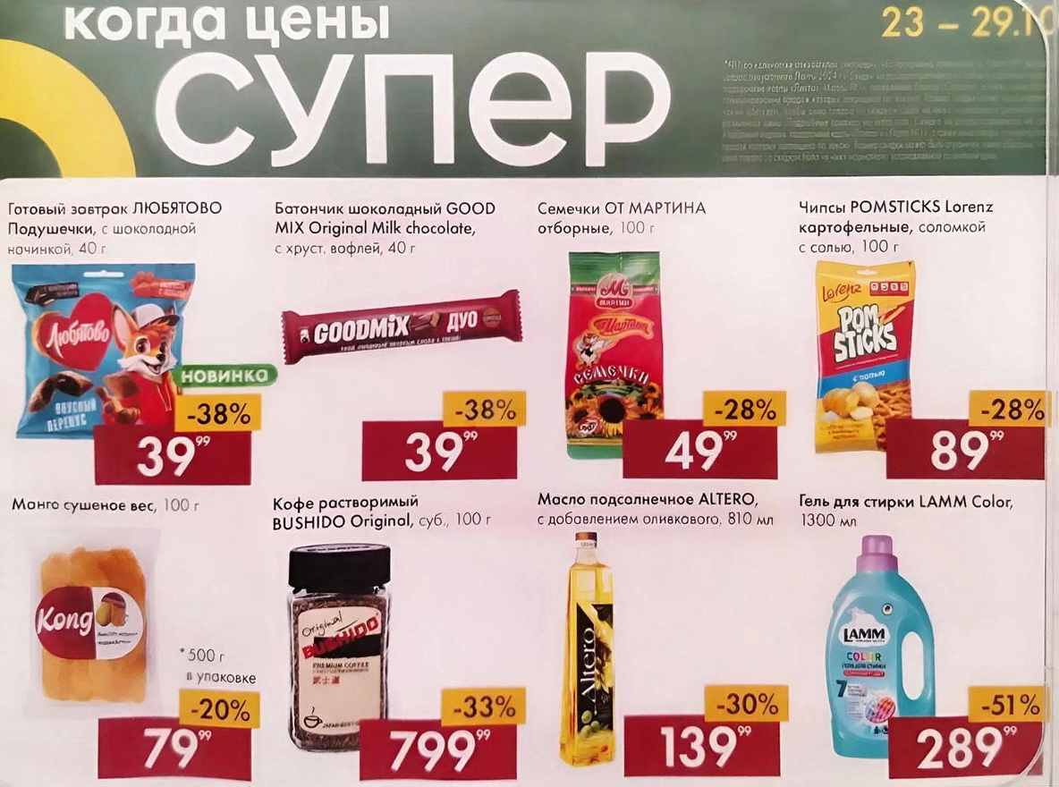 Выгодные предложения на готовый завтрак Любятово, семечки от Мартина, кофе Бушидо, манго сушеное. Скидки на шоколадный батончик, масло подсолнечное, гель для стирки. Акция по Карте №1