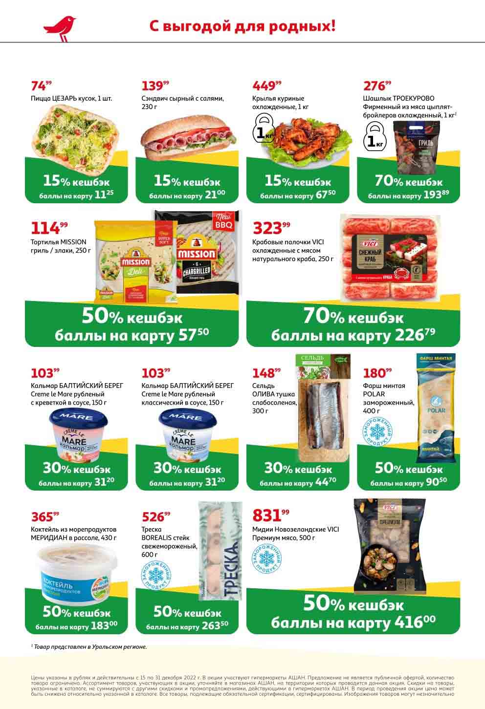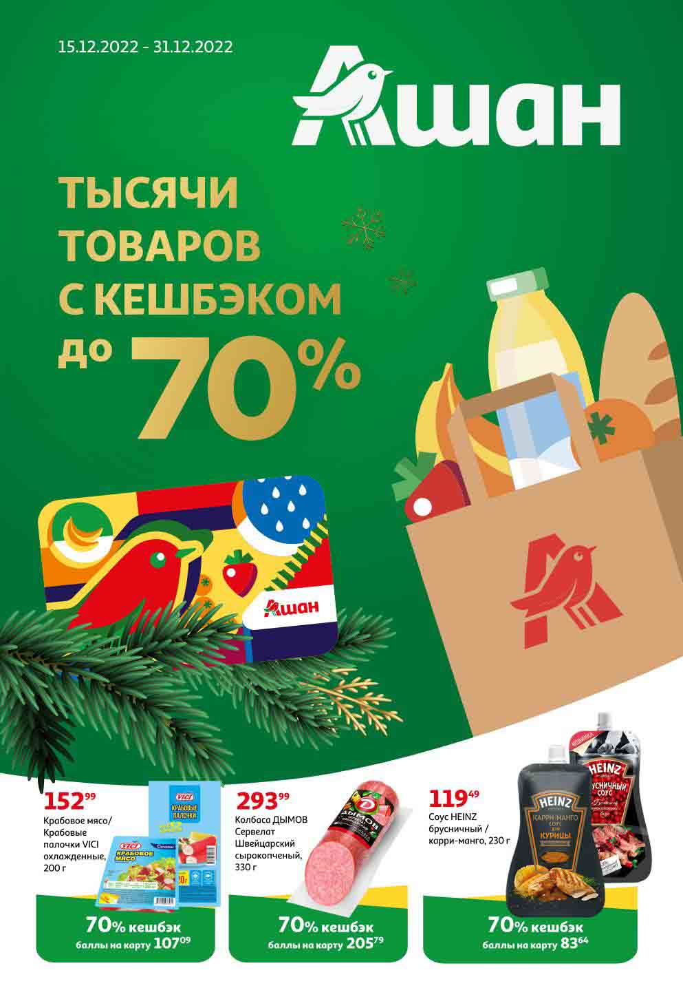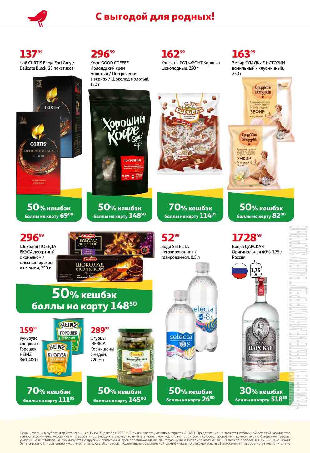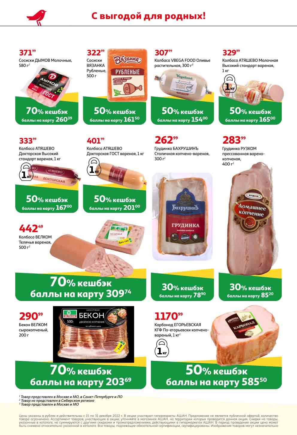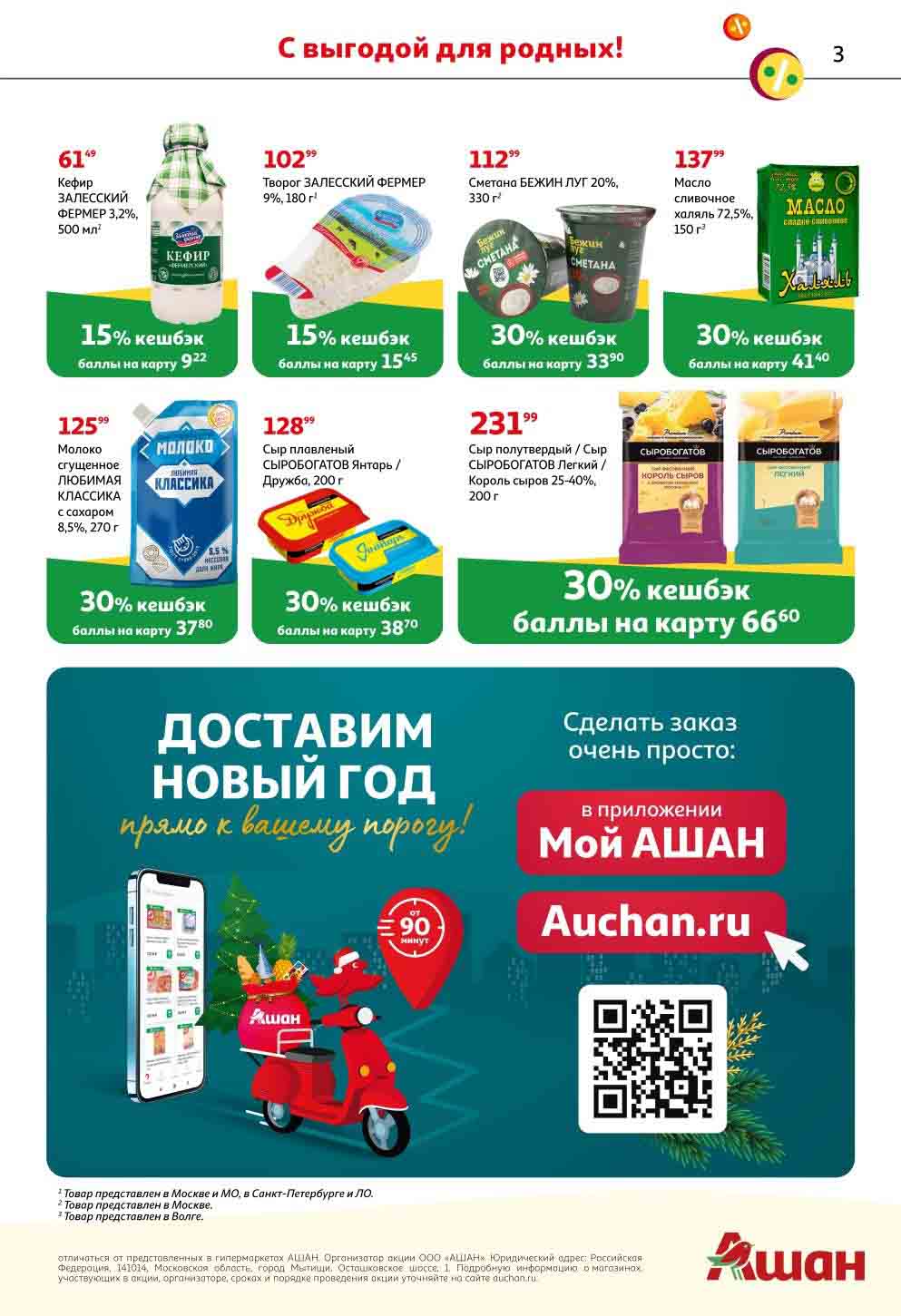 На страницах каталога Ашан вы найдете все свои любимые продукты, которые сейчас предлагаются в супермаркете. Не пропустите последние специальные предложения и сэкономьте на покупках. Предложение действительно при наличии товара на прилавках. Скидки на товары, указанные в каталоге, не суммируются с другими скидками. Изображения товаров могут незначительно отличаться от представленных на полках. Цены по акции Ашан действуют в городах: Москва. Балашиха. Химки. Подольск. Королев. Мытищи. Люберцы. Электросталь. Коломна. Одинцово. Железнодорожный, Серпухов, Орехово-Зуево. Красногорск, Щелково, Сергиев Посад, Пушкино. Жуковский, Ногинск, Раменское и многих других населенных пунктах Московского региона.