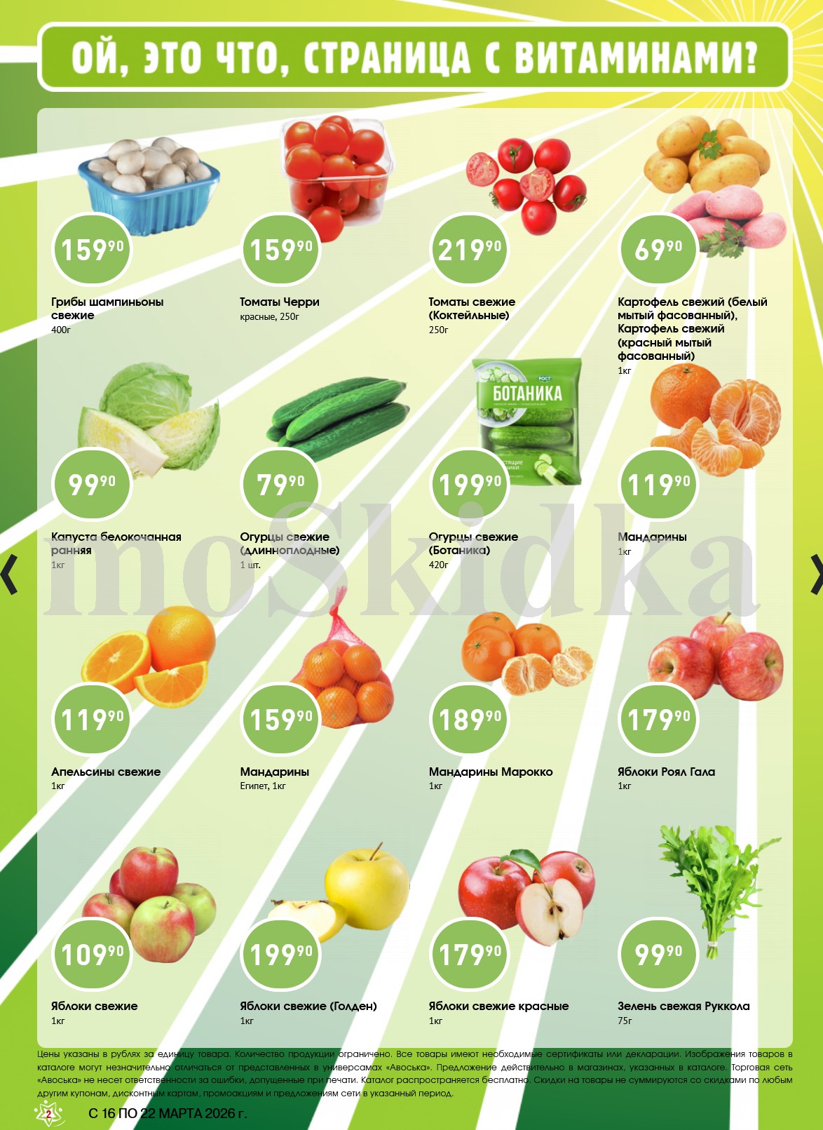 Магазин Авоська акции с 16 марта — 22 марта 2026. Каталог Фрукты и овощи Дополнительные акции магазина:Каталог Авоська 10.03-23.03.2026Авоська 16.02-11.04.2026 "Великий Пост"Авоська 19.01-31.05.2026 "Весенний сад" Пожалуйста, оставьте это поле пустым.Подпишитесь на уведомления о новых каталогах этого магазина Проверьте ваш почтовый ящик, чтобы подтвердить свою подписку. 0 0 голоса Рейтинг акции