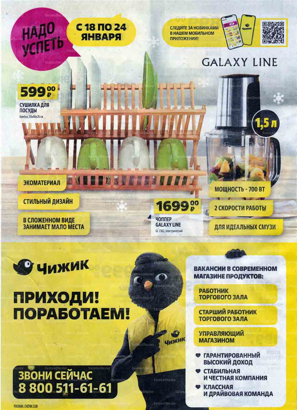 На страницах каталога Чижик вы найдете все свои любимые товары, которые сейчас предлагаются в супермаркете. Не пропустите последние специальные предложения и сэкономьте на покупках. Предложение ограниченно и действует в указанные сроки и пока товар есть в наличии. Внешний вид товара может отличаться от представленных изображений. Подробности об правилах и скидках узнавайте в магазинах сети. Цены по акции Чижик действуют в городах: Москва, Балашиха, Химки, Подольск, Королев, Мытищи, Люберцы, Электросталь, Коломна, Одинцово, Железнодорожный, Серпухов, Орехово-Зуево, Красногорск, Щелково, Сергиев Посад, Пушкино, Жуковский, Ногинск, Раменское, Клин, Воскресенск, Домодедово и многих других населенных пунктах Московского региона.