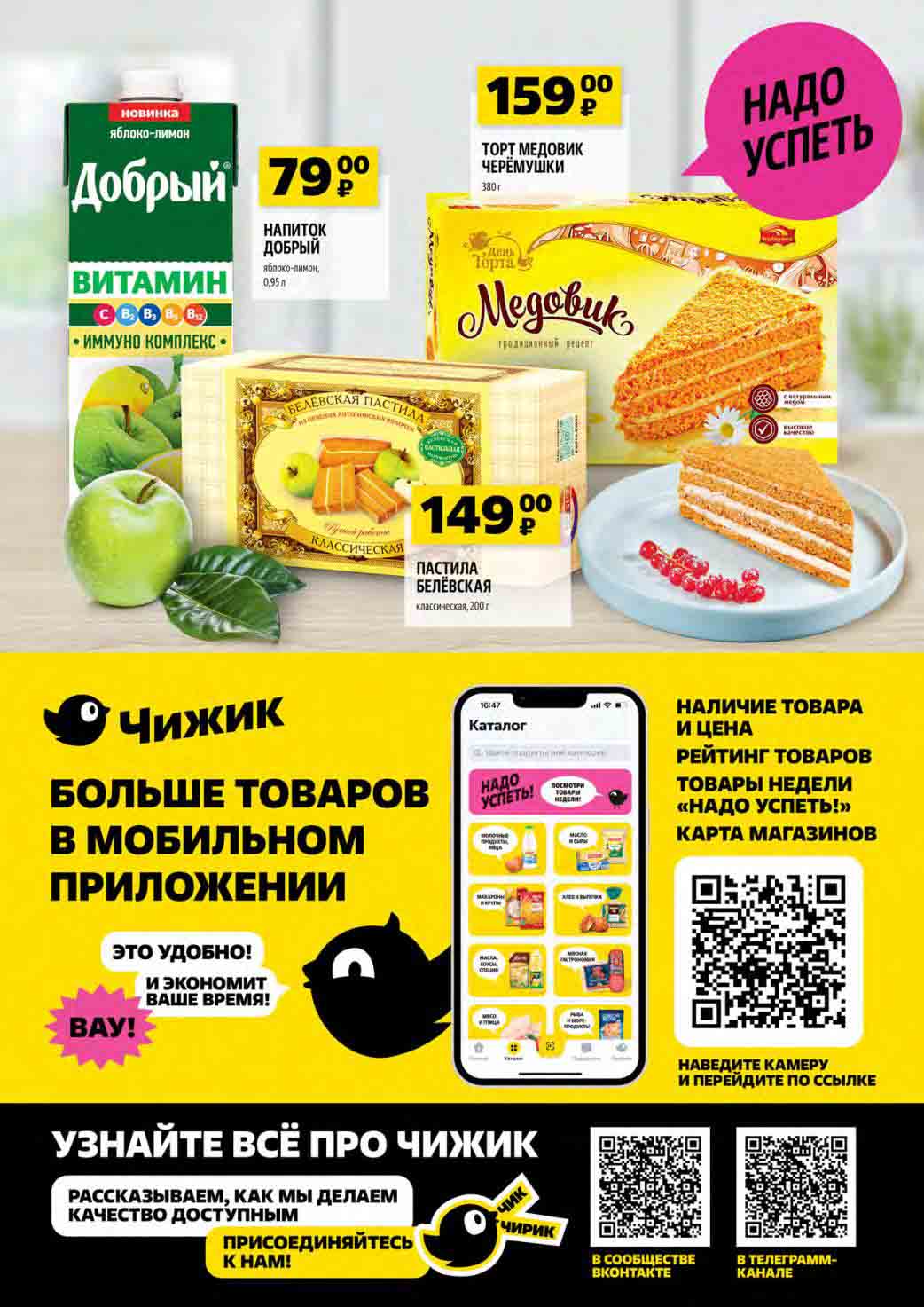 На страницах каталога Чижик вы найдете все свои любимые товары, которые сейчас предлагаются в супермаркете. Не пропустите последние специальные предложения и сэкономьте на покупках. Предложение ограниченно и действует в указанные сроки и пока товар есть в наличии. Внешний вид товара может отличаться от представленных изображений. Подробности об правилах и скидках узнавайте в магазинах сети. Цены по акции Чижик действуют в городах: Москва, Балашиха, Химки, Подольск, Королев, Мытищи, Люберцы, Электросталь, Коломна, Одинцово, Железнодорожный, Серпухов, Орехово-Зуево, Красногорск, Щелково, Сергиев Посад, Пушкино, Жуковский, Ногинск, Раменское, Клин, Воскресенск, Домодедово и многих других населенных пунктах Московского региона.