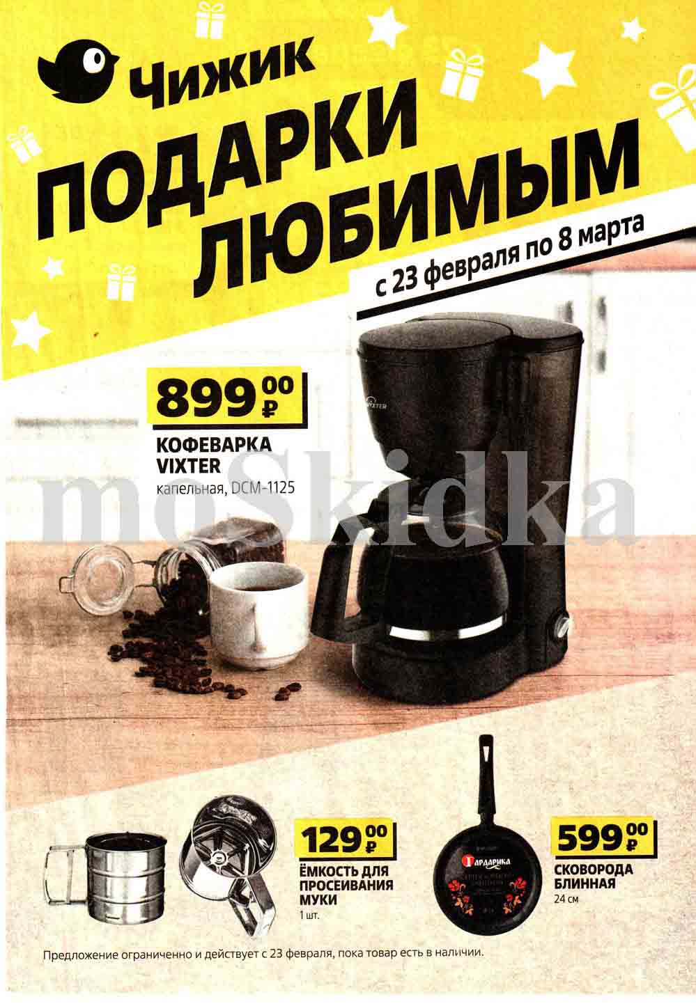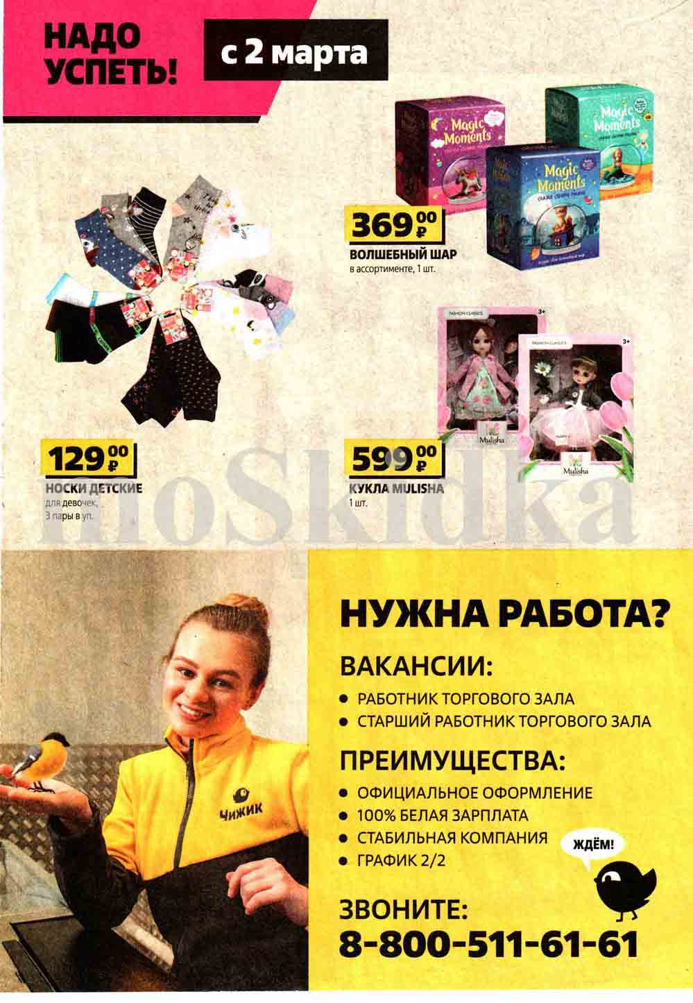 На страницах каталога Чижик вы найдете все свои любимые товары, которые сейчас предлагаются в супермаркете. Не пропустите последние специальные предложения и сэкономьте на покупках. Предложение ограниченно и действует в указанные сроки и пока товар есть в наличии. Внешний вид товара может отличаться от представленных изображений. Подробности об правилах и скидках узнавайте в магазинах сети. Цены по акции Чижик действуют в городах: Москва, Балашиха, Химки, Подольск, Королев, Мытищи, Люберцы, Электросталь, Коломна, Одинцово, Железнодорожный, Серпухов, Орехово-Зуево, Красногорск, Щелково, Сергиев Посад, Пушкино, Жуковский, Ногинск, Раменское, Клин, Воскресенск, Домодедово и многих других населенных пунктах Московского региона.