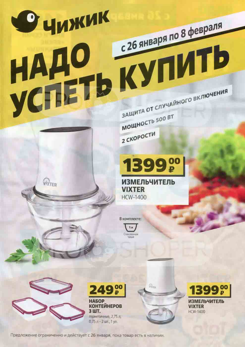 На страницах каталога Чижик вы найдете все свои любимые товары, которые сейчас предлагаются в супермаркете. Не пропустите последние специальные предложения и сэкономьте на покупках. Предложение ограниченно и действует в указанные сроки и пока товар есть в наличии. Внешний вид товара может отличаться от представленных изображений. Подробности об правилах и скидках узнавайте в магазинах сети. Цены по акции Чижик действуют в городах: Москва, Балашиха, Химки, Подольск, Королев, Мытищи, Люберцы, Электросталь, Коломна, Одинцово, Железнодорожный, Серпухов, Орехово-Зуево, Красногорск, Щелково, Сергиев Посад, Пушкино, Жуковский, Ногинск, Раменское, Клин, Воскресенск, Домодедово и многих других населенных пунктах Московского региона.