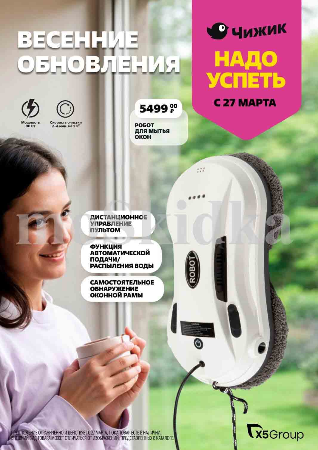 Выгодное предложение в Чижике с 27 марта — паровая швабра 2999₽, робот для мытья окон 5499₽, циклонный пылесос 3999₽. Акция на кухонную утварь, мебель и товары для уборки! Успейте купить по выгодным ценам!