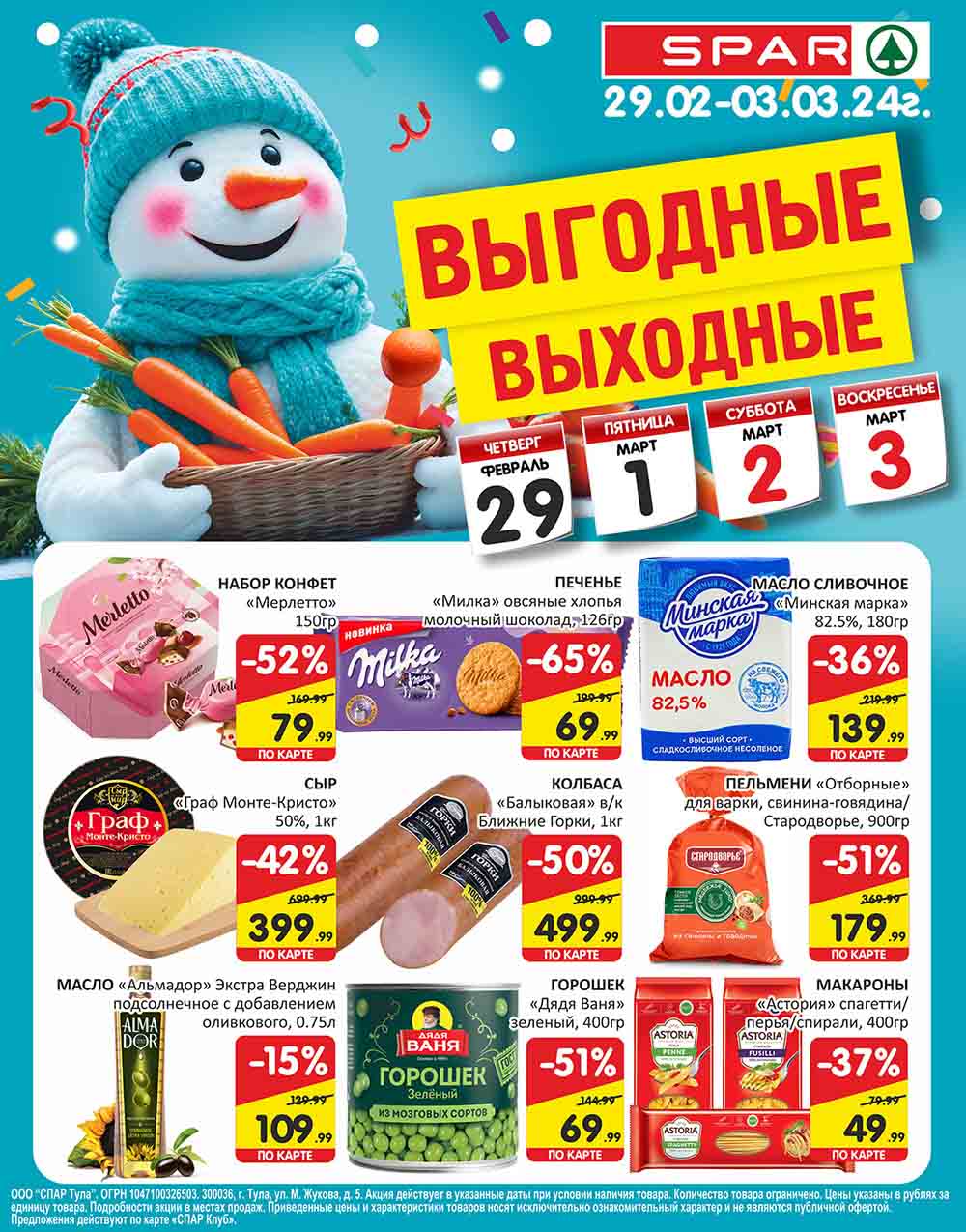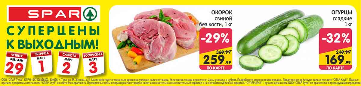 В акционном буклете предложены выгодные цены на различные продукты, такие как свинина за 249.99, картофель по 14.99, молоко за 59.99, колбасы со скидкой 46%, курицу, мандарины, кефир, сметану и многое другое.
